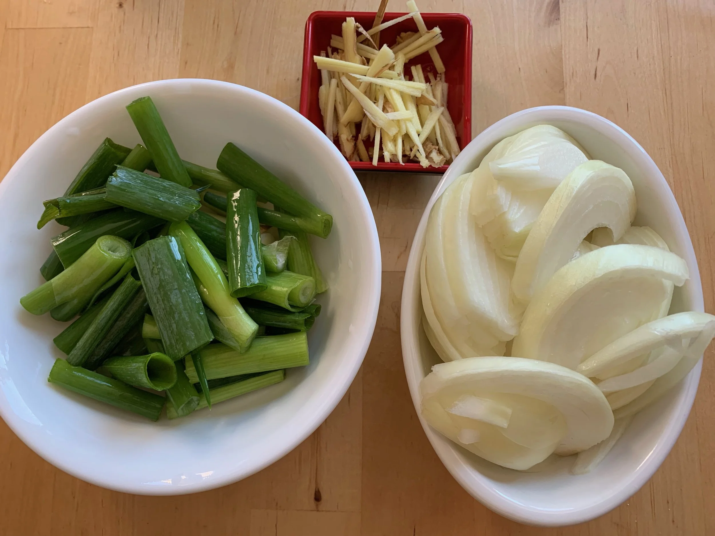 3. While the meat marinates, julienne the ginger, slice the onions to ¼ inch thickness, and chop the scallions into 1-2 inch pieces.