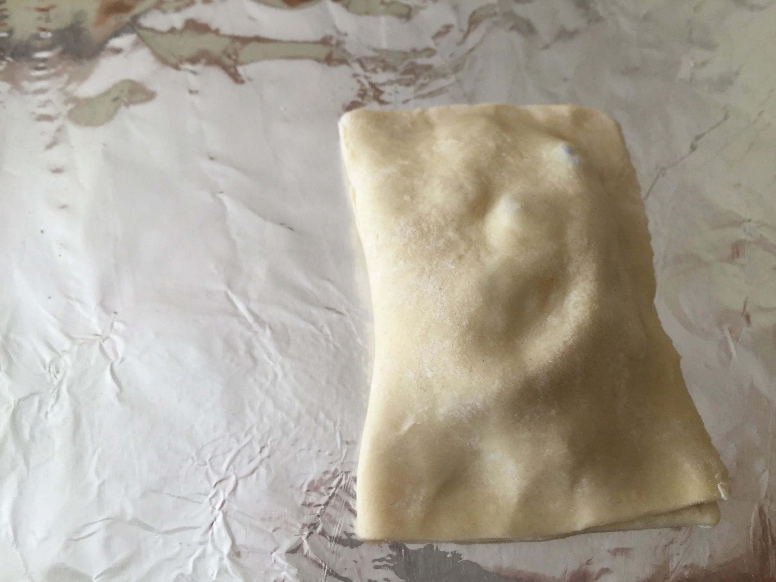 4. Roll the puff pastry to about ¼ in thick, and cut into about 3 in x 4 in rectangles. Place the rectangles on the sheet pan and place 2 tbsp of chilled filling onto each piece of dough, folding each pastry closed. Crimp the pastry with a fork, and dock the top of the pastry so steam can escape.