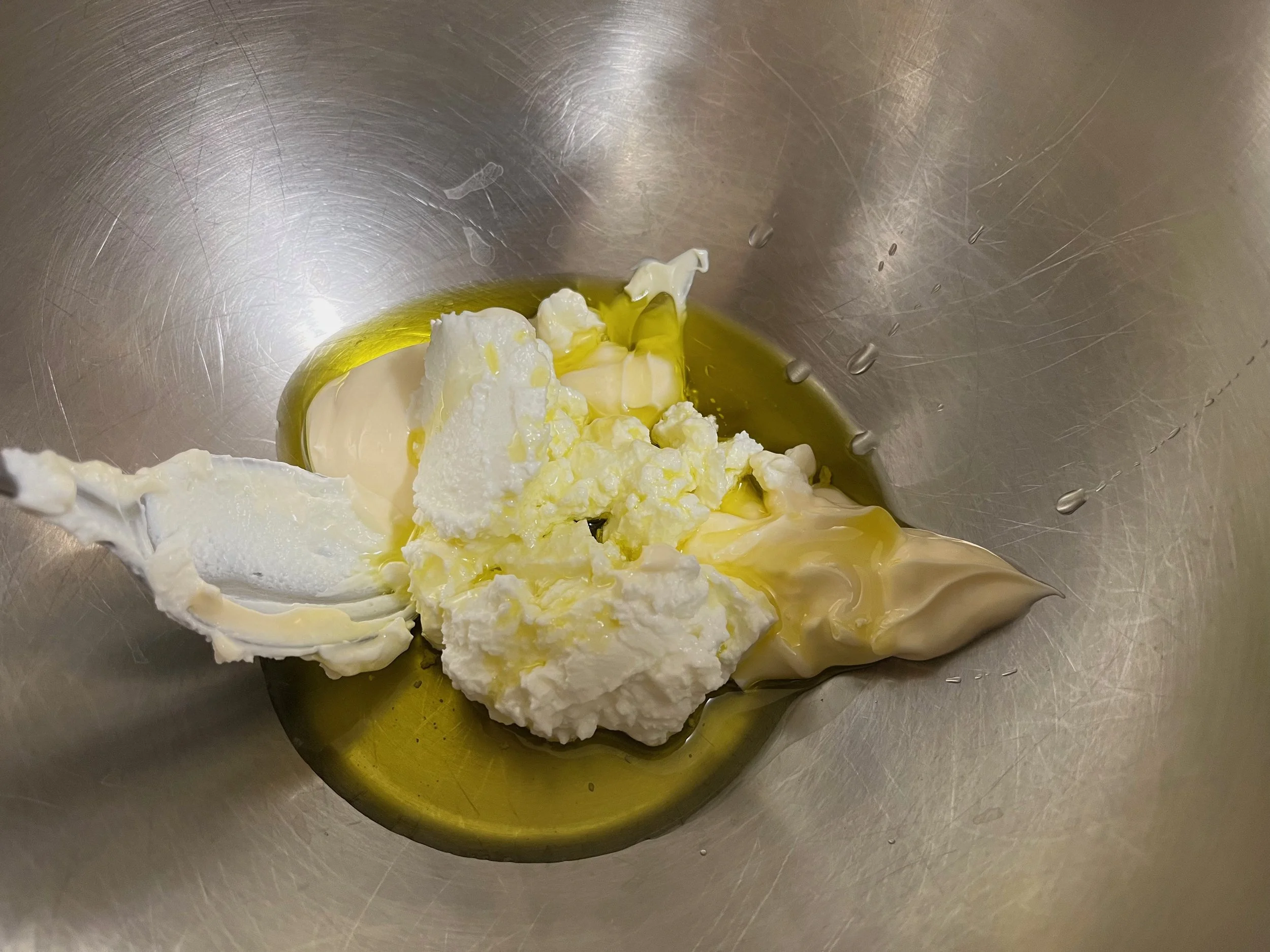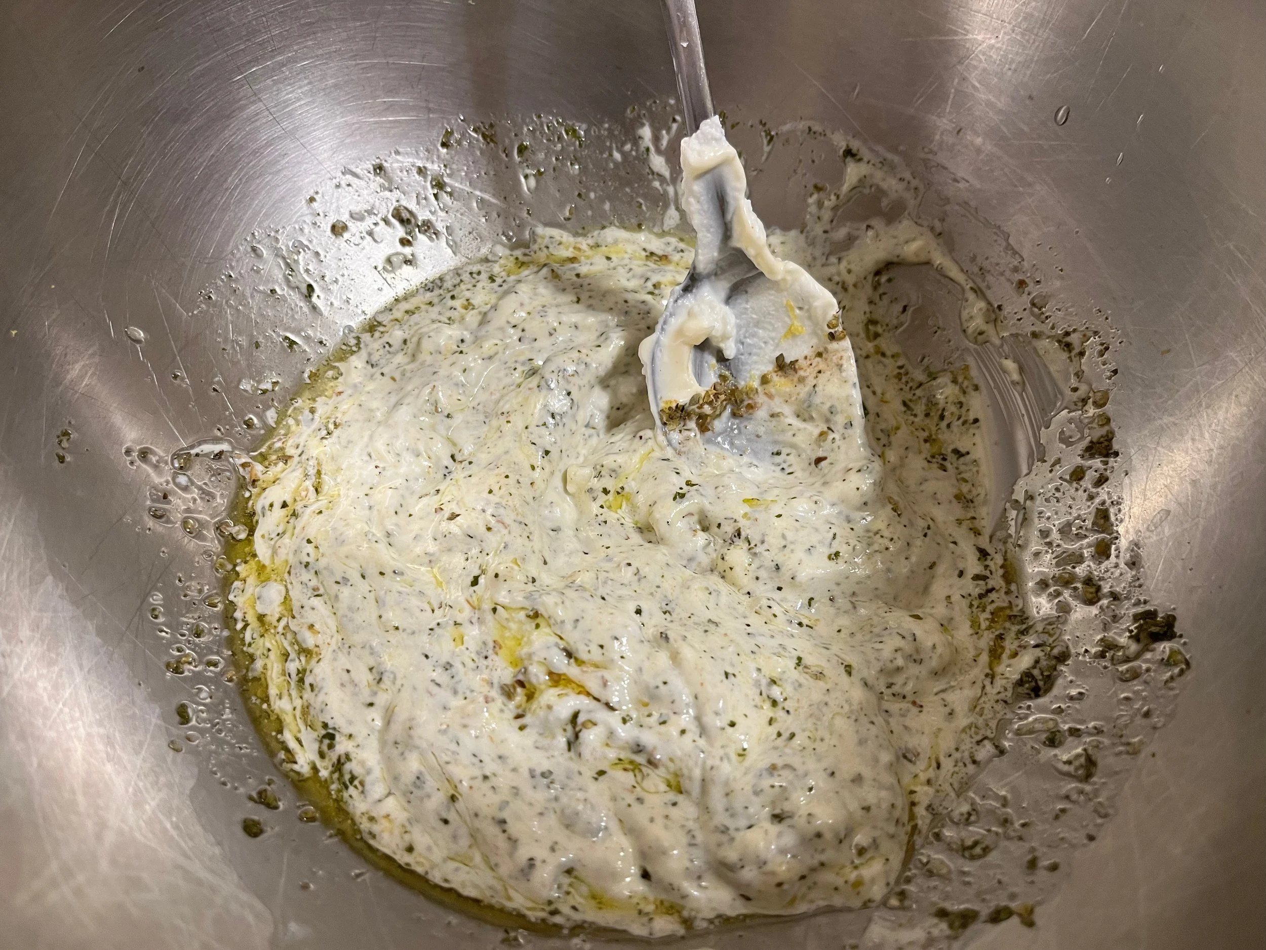We’ll start by making the marinade for the chicken. The chicken will need at least one hour to marinate, but you can also prepare the chicken the night before and marinate it overnight. To make the base of marinade, we will combine ¼ cup plain Greek yogurt with an equal amount of mayonnaise. While both thick and creamy, the yogurt and the mayonnaise serve different roles in this marinade. The lactic acid in the yogurt helps to tenderize the meat, and lends a unique tangy flavor to the chicken. Mayonnaise is a stable oil-water emulsification, and acts to carry fat-soluble flavors in the marinade into the meat. The proteins and fats in mayonnaise also promote quick browning when the meat is cooked, making it ideal when grilling thin and lean cuts like chicken.