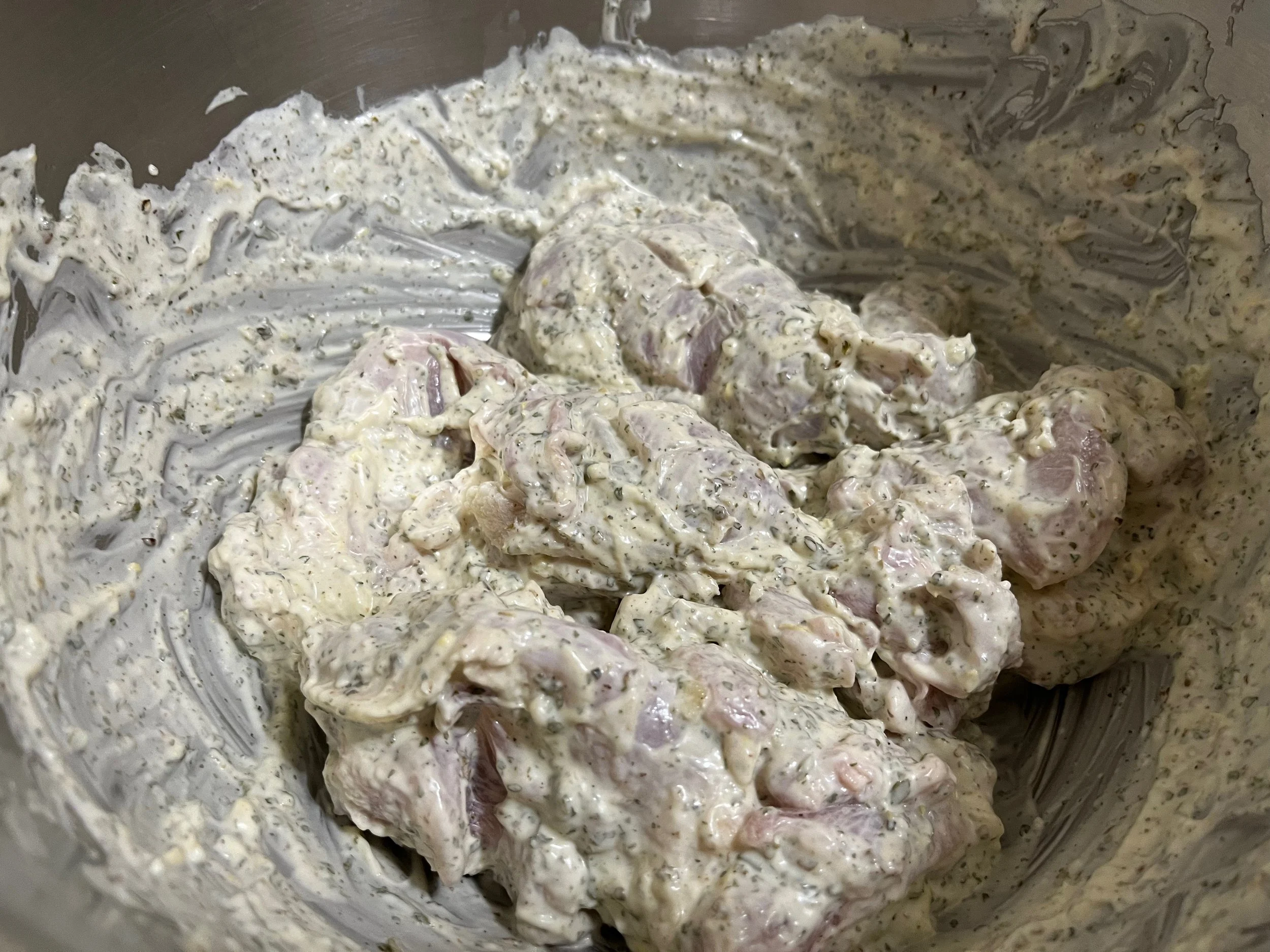 1. To make the marinade, combine the Greek yogurt, mayonnaise, olive oil, minced garlic, the juice of ½ a lemon, dried oregano, dried parsley, ground coriander, 1 tsp salt, and 1 tsp black pepper.
