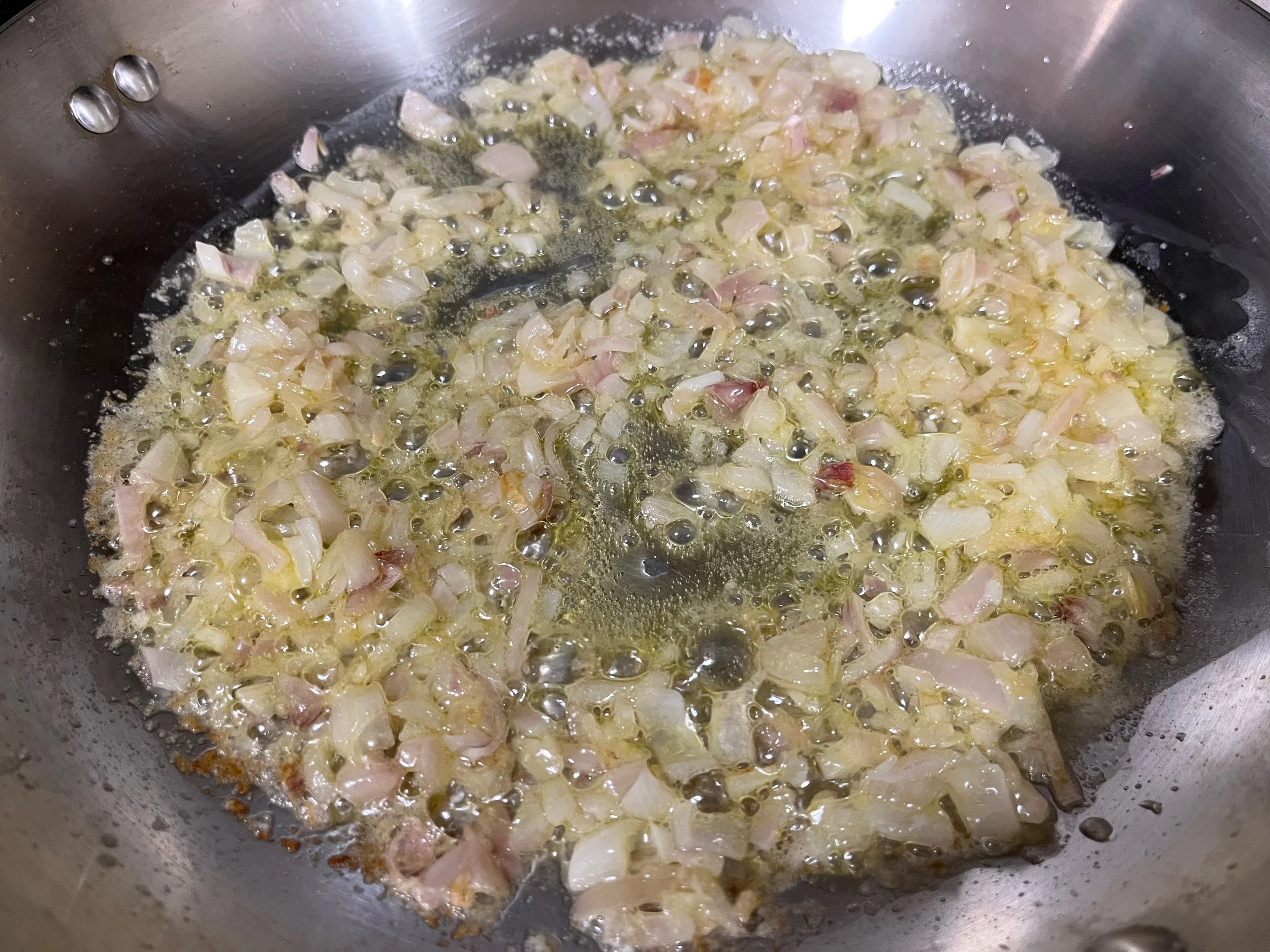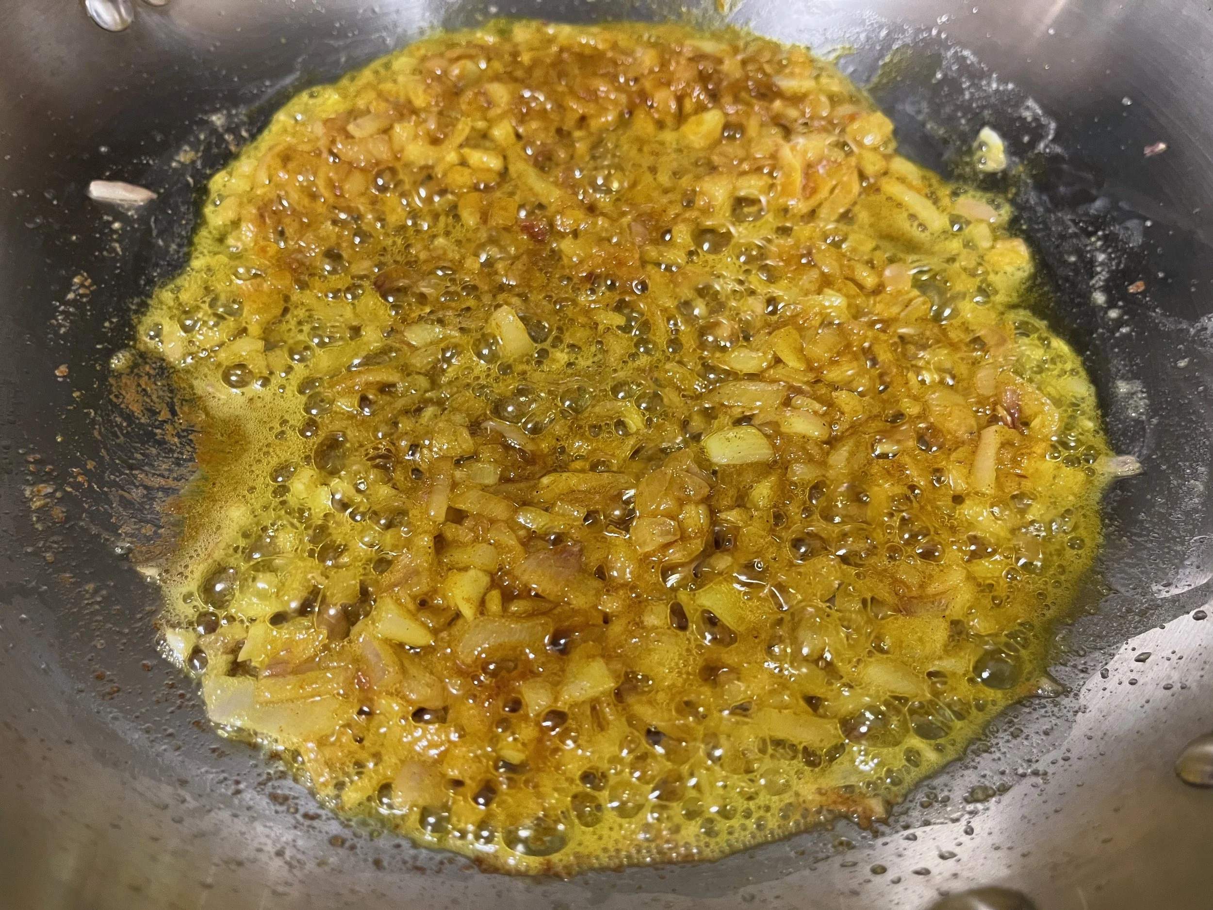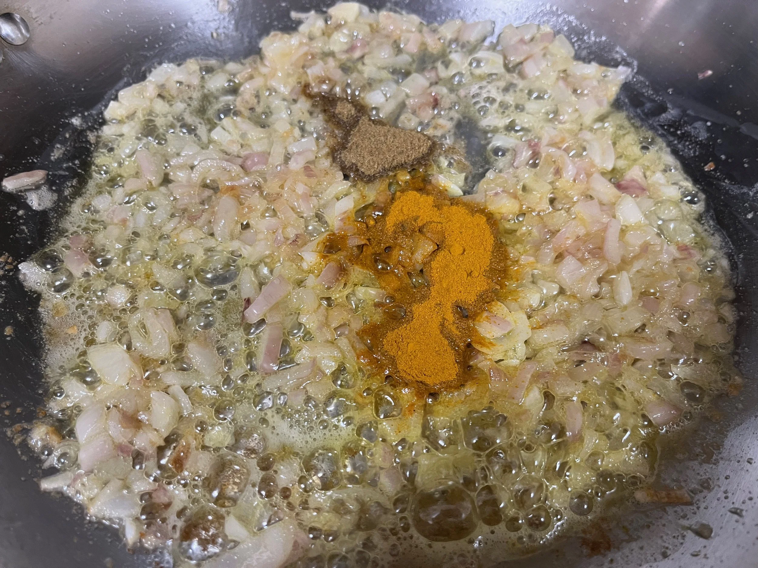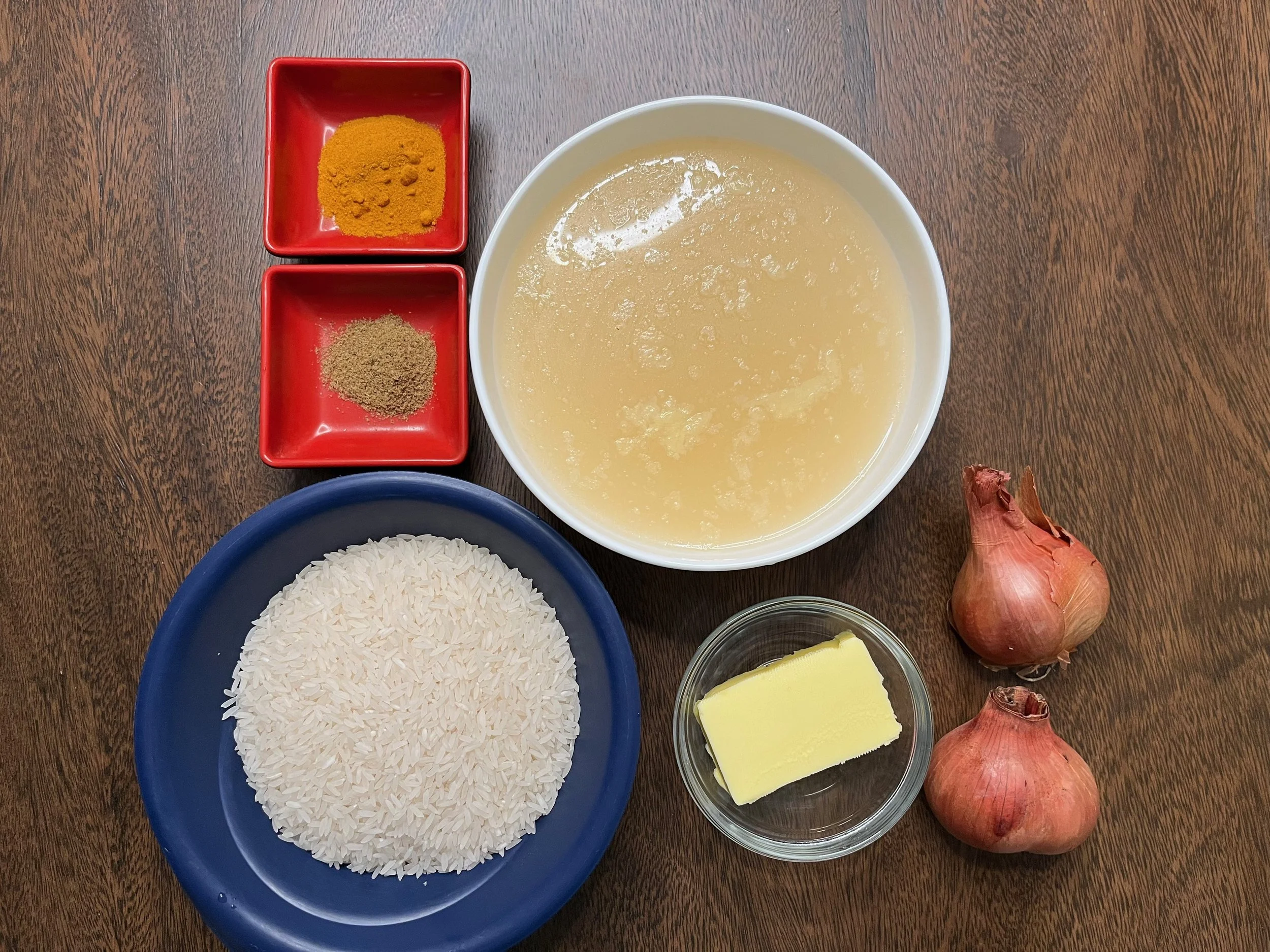 When you are ready to cook, start by preparing the turmeric rice. Begin by melting 2 tablespoons of butter in a pan over medium heat. When the butter has melted, add the diced shallots to the pan. Cook the shallots for about 2-3 minutes, stirring occasionally, until the shallots become soft and translucent. Then add the turmeric and cumin to the pan and stir the spices into the melted butter. Toasting these spices in the hot oil for about 30 seconds will help to extract some of their fat-soluble compounds.