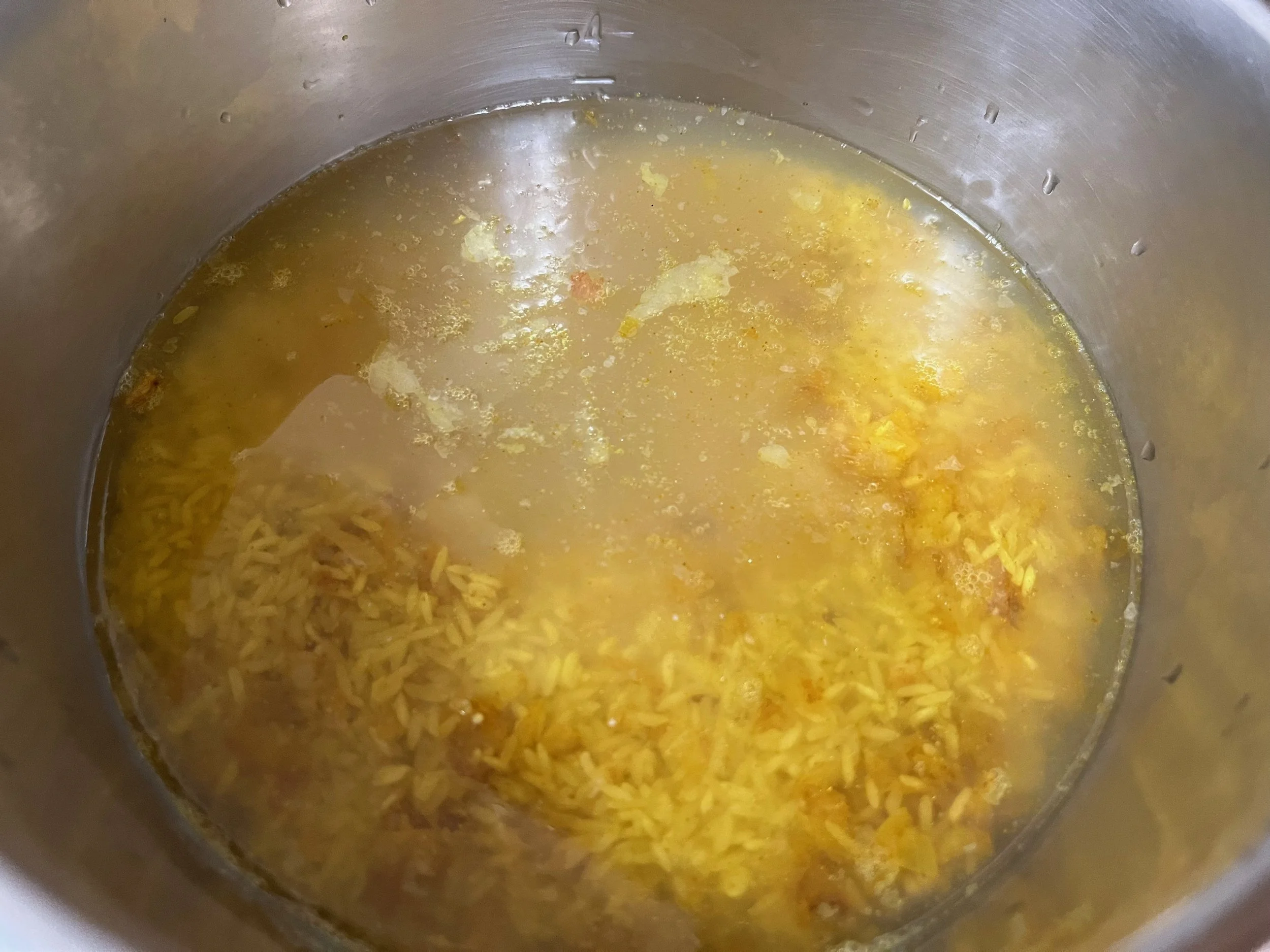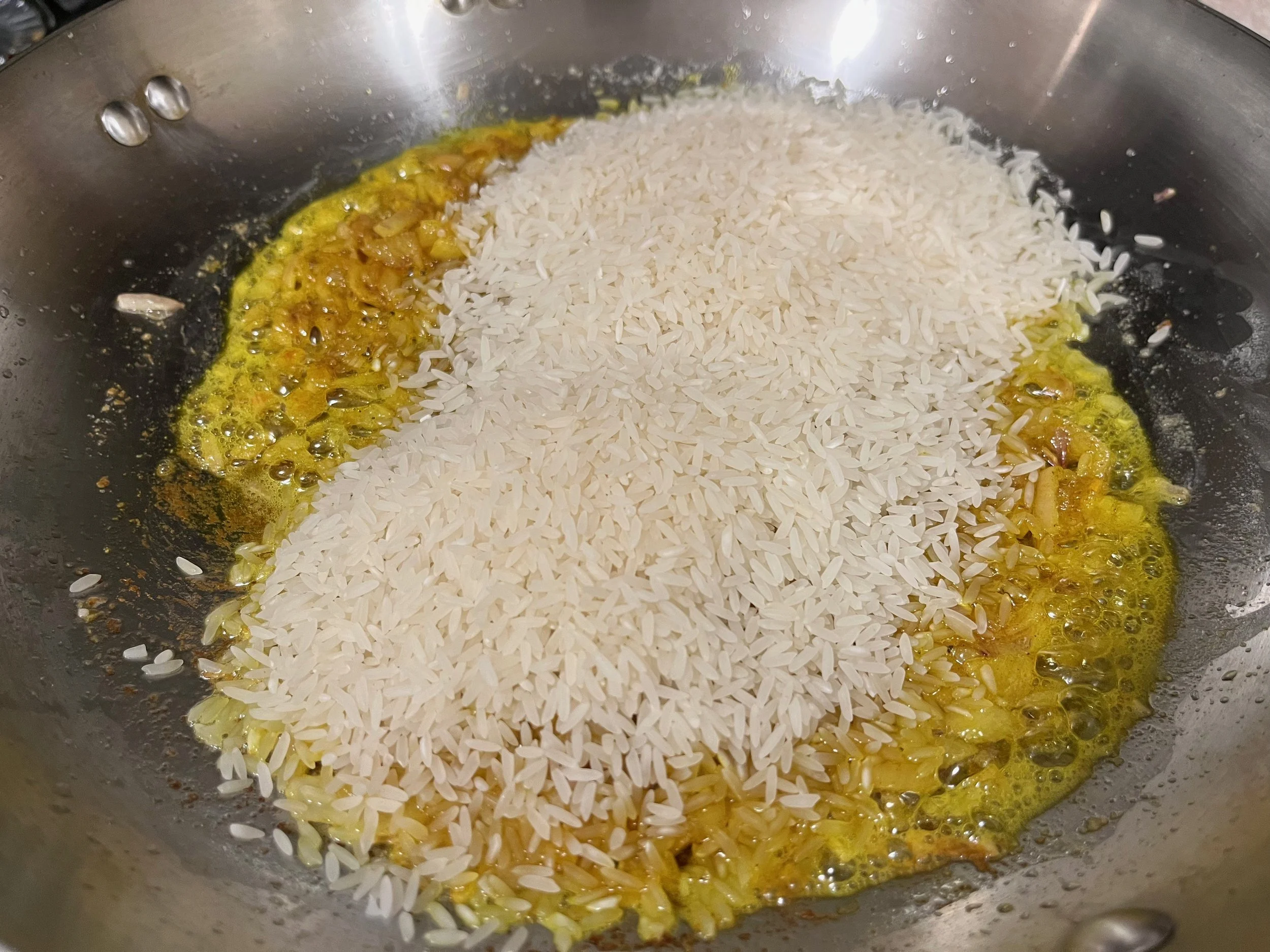 When the spices are fragrant, add the raw rice to the pan. Toast the rice in the pan for about 3 minutes, stirring constantly. We want to coat each grain of rice with a bit of the flavored butter, ensuring the flavors are uniformly distributed and turning the rice a brilliant yellow[2].