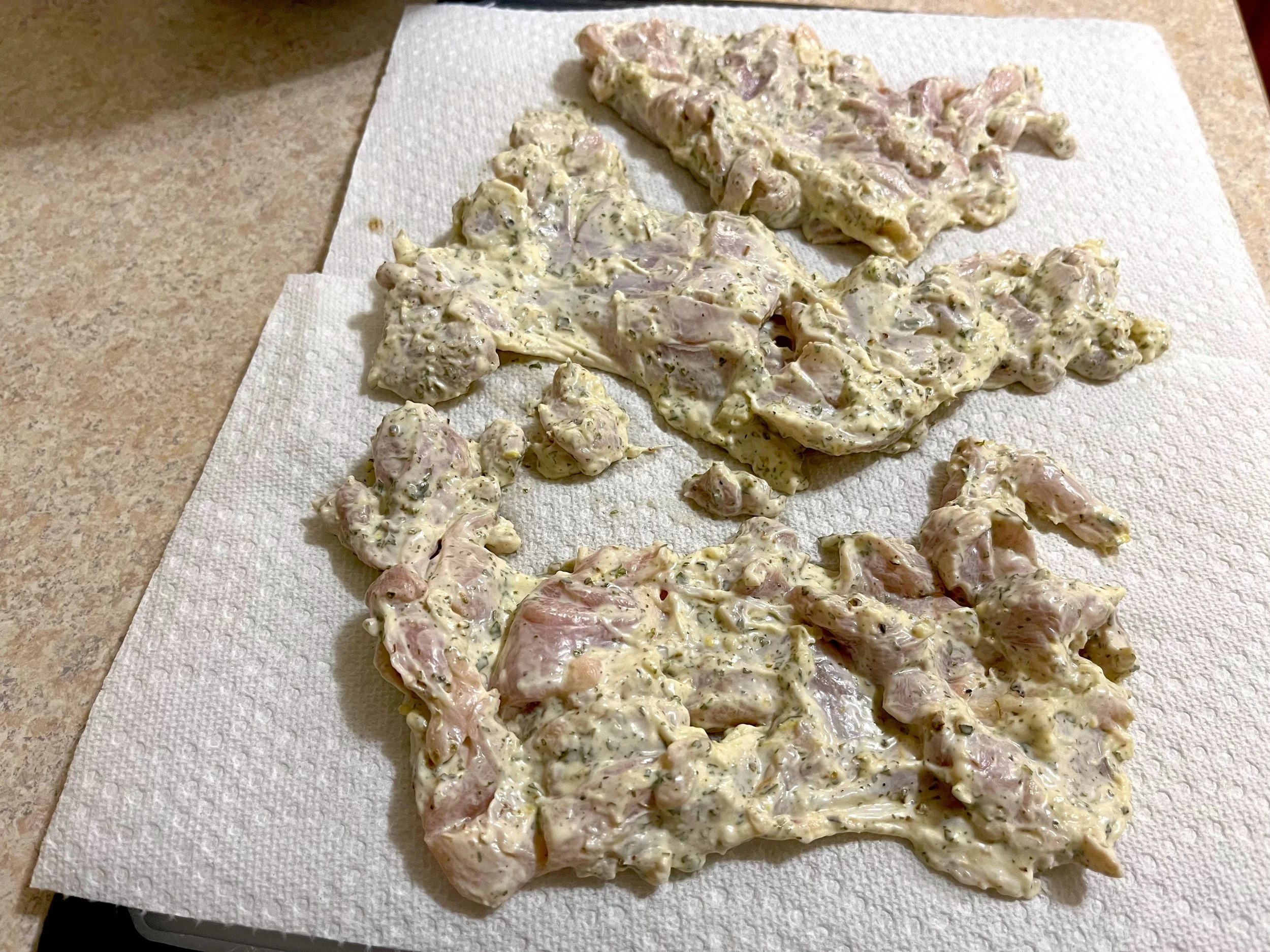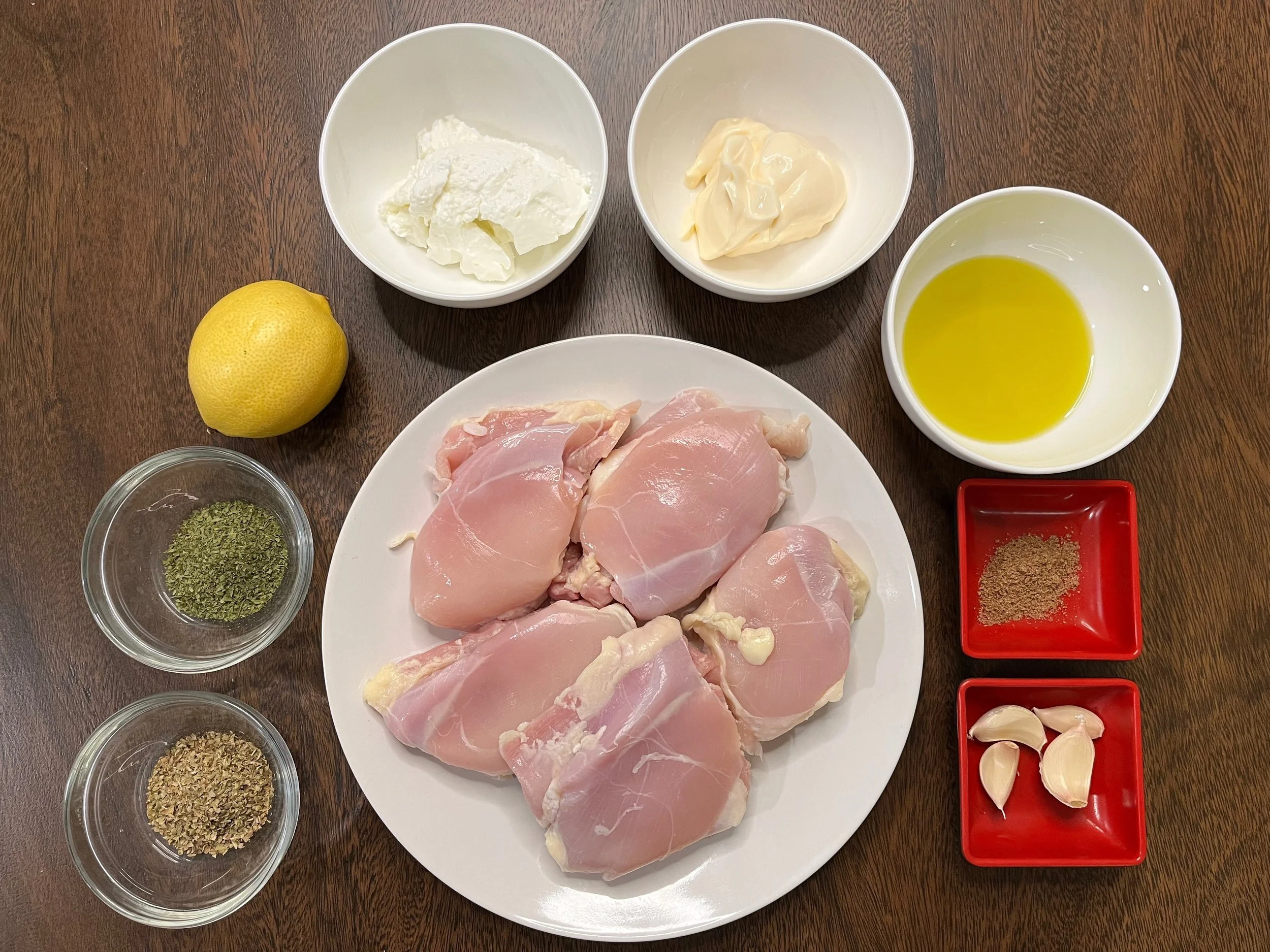 Add ½ cup olive oil, the juice of ½ a lemon (use the other half to make the sauce!), minced garlic, dried oregano, dried parsley, ground coriander, 1 tsp salt, and 1 tsp black pepper to the yogurt-mayo mixture. Mix the marinade until the ingredients are well combined. We will be using boneless, skinless chicken thighs in this recipe. Trim any excess fat from the thighs and score them on both sides with a sharp knife. Place the chicken pieces in the marinade and toss them until the meat is well-coated. Place the chicken pieces in either a plastic bag or a sealed container, and pour in all of the marinade. Let the chicken marinate in the refrigerator for at least one hour, or overnight.