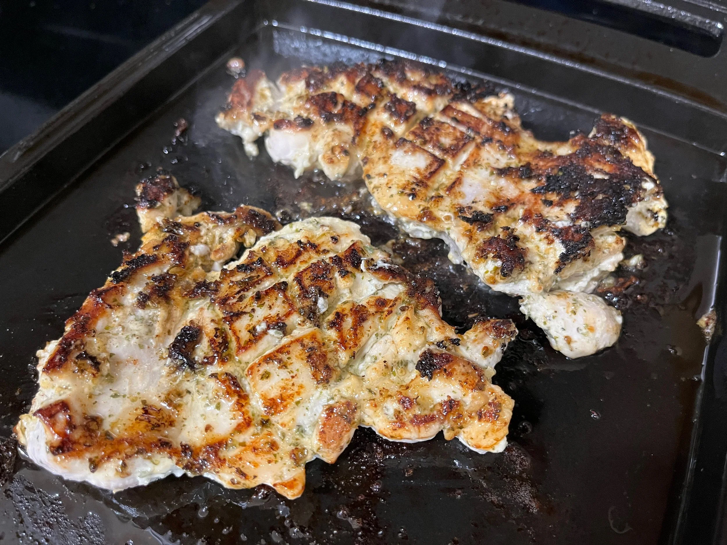 Now it’s time to cook the chicken. The marinated chicken can be cooked on the grill or in a cast-iron skillet. Remove as much marinade from the chicken as possible, either by brushing it off or dabbing it with a paper towel. If you’re grilling, preheat the grill to a high heat (gas on high, or building a hot fire with charcoal). Oil the grates to prevent the chicken from sticking, then lay the chicken onto the grill. Cook for about 6 minutes per side, flipping once, or until the chicken reaches an internal temperature of 165 °F and is fully cooked.