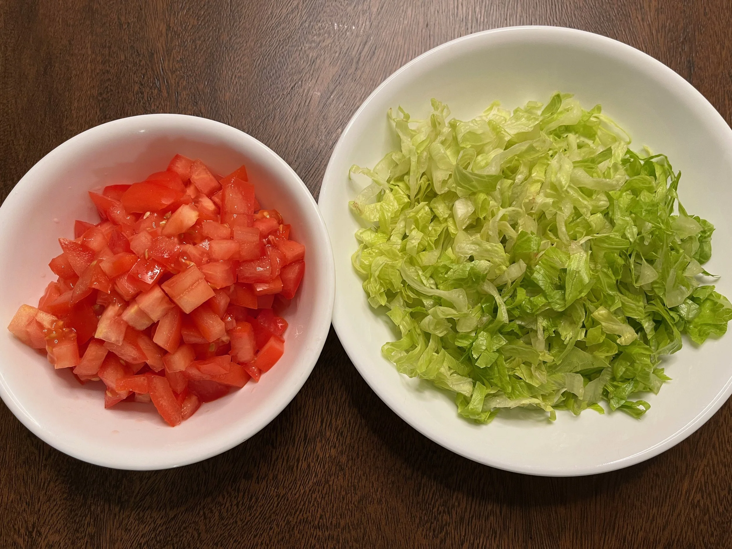 7. While the rice cooks, dice the tomatoes and shred the lettuce. Set the vegetables aside for service.