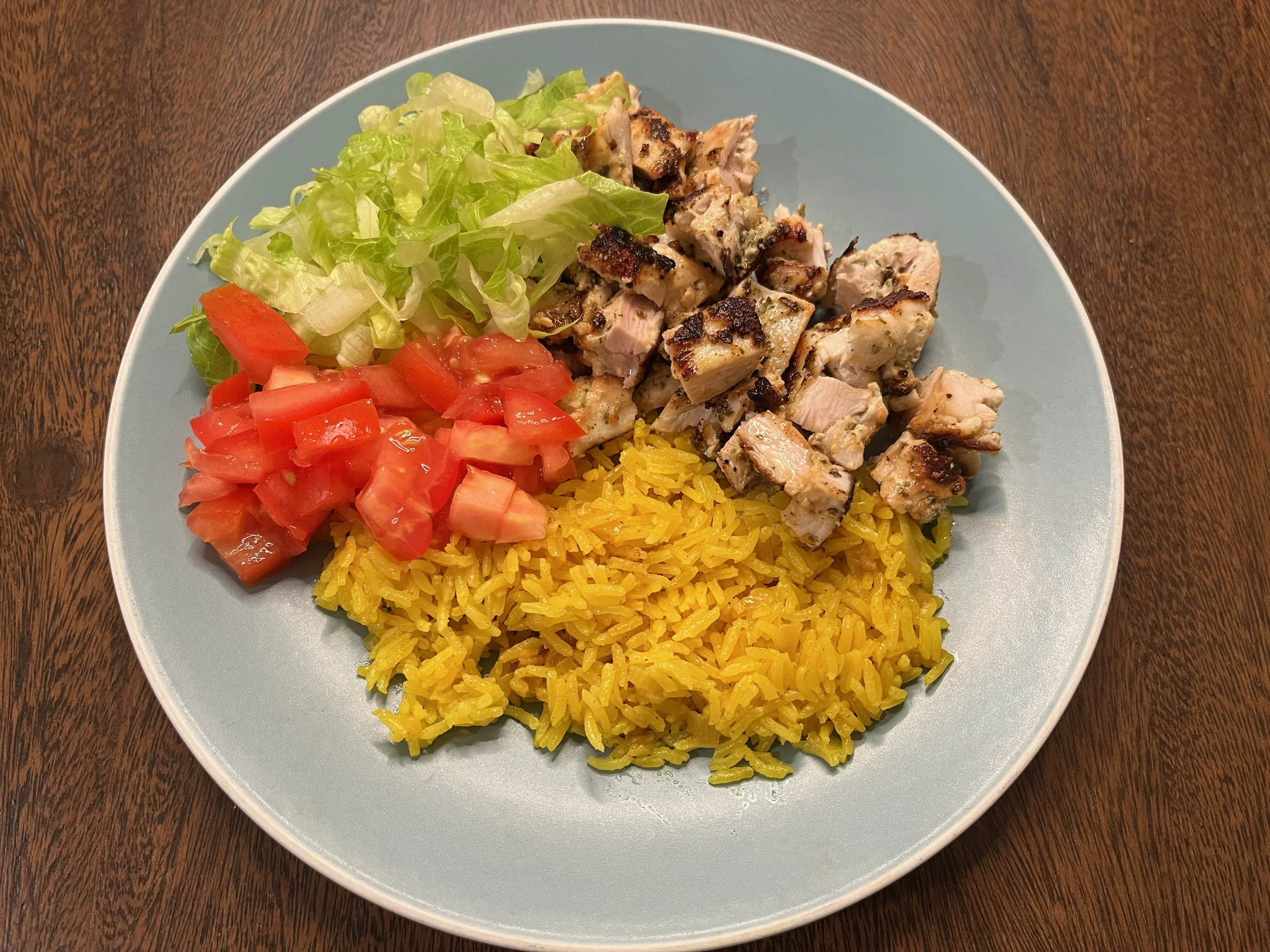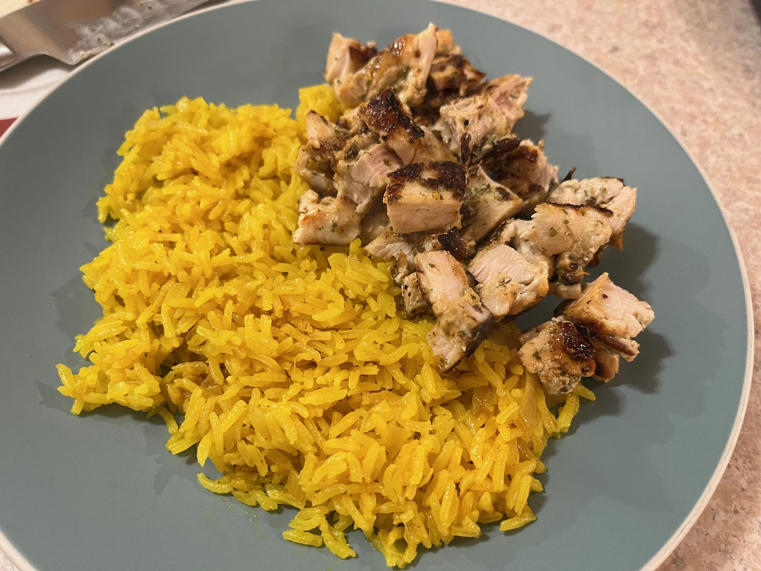 Both of the primary components of this dish, chopped chicken and turmeric rice, will freeze well! Reheat both elements in a microwave, or heat the chicken in a pan with a bit of oil for some crispy edges.