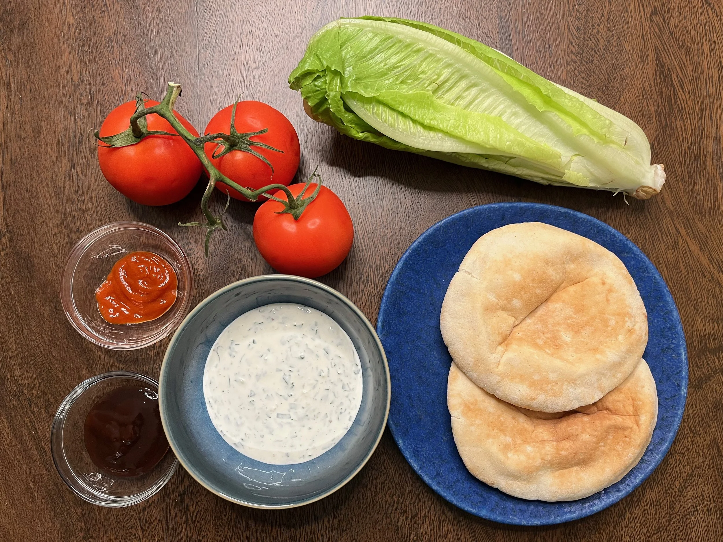 With the chicken and turmeric rice both cooked, we can move on to assembling the plates. Toast the pita bread in a toaster oven or a dry pan, then cut into wedges. Place a generous scoop of rice and a serving of chopped chicken on each plate, along with some diced tomatoes, lettuce, and pita wedges. Serve with the trio of halal cart sauces: garlic parsley white sauce, barbecue sauce, and harissa hot sauce. Drizzle the sauces over the plate, or let every person sauce themselves!