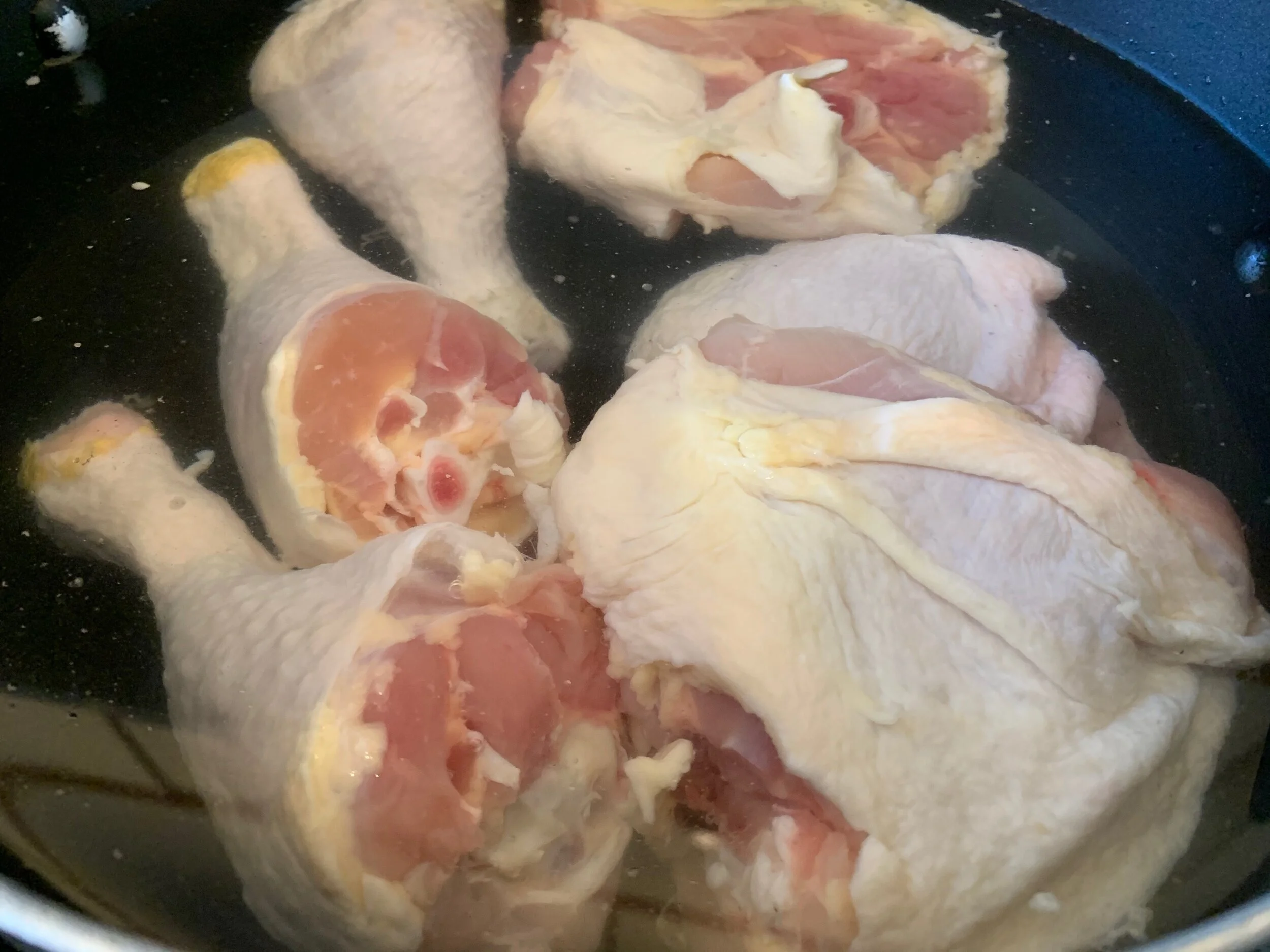 Begin by cutting the chicken legs into separate thigh and drumstick pieces. The first step to making this soup is to blanch the chicken legs. Blanching the meat helps remove impurities (surface proteins, bone fragments, blood), keeping the final soup clear. It also prevents scum from forming on the surface of the soup as it cooks. To blanch, place the chicken pieces in a pot, cover with cold water, and bring to a boil. Keep the pot at a rolling boil for about 5 minutes. Then, remove the chicken to a clean pot, and drain the blanching water.
