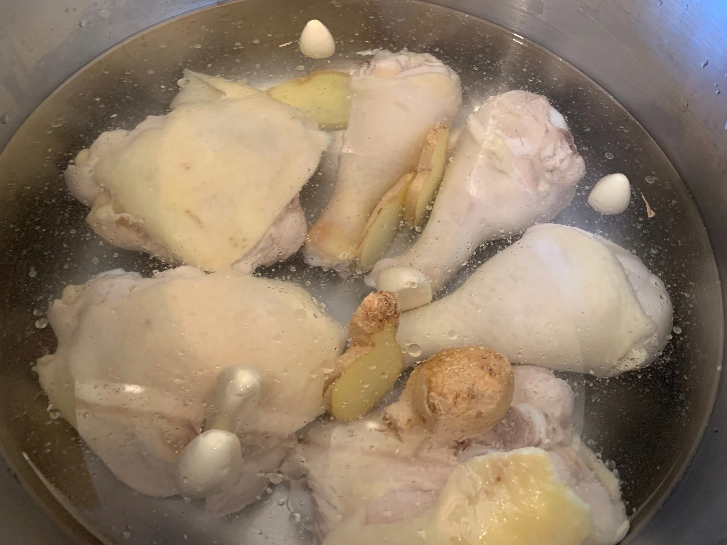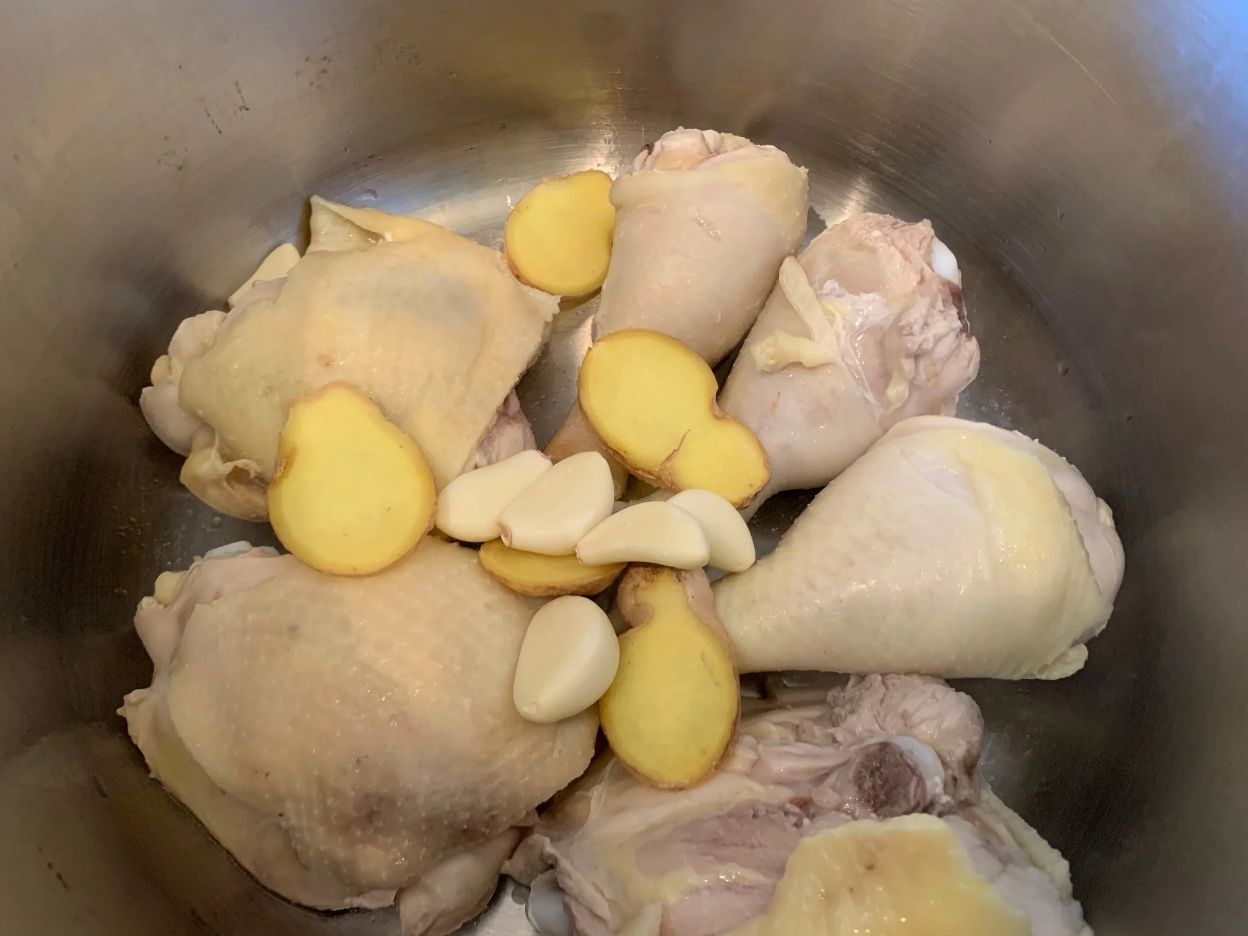 Add to the pot 1 inch of ginger, cut into slices, 6 cloves of garlic, and 8 cups of water. Bring the pot to a simmer and cook, covered, for about 1 hour, or until the chicken is falling-off-the-bone tender.