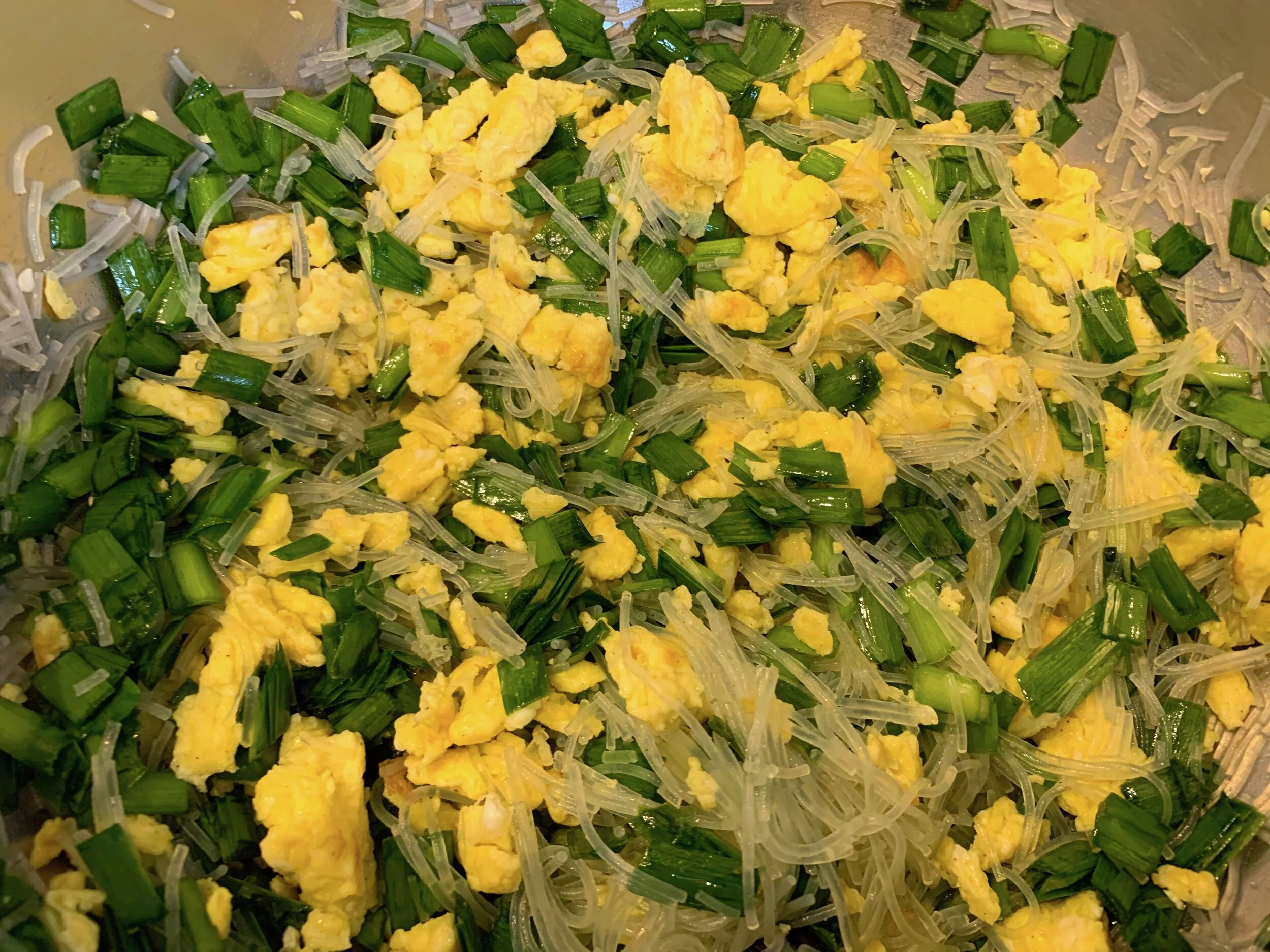 6. Remove the egg and vermicelli mixture from the heat and add to the bowl with the chives. Add the white pepper, mix well, and let the filling cool.