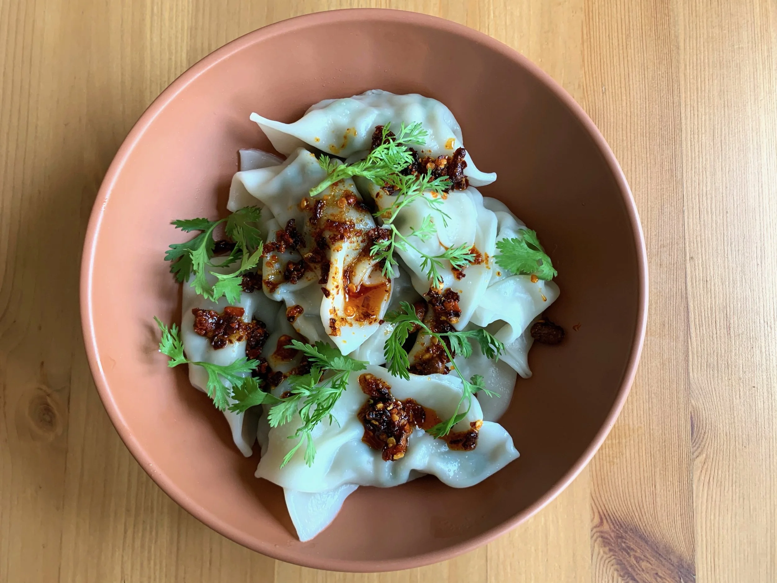 Remove from the pot with a slotted spoon, and serve with the dipping sauce of your choice. Generally soy sauce based, dipping sauces may also include sesame oil, rice vinegar, chili oil, satay sauce, ginger, and/or garlic. My personal preference when it comes to a dipping sauce for pork and cilantro dumplings is a mix of soy sauce, your favorite chili crisp, and some fresh cilantro.