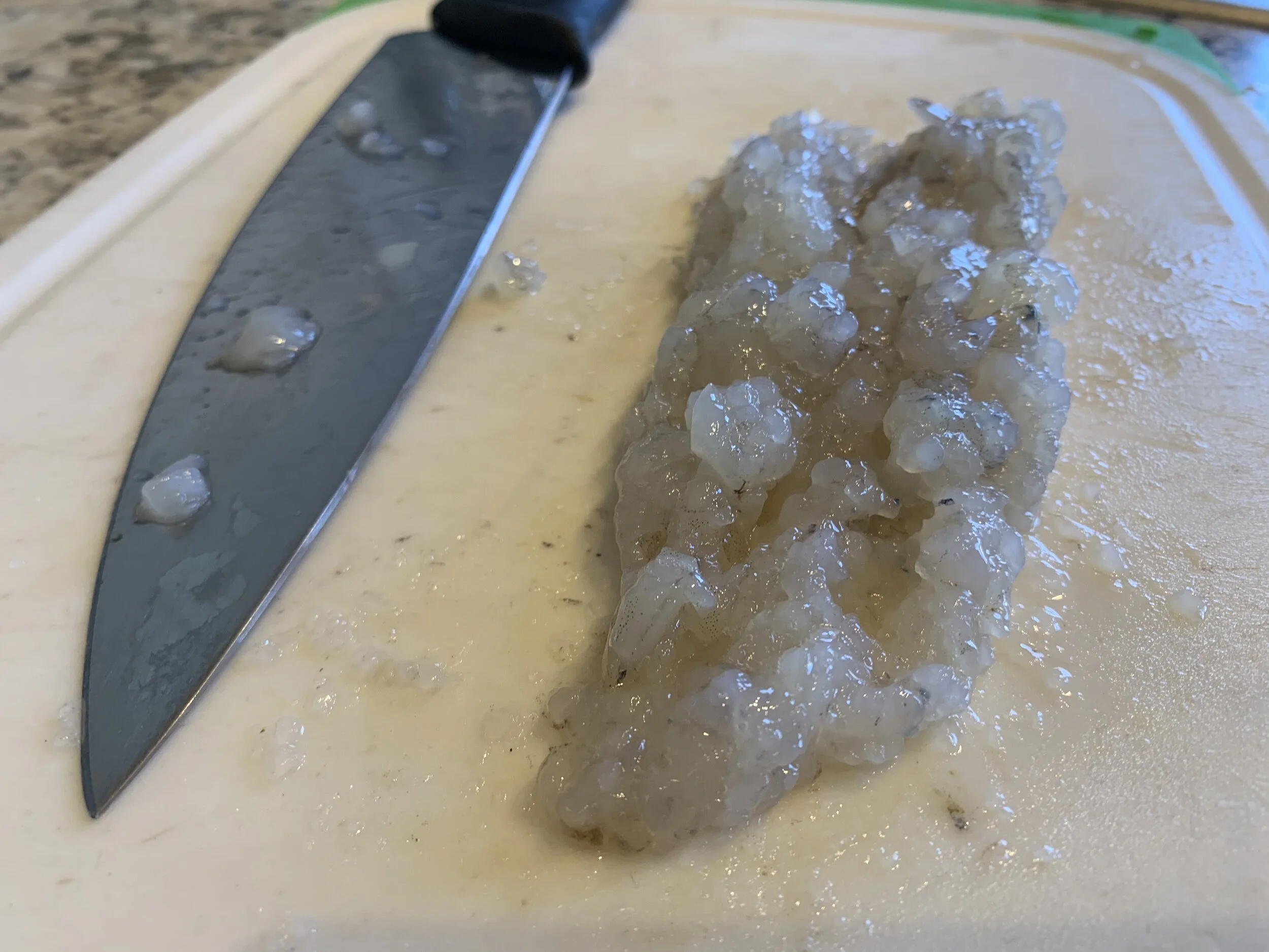 Next, we prepare the filling. Finely mince your shrimp using a knife or cleaver, and put the mince into a mixing bowl. Add 1 teaspoon cornstarch, salt, sesame oil, and rice wine, and mix until thoroughly combined.