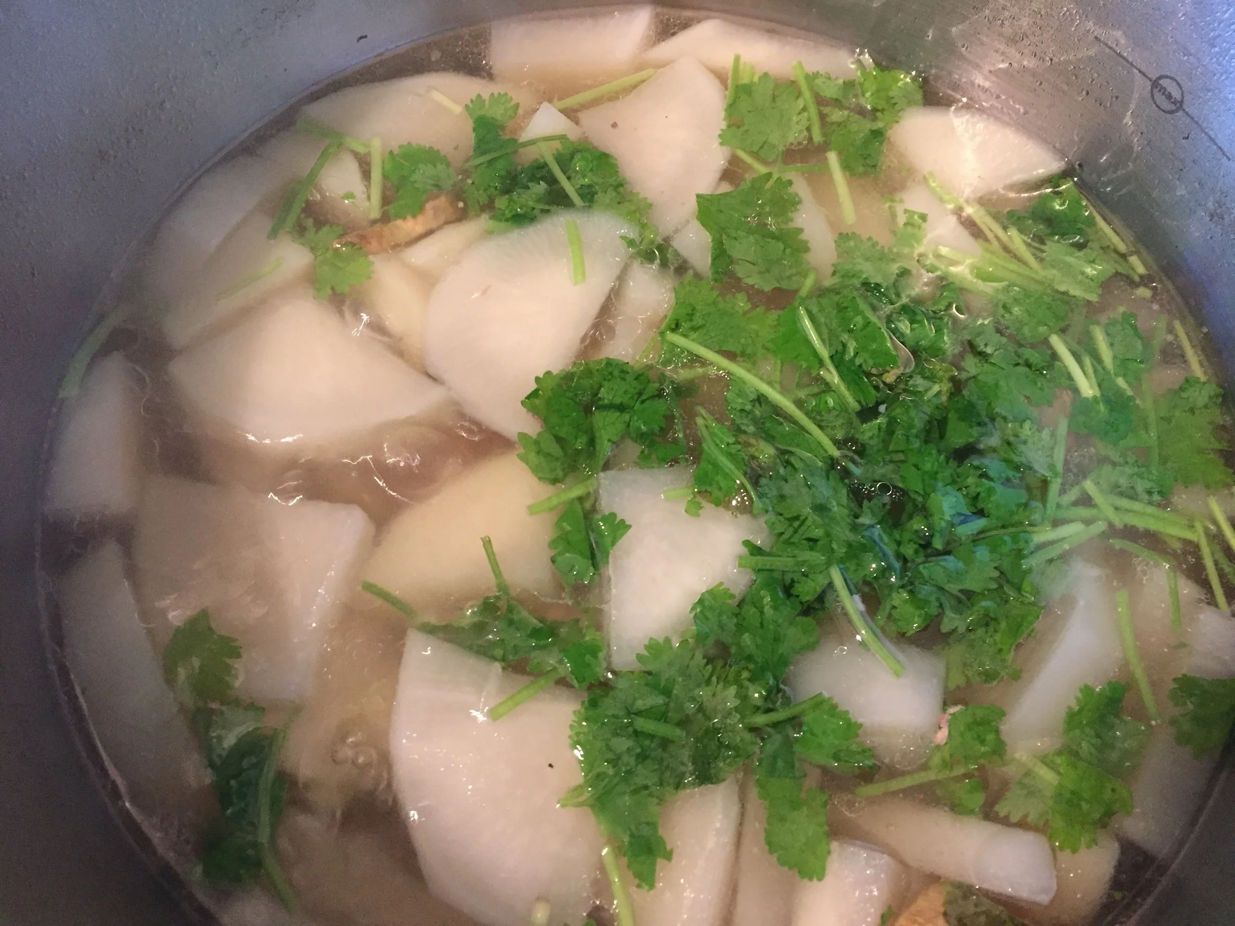 The daikon should be very soft, and the pork should be falling-off-the-bone tender. When the soup is done to your liking, salt to taste. Chop the cilantro and add it just prior to serving.