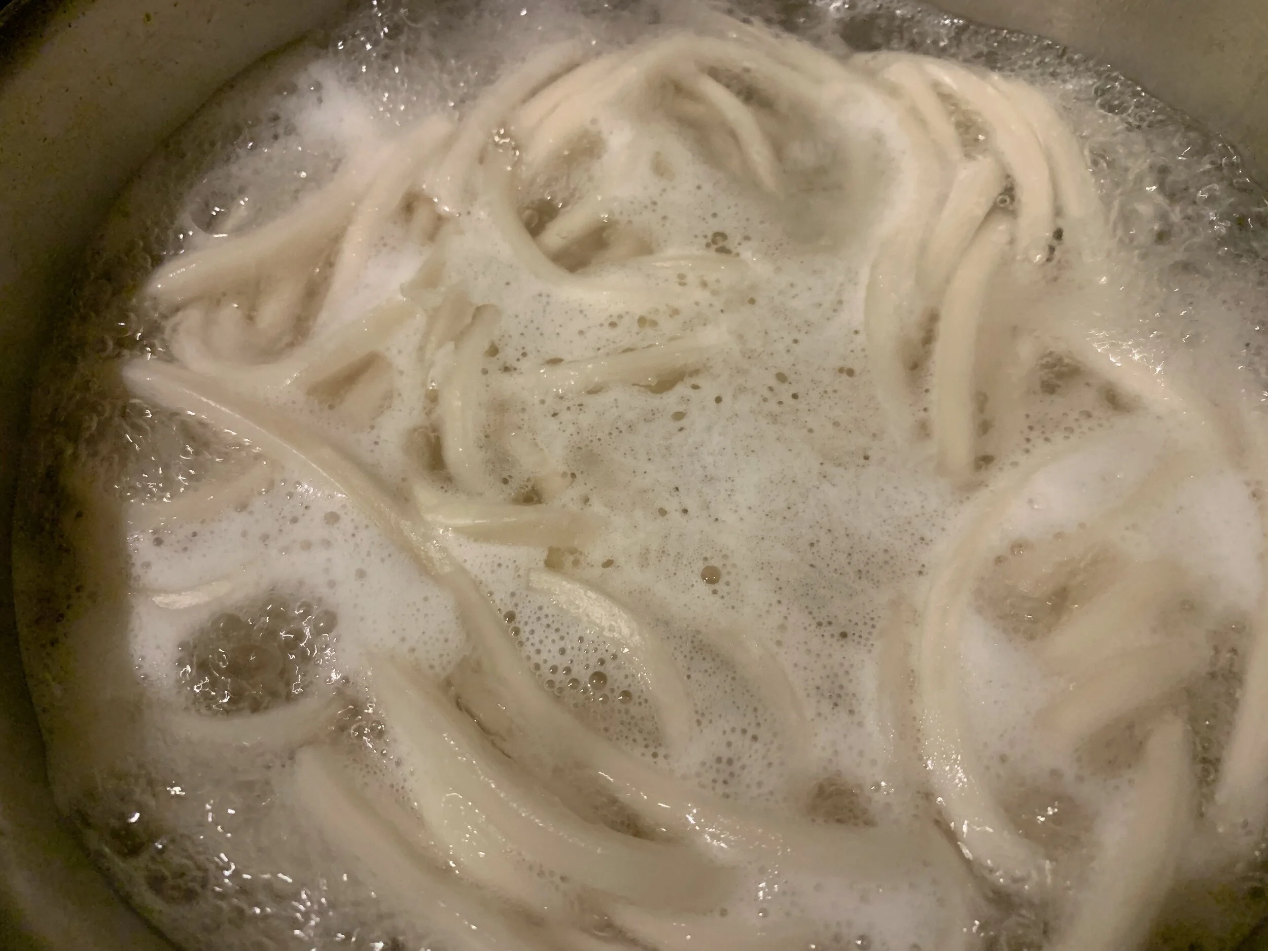 Let’s begin with the noodles. Bring a pot of water to a boil, and add the udon noodles to the boiling water. Break the mass of noodles up with tongs or chopsticks, and boil the noodles per the package instructions until fully cooked. This will depend on the thickness of your particular brand of udon noodles, but is generally about 5 minutes for fresh noodles, or 10 minutes for frozen noodles.