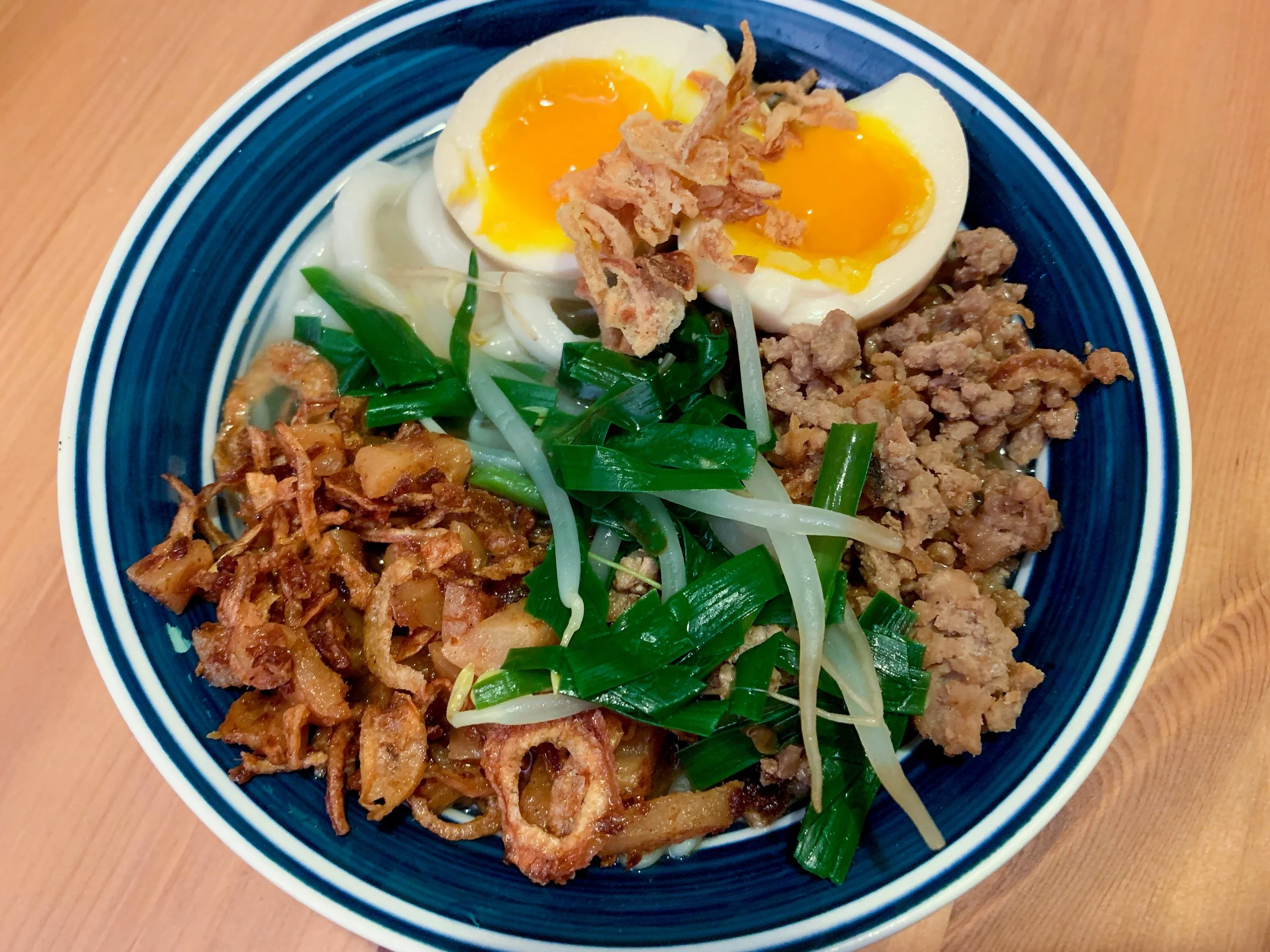 8. To assemble the noodle soup, place some of the cooked udon noodles at the bottom of each bowl. Ladle over the soup and vegetables, and top with the cooked minced pork, preserved radish relish, soy sauce eggs, and the remaining fried shallots.