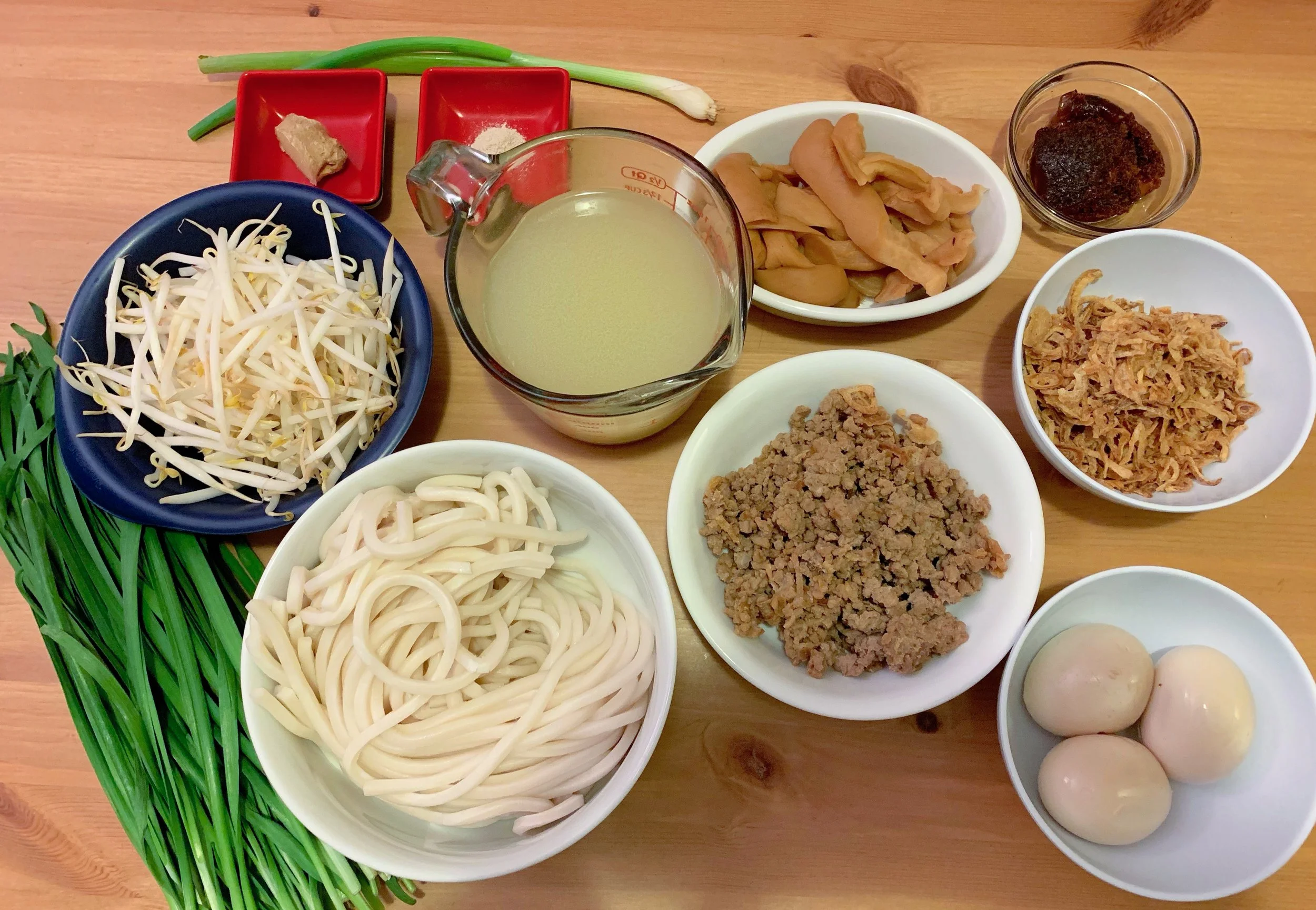 This dish employs two precooked components, half a batch of Taiwanese minced pork, and the optional but recommended soy sauce eggs. Both of these elements can be prepared a few days in advance, and the minced pork can be cooked and frozen.
