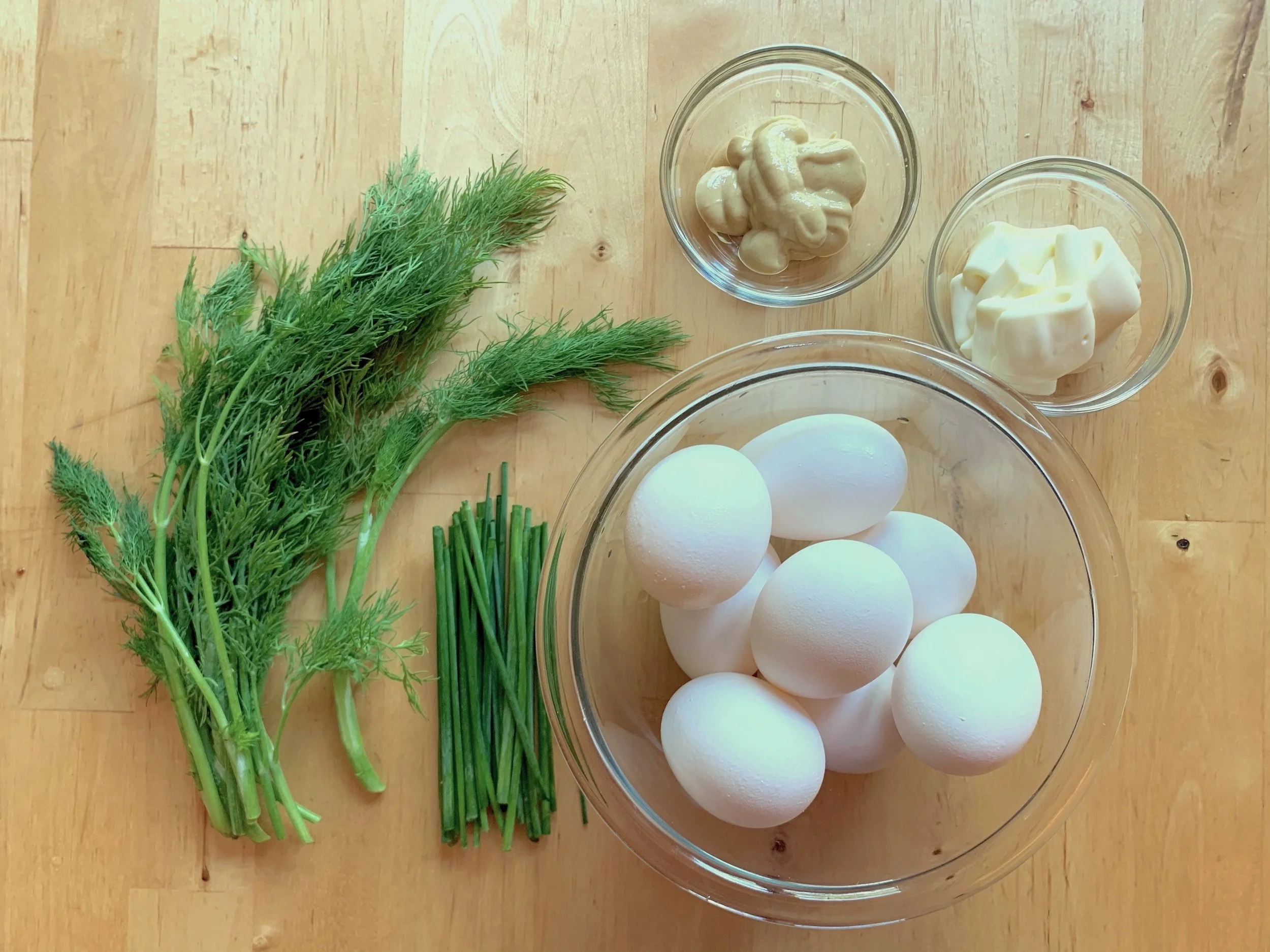 Now it’s time to assemble the salad. In a large bowl, combine the chopped eggs with the finely chopped dill and chives, mustard, and mayonnaise. Toss gently to avoid breaking up the delicate egg pieces, until the ingredients are well combined.