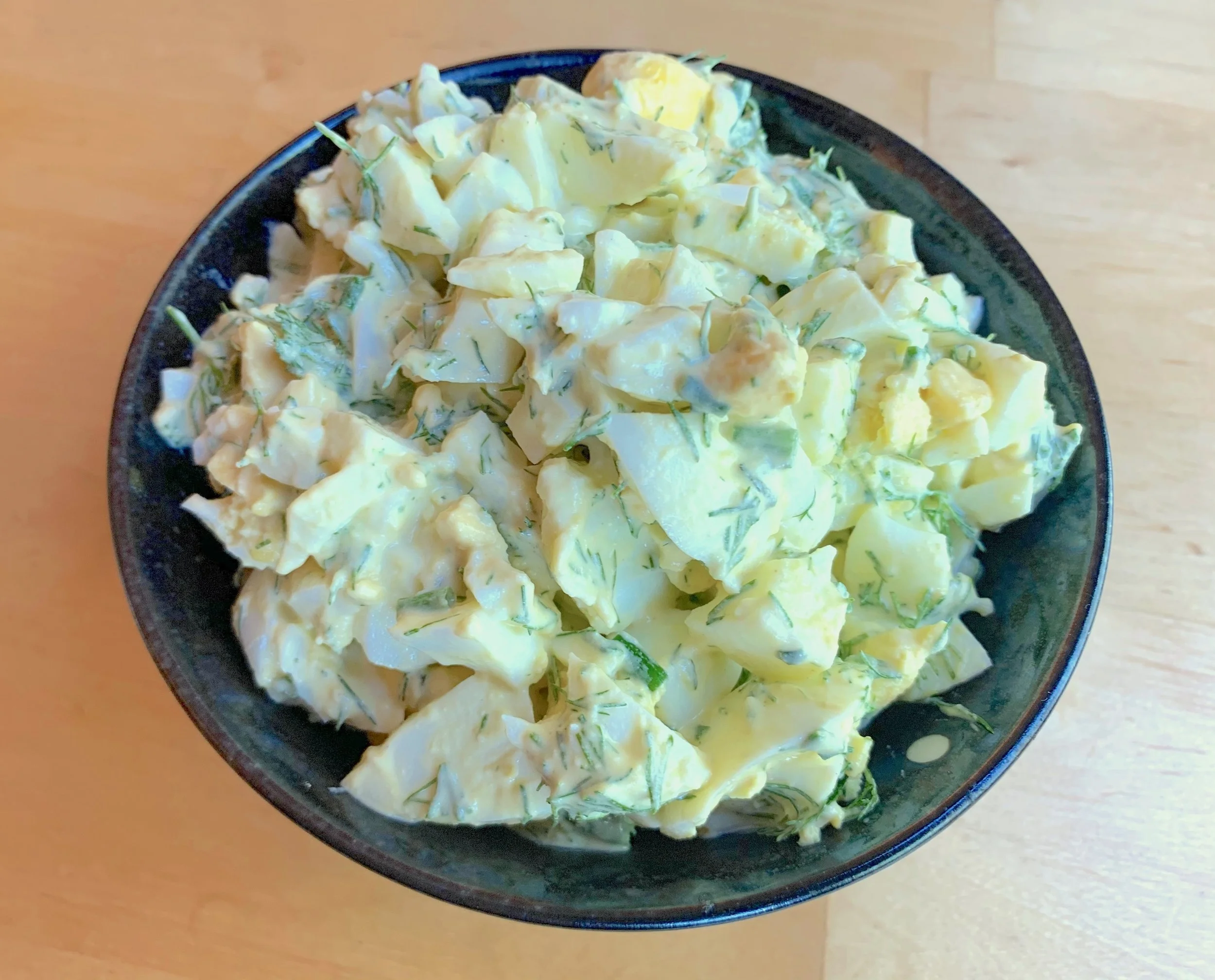 4. In a large bowl, combine the chopped eggs with the finely chopped dill and chives, mustard, and mayonnaise. Toss gently until the salad is well mixed.