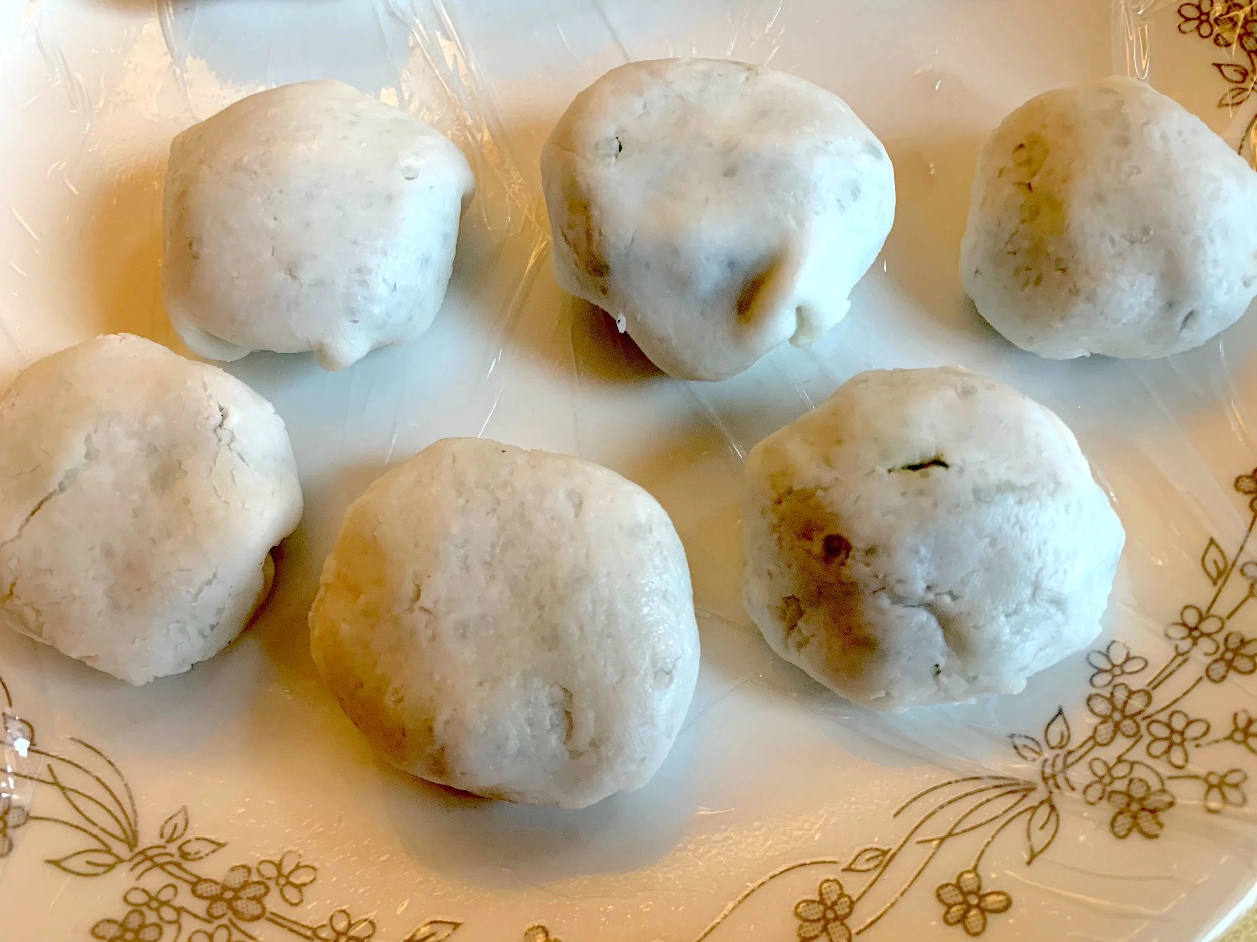 As the dough starts to come together, introduce the shortening or lard in about teaspoon-size pieces. Mix until the shortening melts and is incorporated. When the dough becomes too stiff to mix, knead the dough with clean hands for 2 to 3 minutes, or until it becomes smooth and uniform. Since there is no gluten, kneading doesn’t serve any structural function in this dough—it just helps combine the lumps of gelatinized starch into one uniform mass.