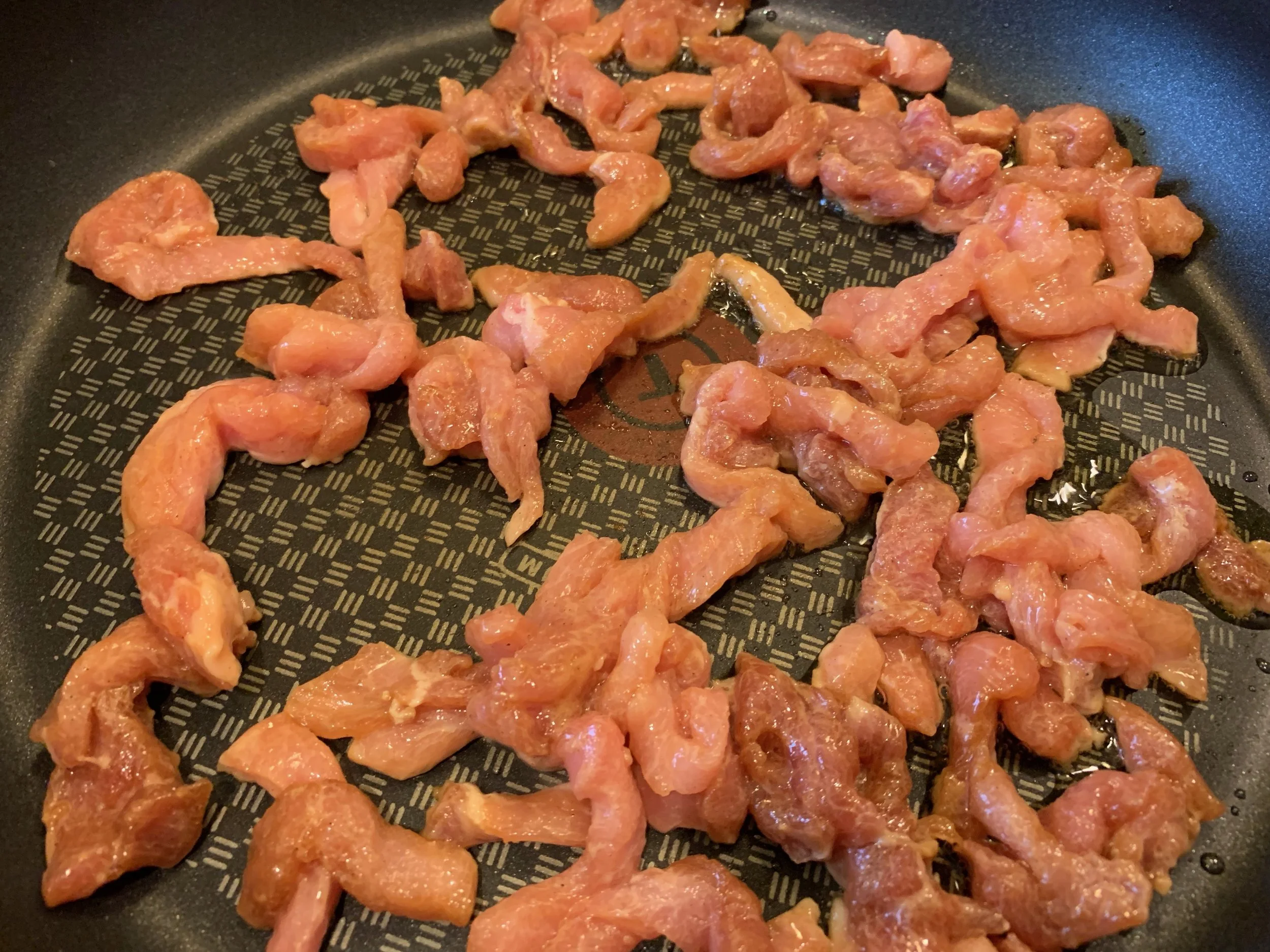 When the pork is done marinating, heat about a teaspoon of vegetable oil in a pan over high heat. This dish is traditionally cooked all at once in a very large wok. In a wok with a traditional burner, it is possible to cook ingredients in the middle of the wok, subjected to very high heat, while ingredients pushed to the edge are just kept warm. However, at home we have neither the jet engine heat of a wok burner, nor the surface area of a large wok, so instead of pushing cooked ingredients to the edge for mixing later, we will be pulling cooked ingredients sequentially from the pan.