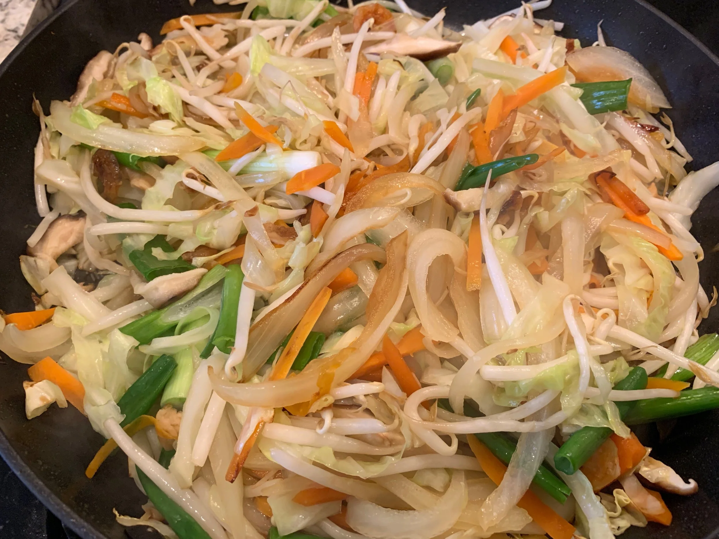 Add a bit more oil to the pan if necessary, then add the minced garlic and dried shrimp. Fry until fragrant, which should be about 30 seconds. Then add the carrots and onions, as these vegetables take longer to cook. Cook, covered and stirring occasionally, for about 3 minutes. Then add the cabbage and mushrooms, which require less total cook time. Cover the pan again and continue to cook for another 3 minutes, until the vegetables are softened. Finally, add the bean sprouts and scallions, which just have to be warmed through. Cook for an additional minute, stirring to combine. Then remove the vegetable mixture from the heat, placing them into the same bowl as the pork.