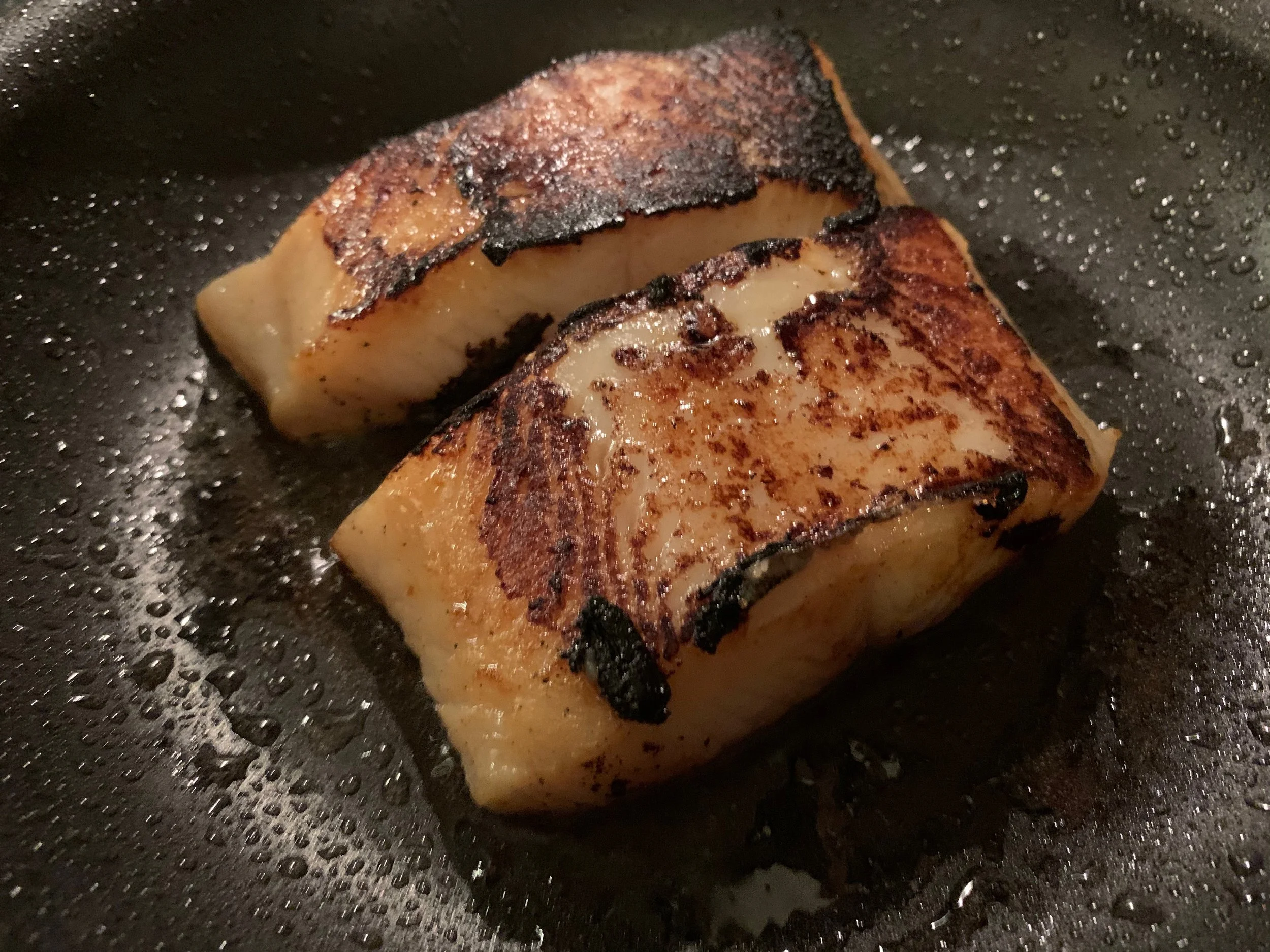 The marinated fish can either be broiled in the oven or seared on the pan. Broiling is the easier method, but pan-searing allows you to prepare the fish with crispy skin! Regardless of which method you choose, it’s important to wipe as much marinade off the fish before we start cooking. The marinade has already done its job, penetrating and flavoring the meat. Since this marinade’s high sugar content makes it liable to burn under high heat, get as much of it off as possible! I find that clean hands are the best tool for this job—use your fingers to wipe the marinade off each piece of fish.