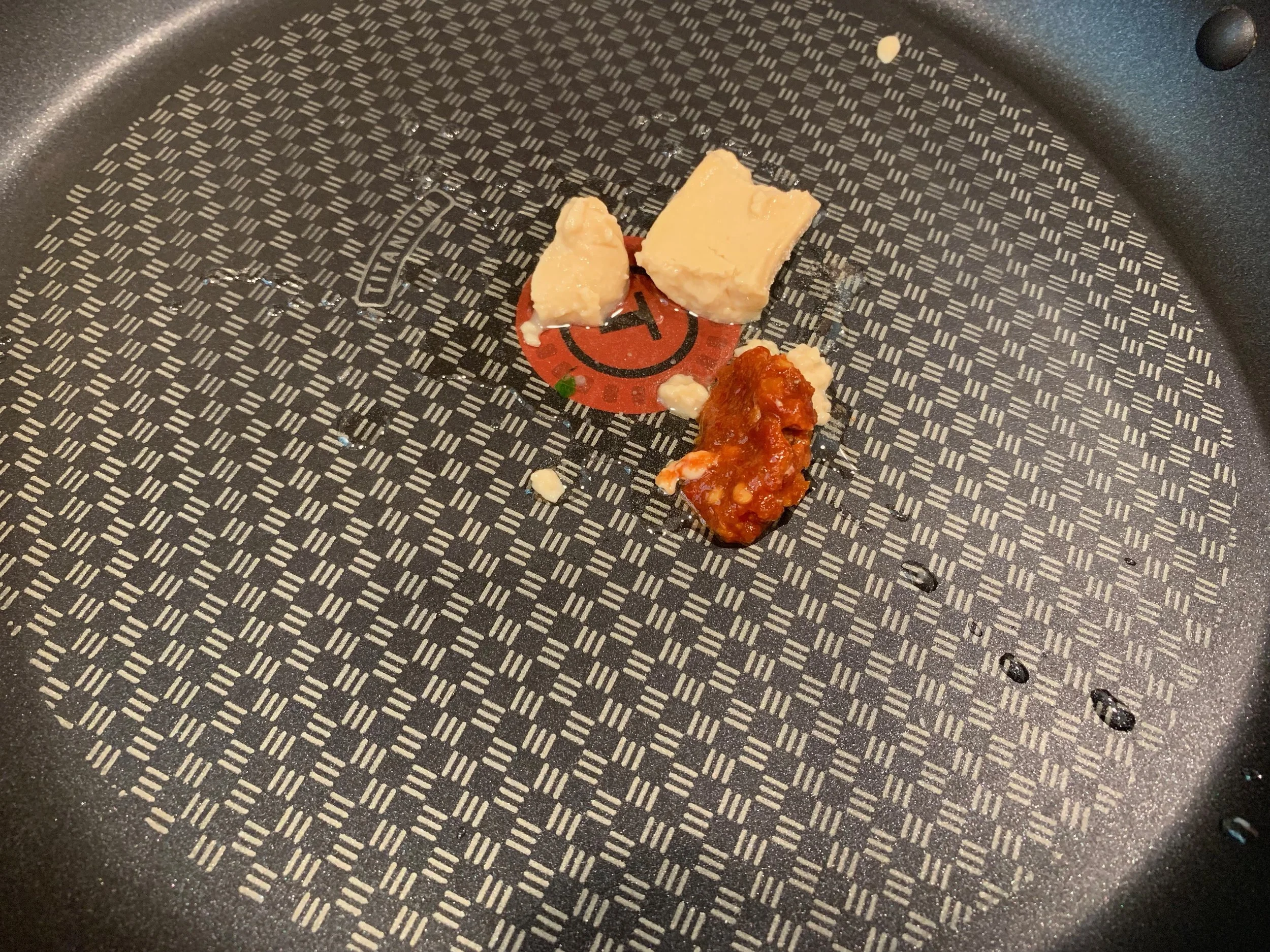 2. Heat about 1 tbsp vegetable oil in a pan over medium heat. Add the chili garlic sauce and fermented bean curd cubes to the oil. Stir, breaking up the bean curd, until fragrant, about 30 seconds.