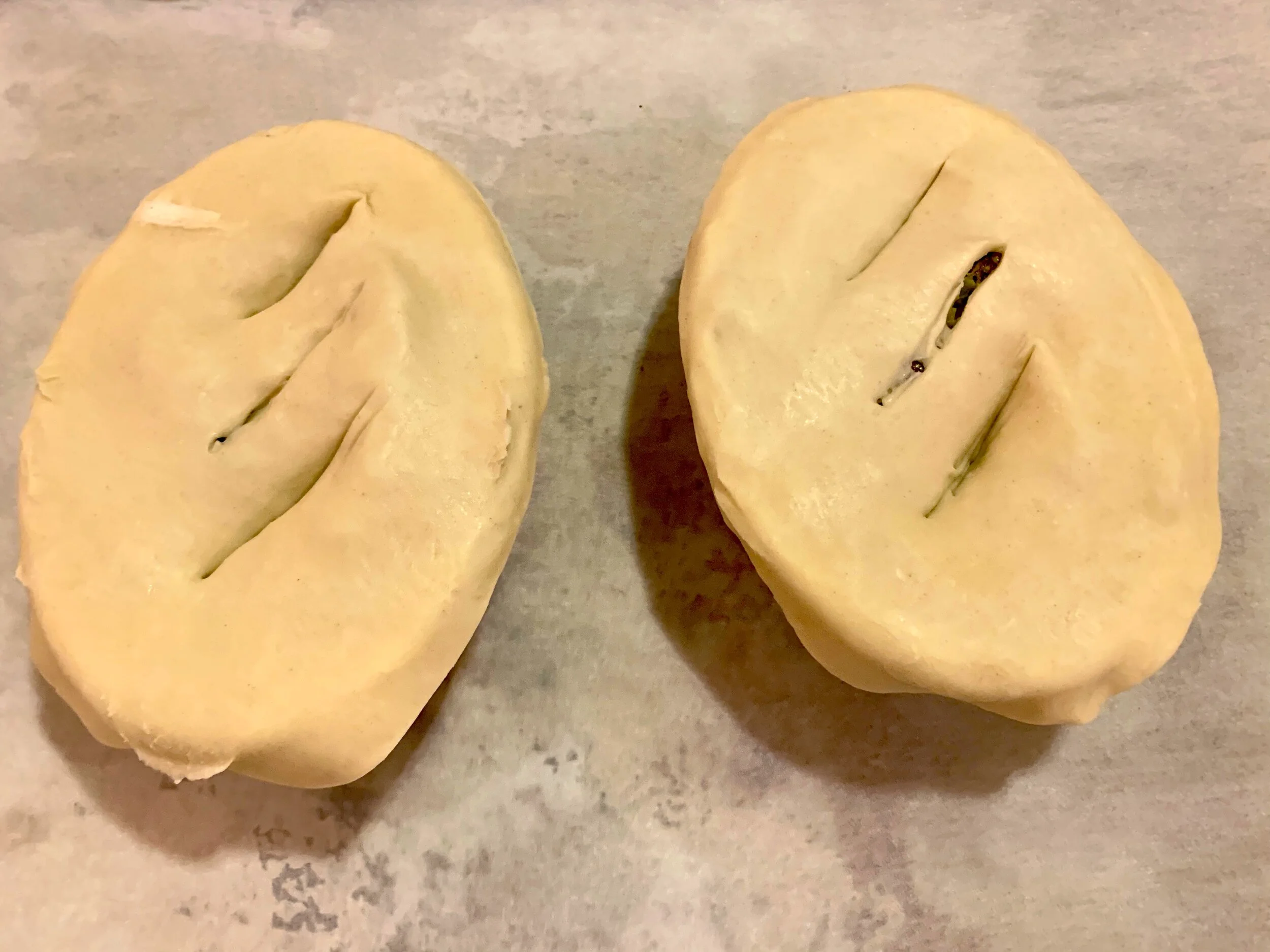 To glaze the pastry lids, beat an egg until it forms a smooth egg wash. Brush the egg wash over the top of each pie. Using the tip of a butter knife, make several small holes of slashes in each pie, allowing steam from the filling to escape. Bake the pies for 15 minutes at 425° F. Then turn the oven down to 400° F, and bake for an additional 15-20 minutes, or until the pastry is fully puffed and golden brown. Remove the pies from the oven. Let them cool for at least 10 minutes before serving.