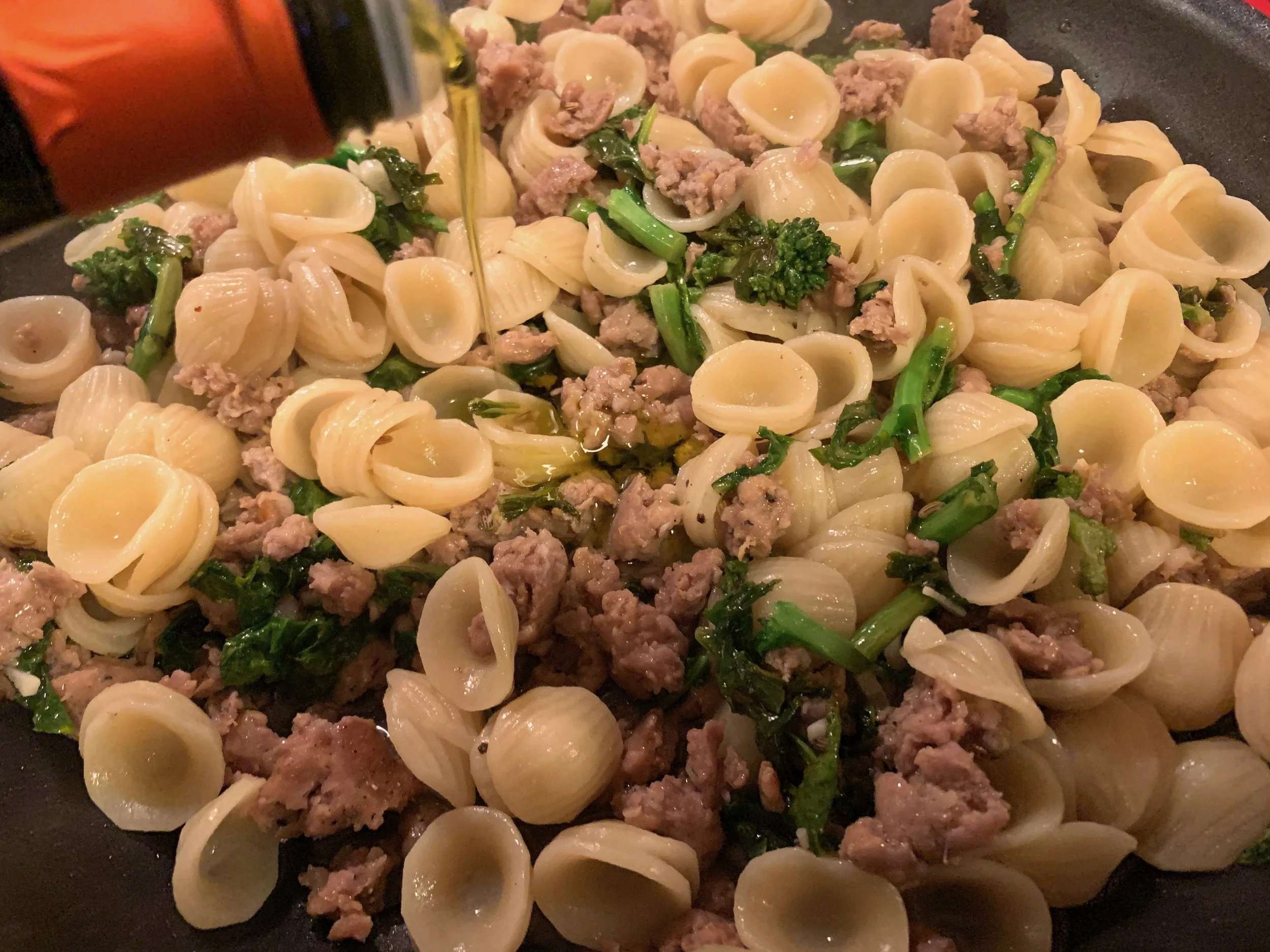 While the sausage cooks, bring a large pot of salted water to a boil for the pasta. When the water comes to a boil, add the two cups of orecchiette. Cook the pasta for about 12 minutes, or to package instructions.