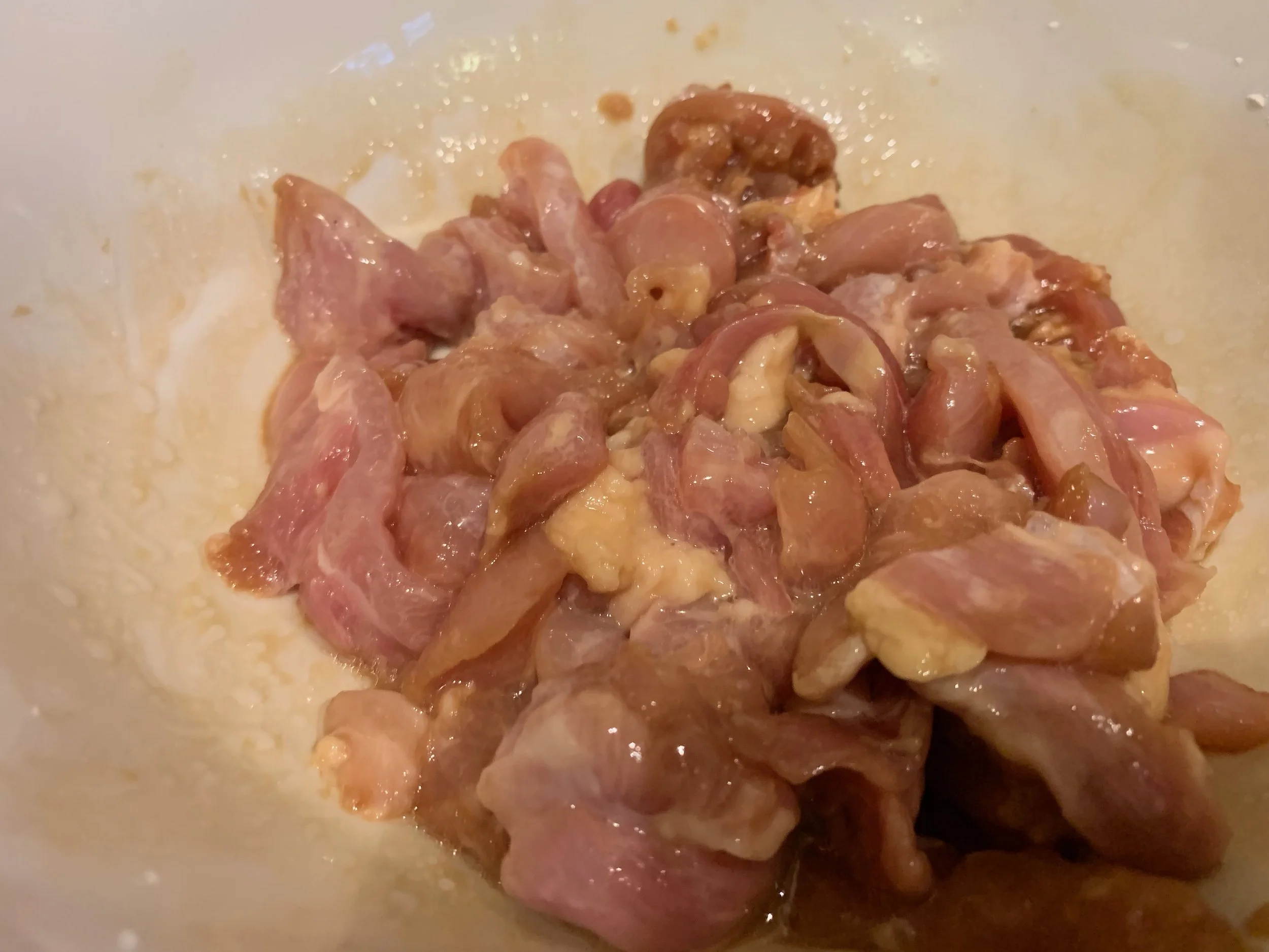 2. Cut the chicken into 1 cm wide pieces, and mix with 1 tsp soy sauce, 1 tsp vegetable oil, and 1 tsp cornstarch. Set aside to marinade for 20 minutes.