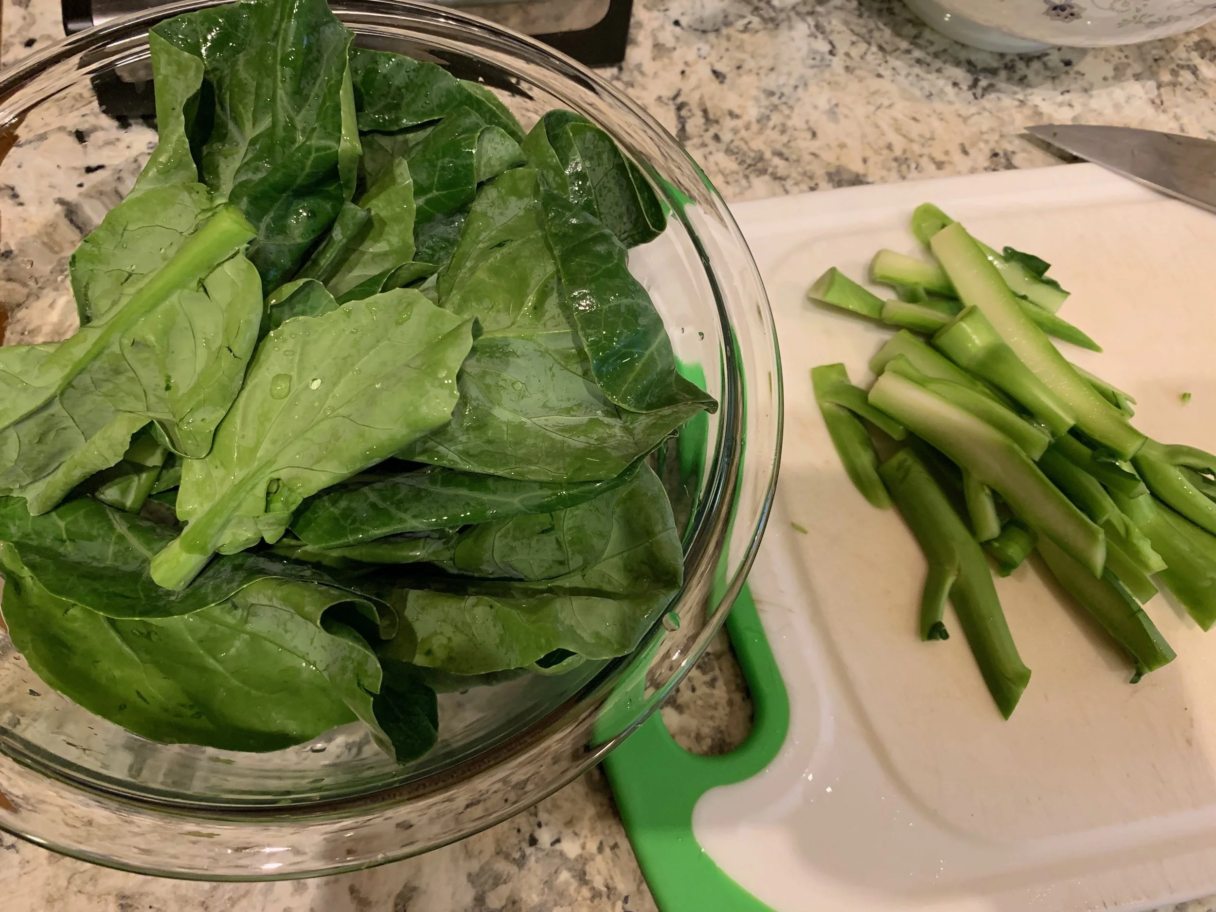 While the noodles soak and the chicken marinates, we can prepare the other elements of the stir fry. Thinly slice the garlic and set aside. Cut up the Chinese broccoli, separating the stems from the leaves. Splitting the stems lengthwise will allow the broccoli to cook more uniformly, and the flat surface is a good opportunity to get some color on the vegetables.