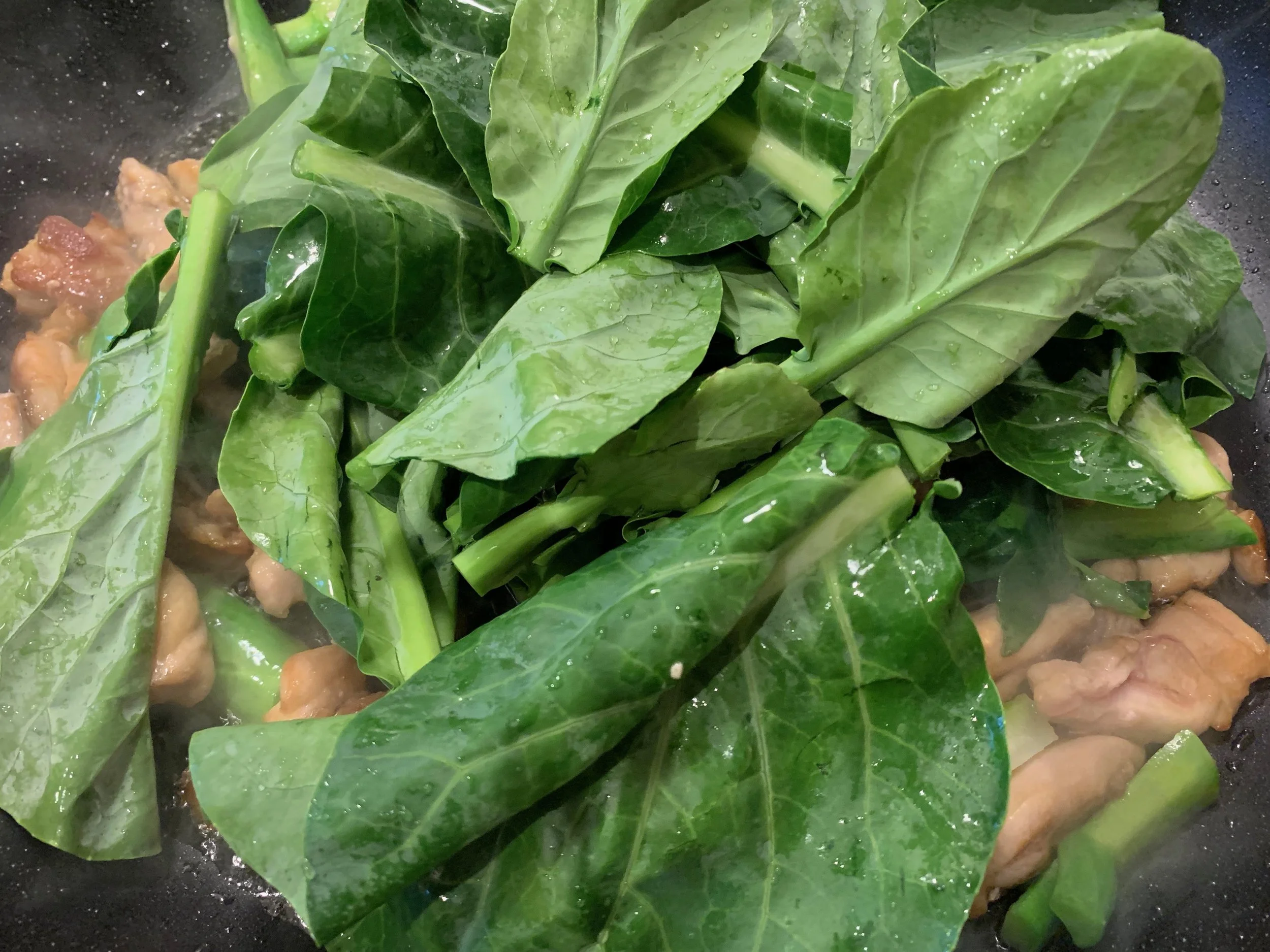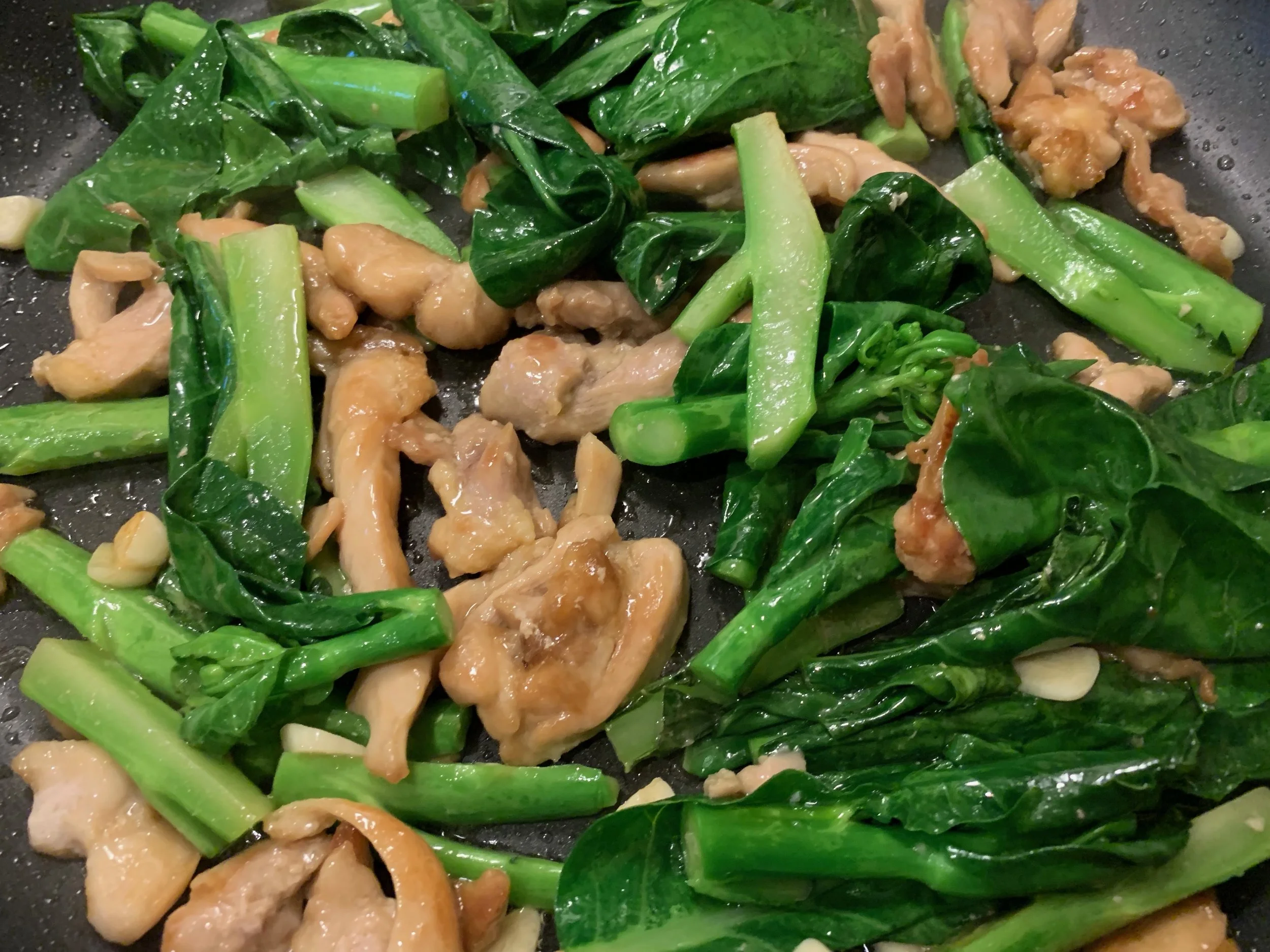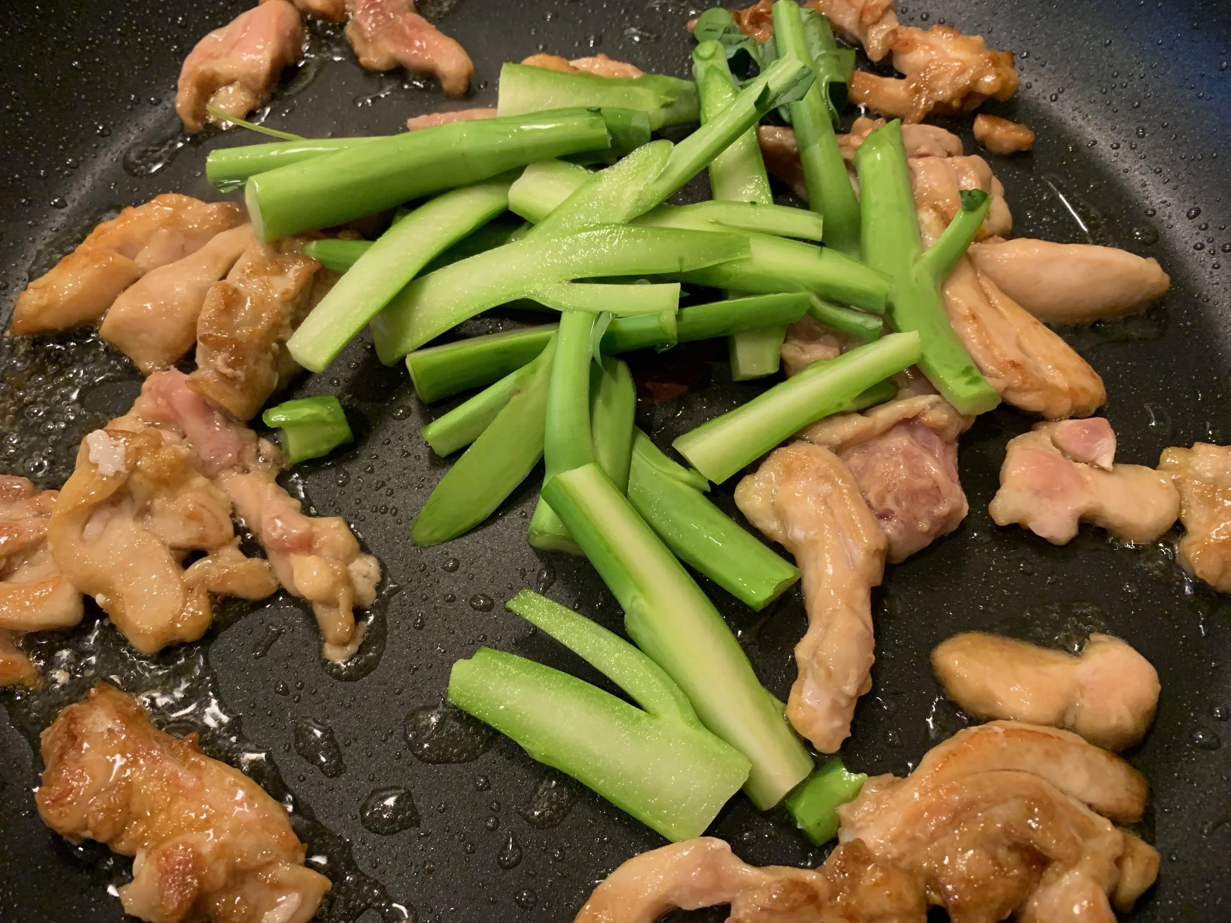 5. Add the broccoli stems and garlic to the pan and cook for 2 minutes. Then add the broccoli leaves and cook until just wilted, about 1 minute. Remove the cooked chicken and broccoli from the heat.