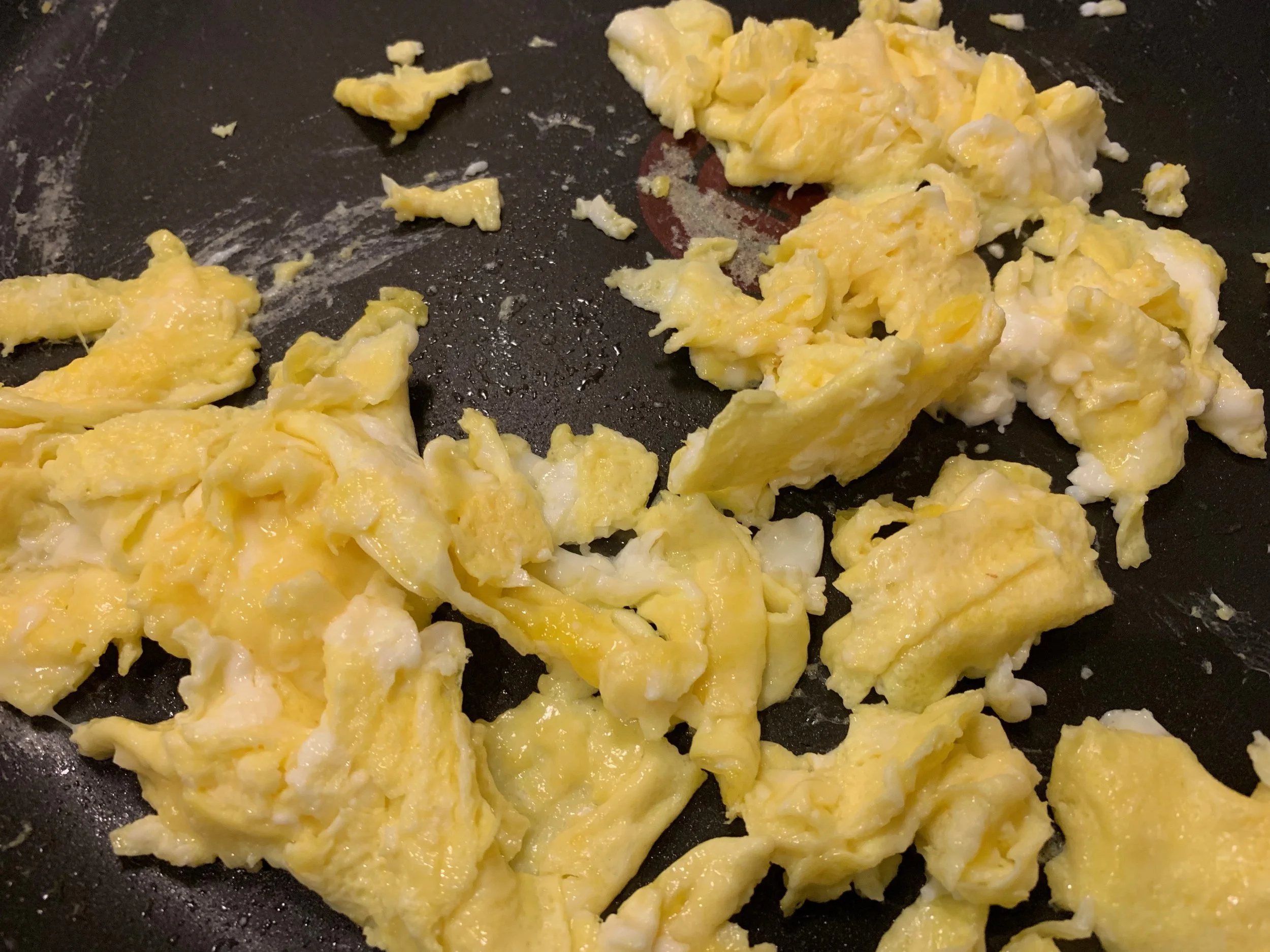 Next up are the eggs [3]. Add a bit more vegetable oil if needed, then add the two beaten eggs to the pan. Scramble the eggs, breaking them up into small pieces. When the eggs are cooked, remove them from the heat and add them to the broccoli mixture.