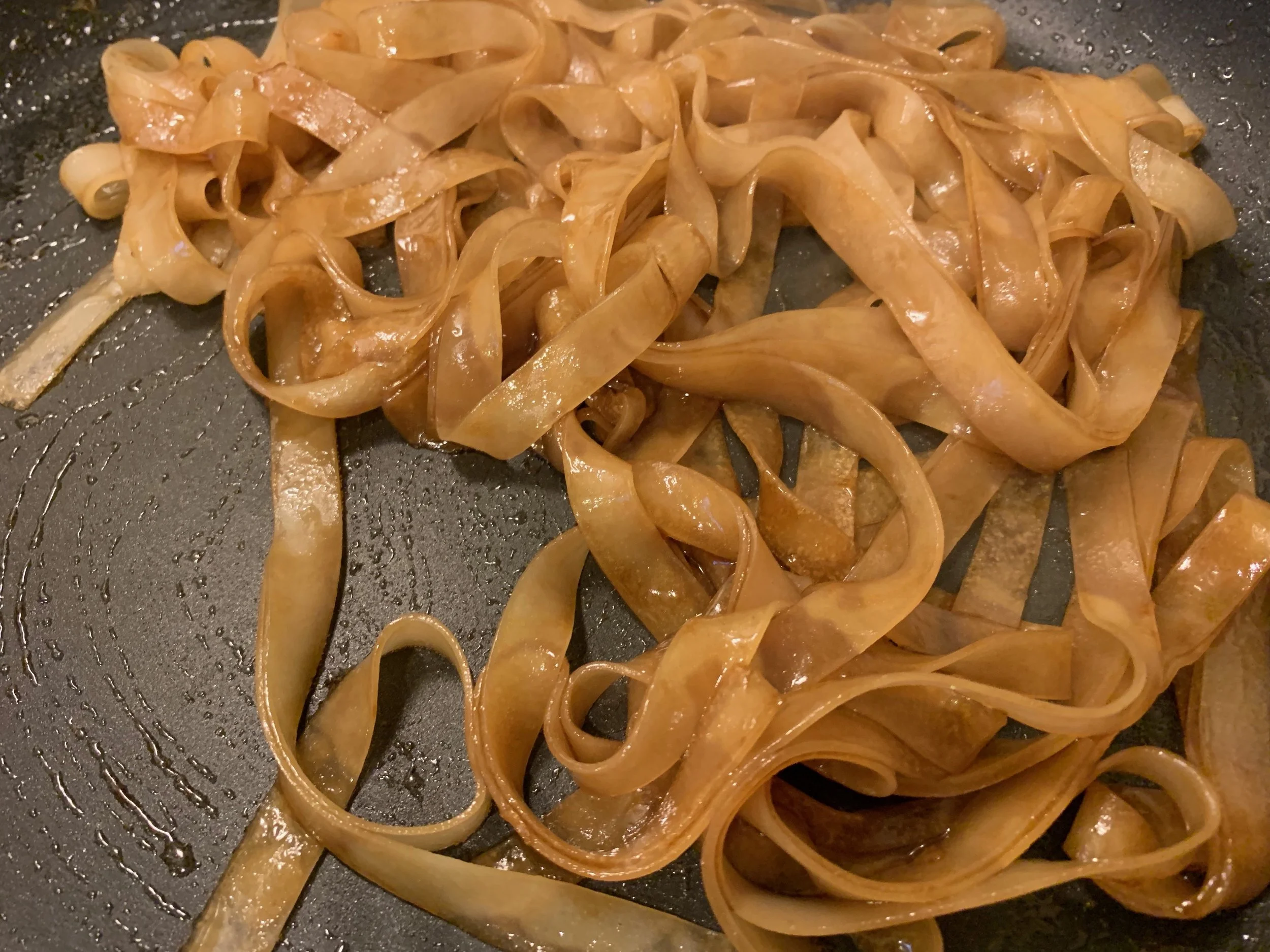 7. Bring together the dish in two batches (unless you have a very large wok). Heat 1 tbsp vegetable oil to the pan over high heat, and add half of the softened rice noodles. Add half of the sauce and toss gently, coating the noodles in the sauce. Cook for 2-3 min, tossing occasionally, until the noodles color and just char.