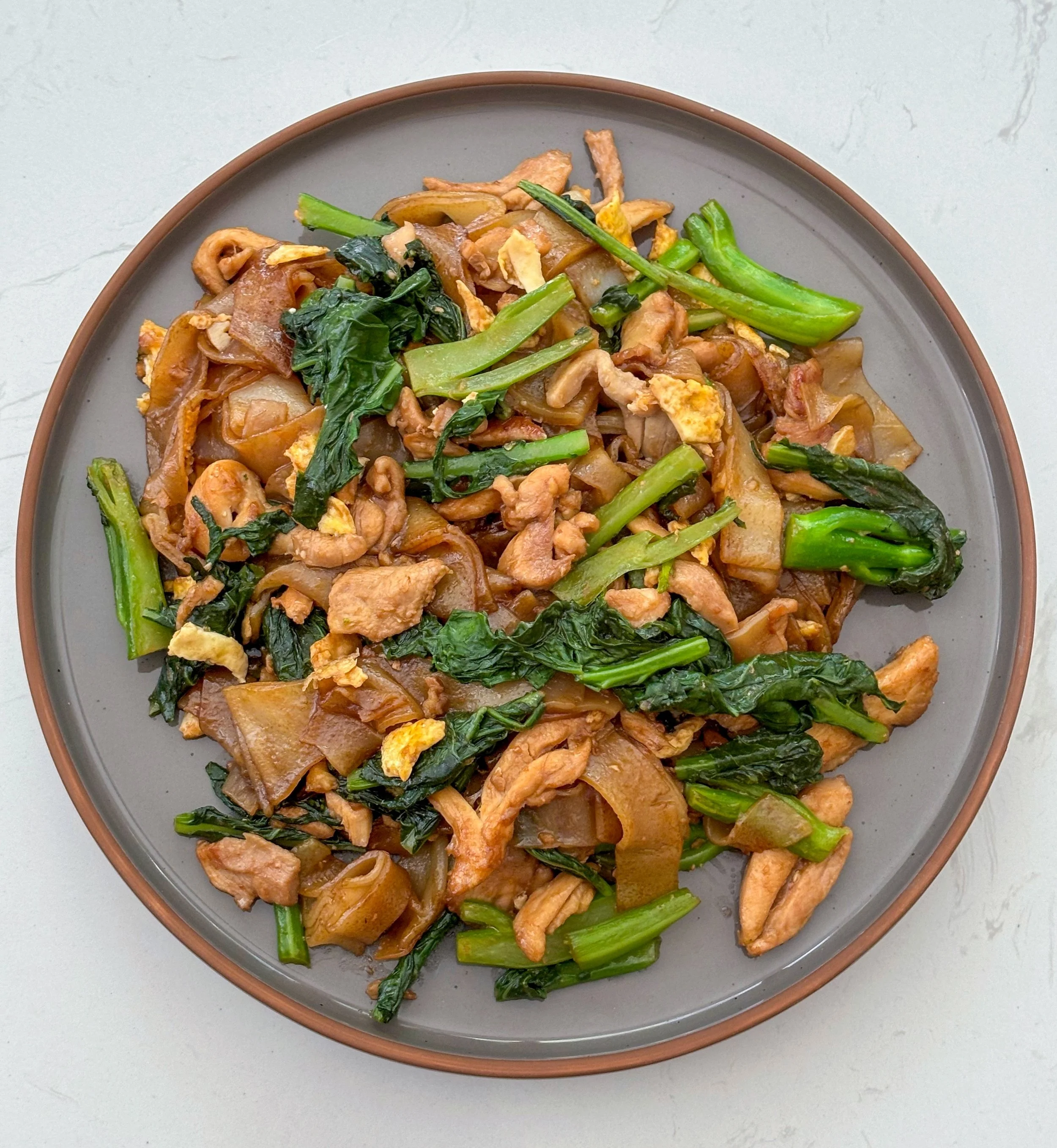 Pad see ew is a Thai stir-fried noodle dish flavored with a soy-based sauce [1]. It is an evolution of Chinese chow fun adapted to local tastes, and this influence is evident in the ingredients: rice noodles from Southern China, Chinese broccoli, and the liberal use of local fish sauce. It has a relatively short ingredients list, making it one of the simplest noodle stir fries to do at home!