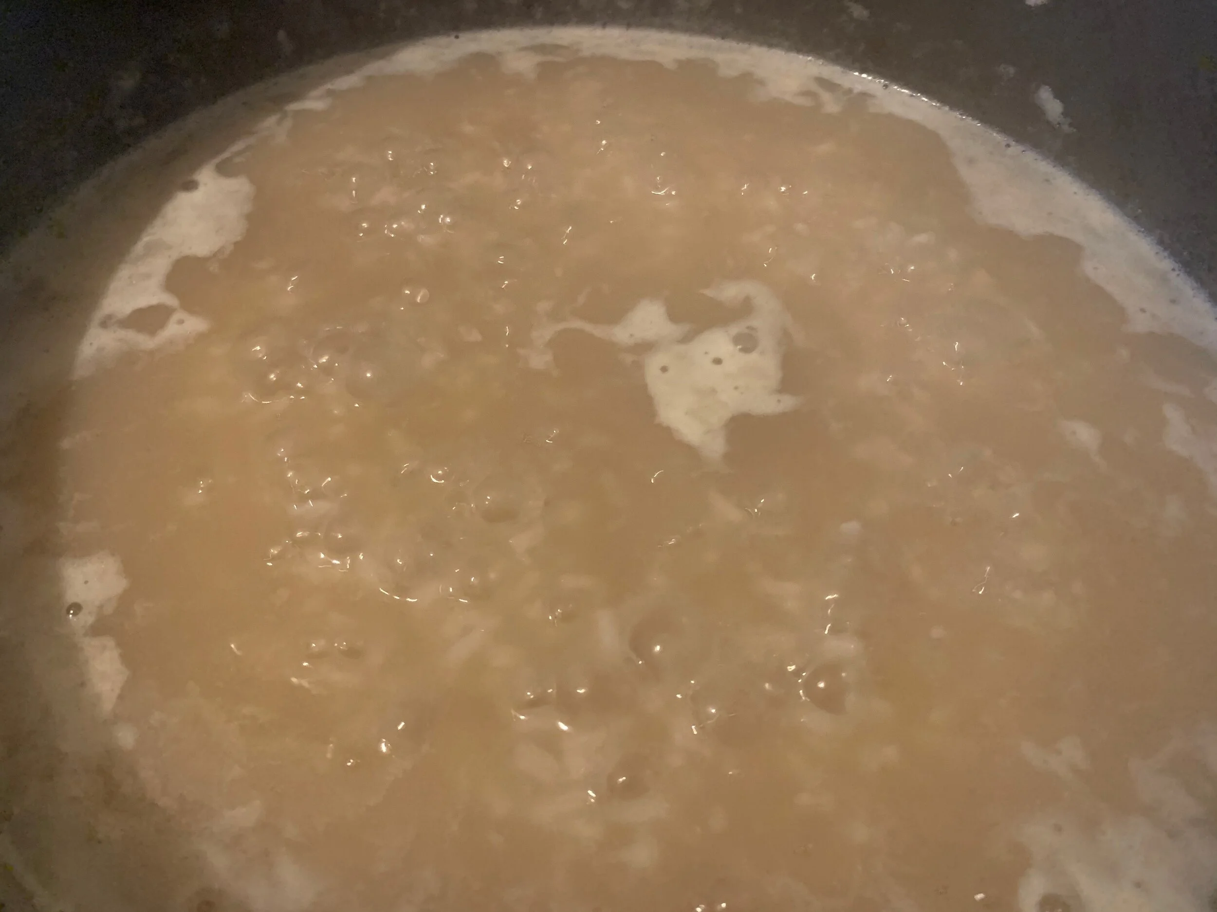 1. In a large pot, combine the stock with 6 cups of water and bring to a boil. Add the rice to the boiling pot and simmer for about 45 minutes, stirring occasionally, or until the rice is soft and the starch has begun to thicken the liquid.