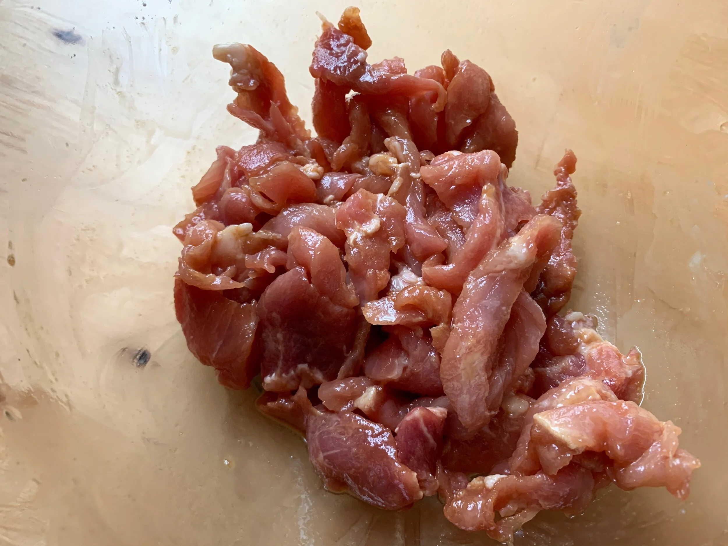 While the rice is cooking, we can prepare the other ingredients. To cut the pork loin into thin strips, first cut it against the grain into slices about ¼ inch thick. Then take the slices and cut them into strips about ¼ inch wide. Place the strips of pork in bowl and mix them with the cornstarch and soy sauce, then set them aside to marinate for 20-30 minutes.