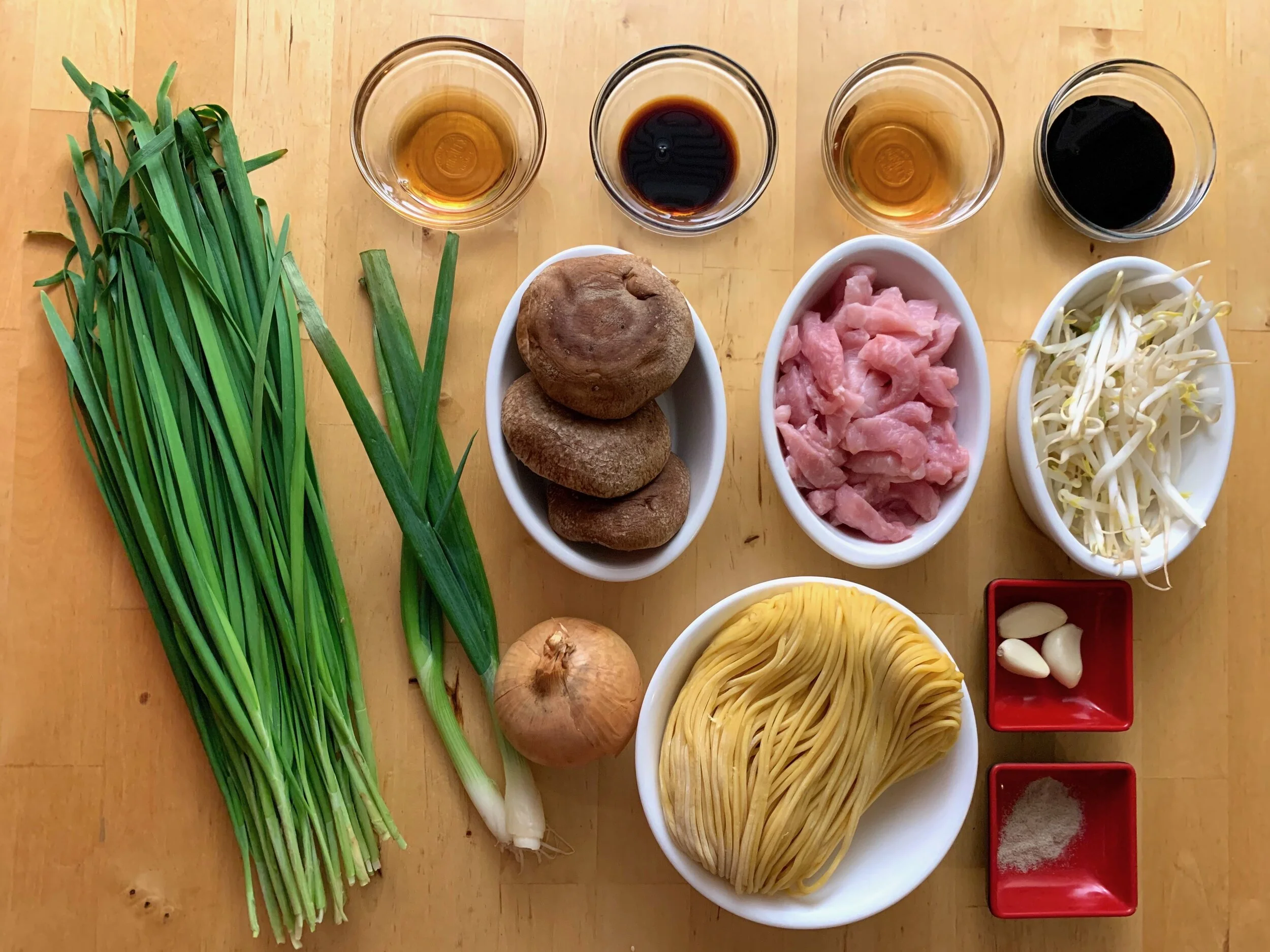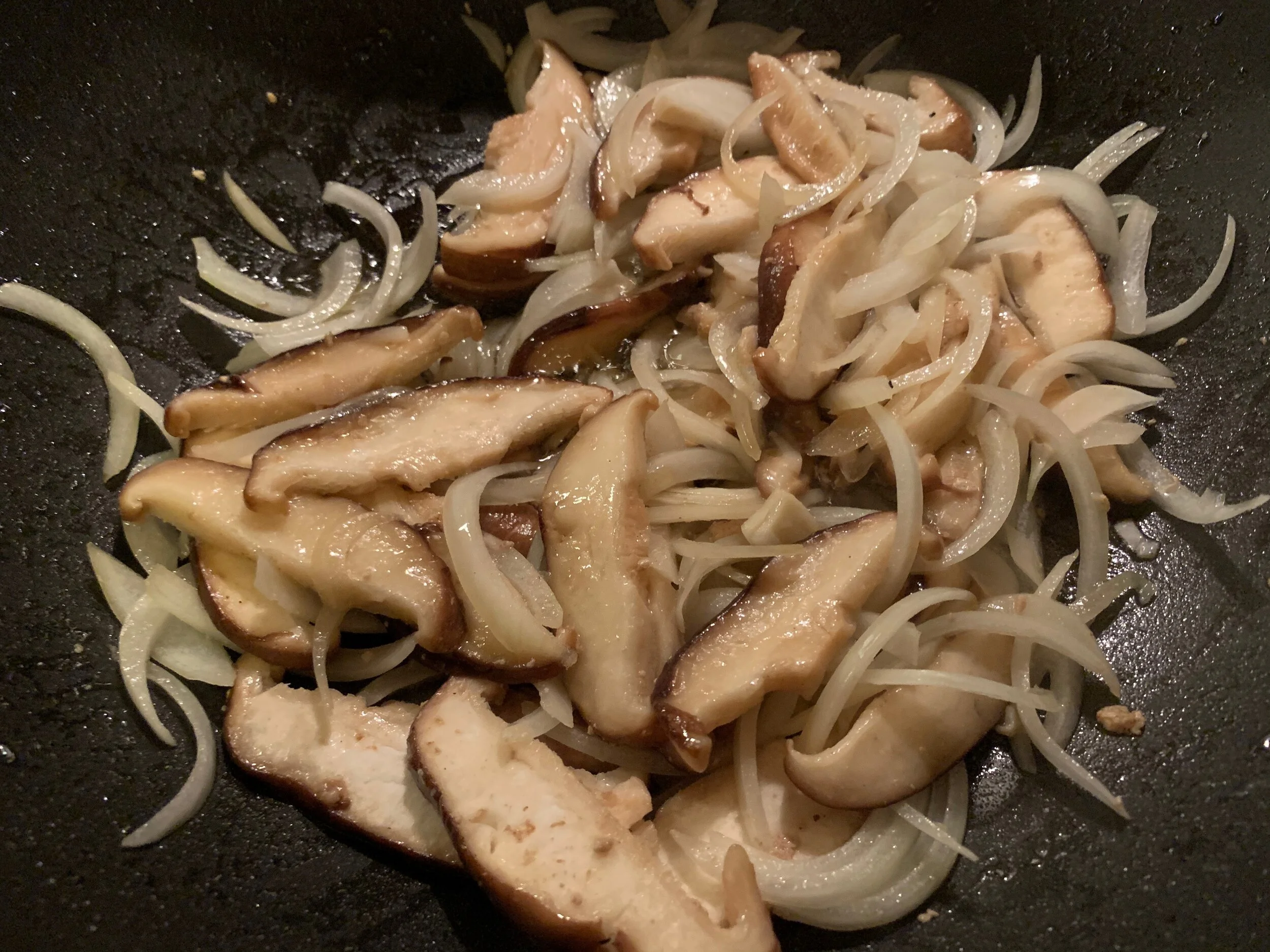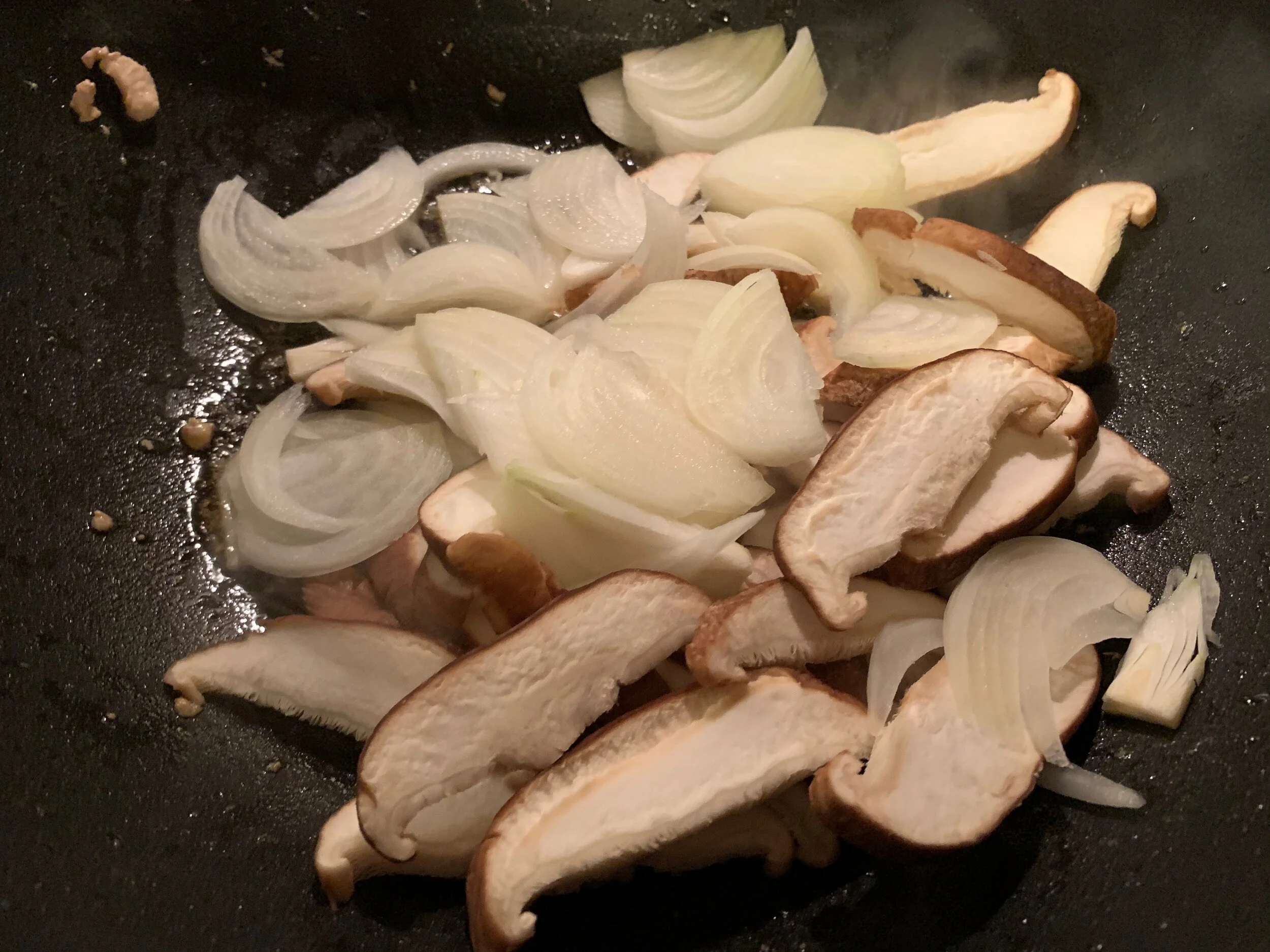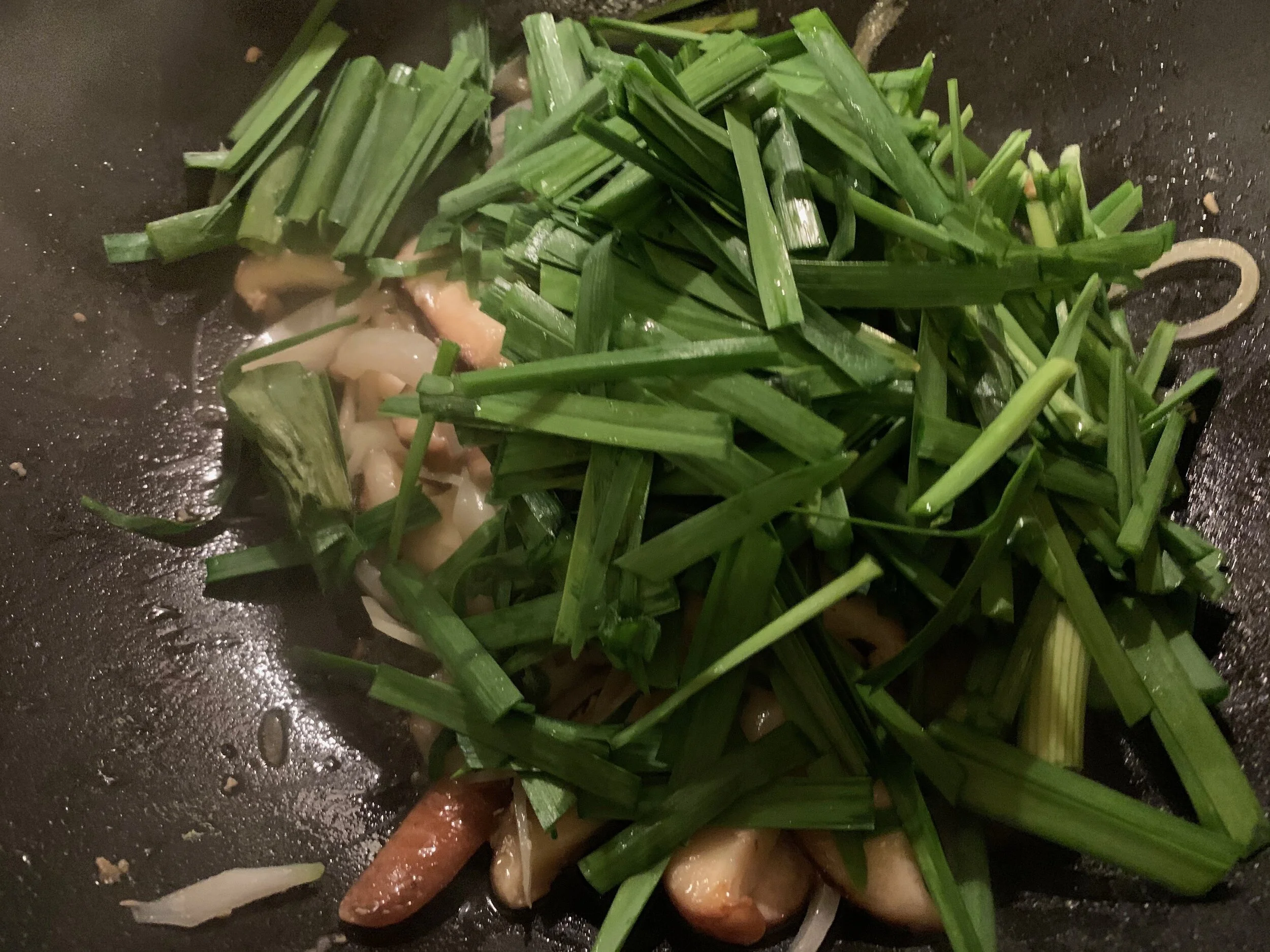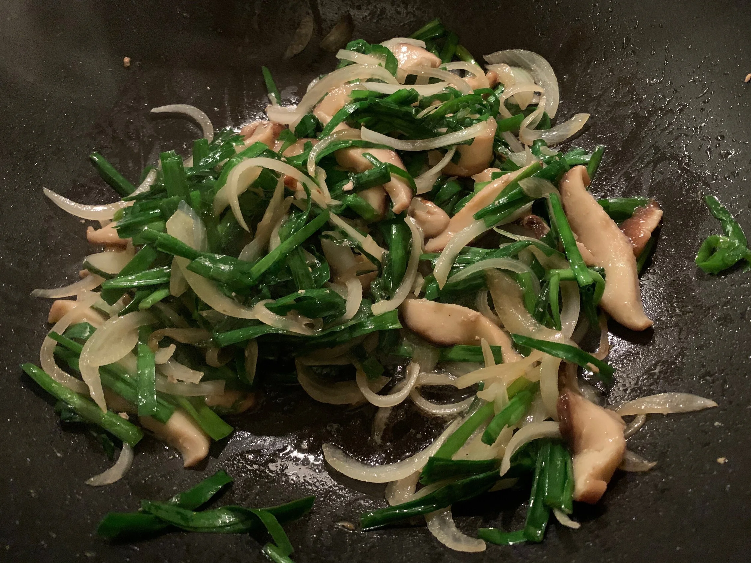 2. While the pork marinates, thinly slice the mushrooms and onion, and chop the scallions and garlic chives into 2-inch pieces.