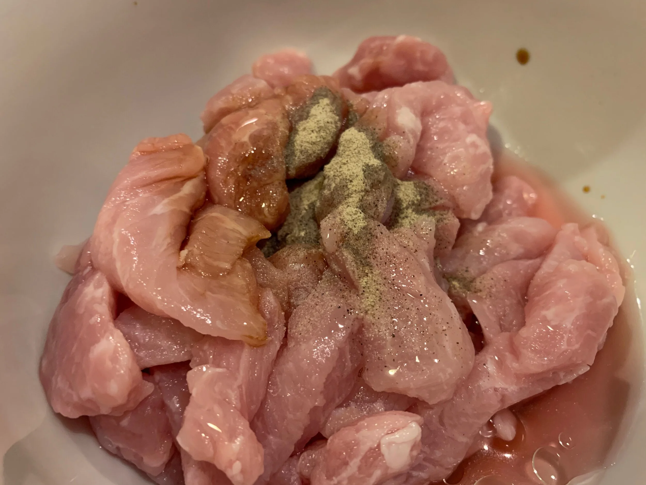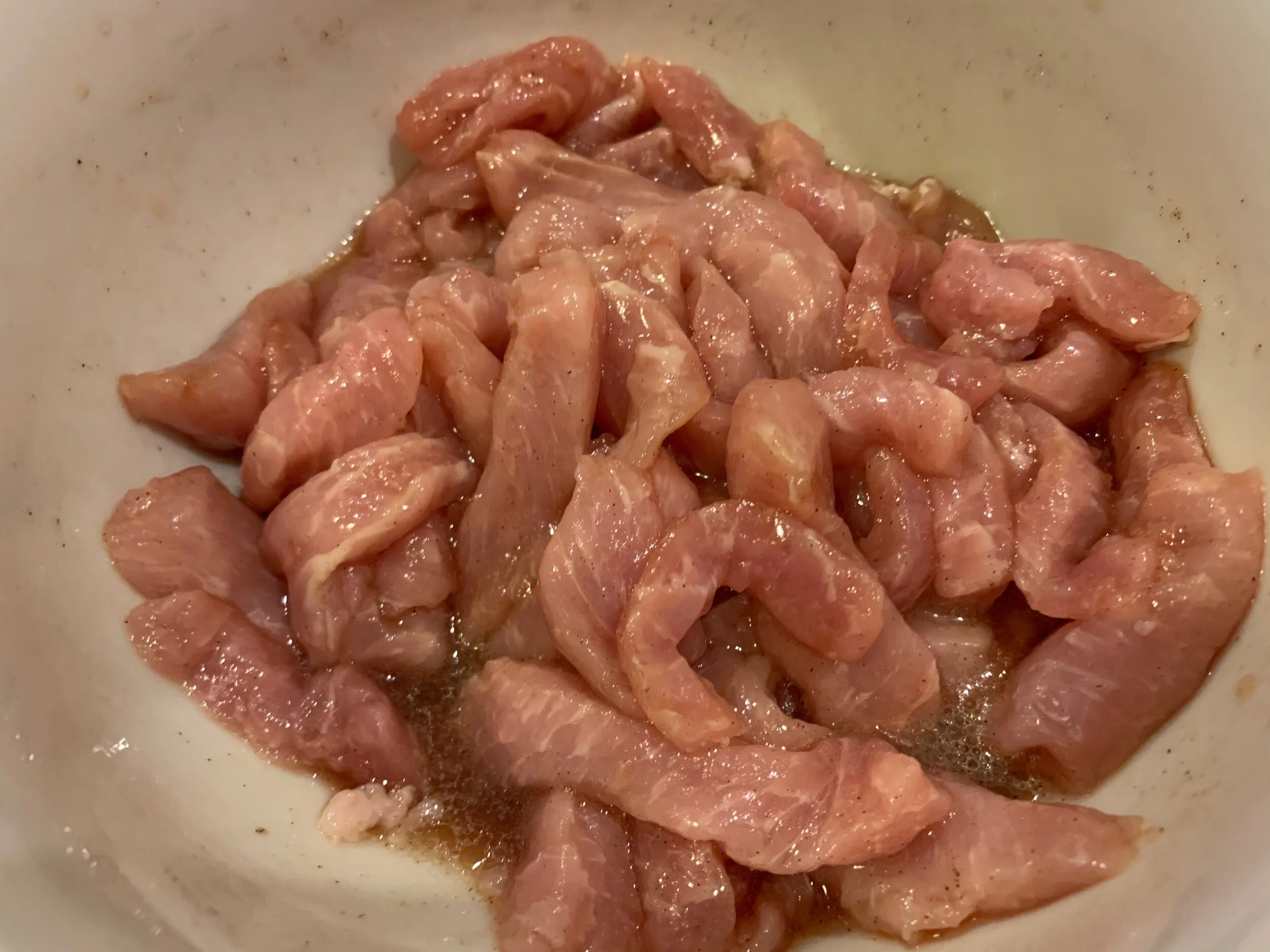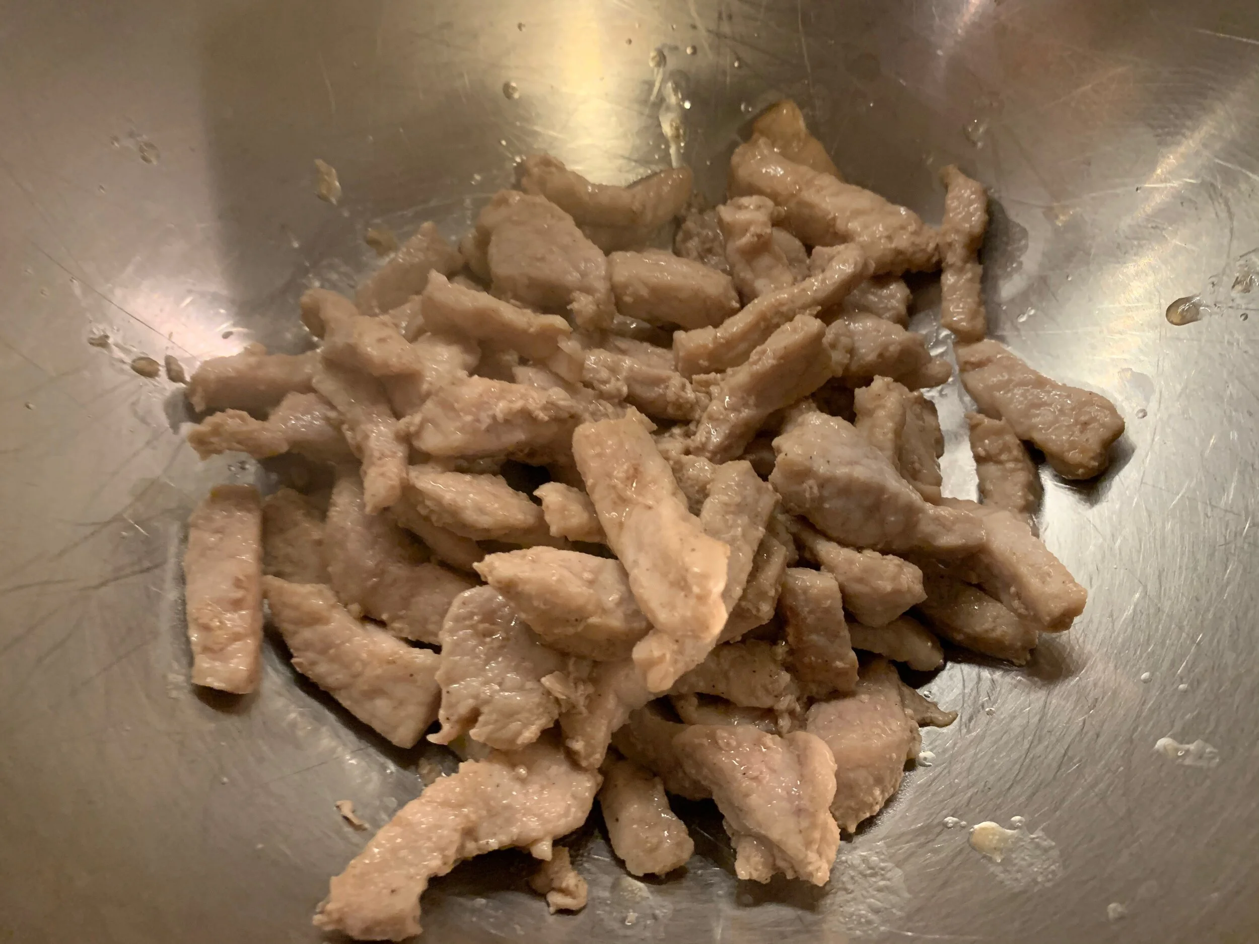 1. Cut the pork loin against the grain into thin slices, then cut the slices into ¼ inch thick strips. Mix the pork loin strips with ¼ tsp white pepper, 1 tsp soy sauce, and 1 tsp vegetable oil, and let marinade for 20-30 minutes.