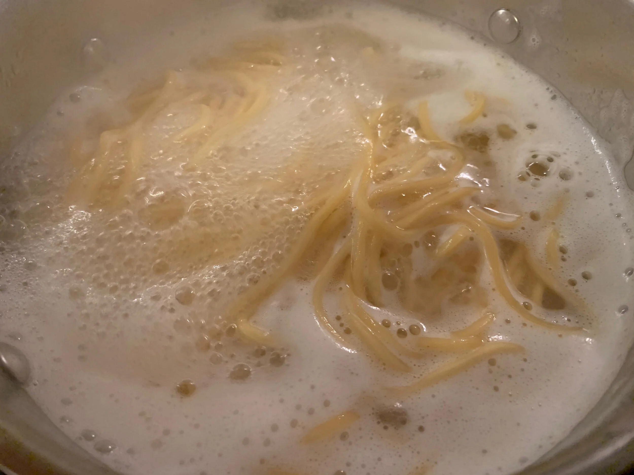 When the pork is nearly ready to cook, we will blanch the lo mein noodles. Lo mein are a Chinese egg noodle, and are available in most Asian supermarkets. It’s best to do this immediately prior to making the stir-fry, so the noodles don’t get a chance to cool and stick together. Bring a pot of water to a boil, and add the noodles to the pot. Cook the noodles for 3-5 minutes, stirring occasionally, or until almost cooked through. Cook time may vary based on the brand and exact thickness of the noodles. Drain the blanched noodles and set them aside.