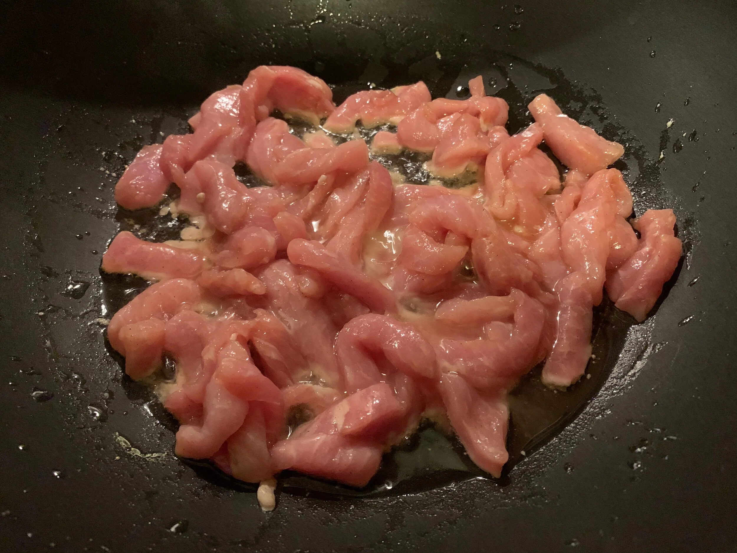 4. Heat about 1 tbsp vegetable oil in a wok or skillet over high heat. When the oil is up to temperature, fry the pork for 2 min, tossing occasionally. When the pork is cooked through, remove to a large holding bowl.