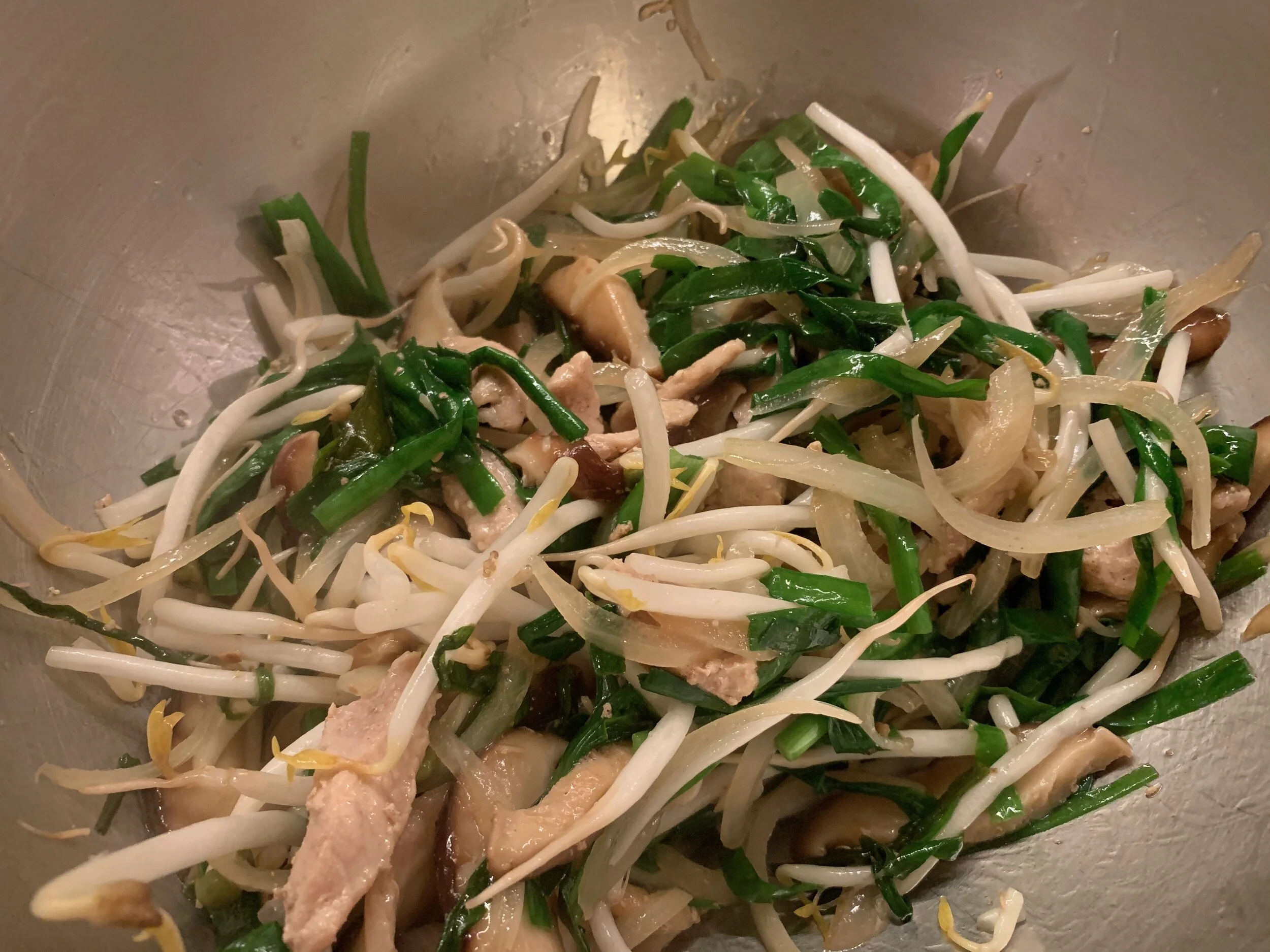 Next, add the onion and mushrooms to the wok and stir-fry the vegetables for 2 minutes, tossing constantly. Then add the remaining, faster-cooking vegetables: the chives, bean sprouts, and scallions. Stir-fry the vegetables together for 1 minute longer, then remove the cooked vegetable mixture to the same holding bowl as the cooked pork.