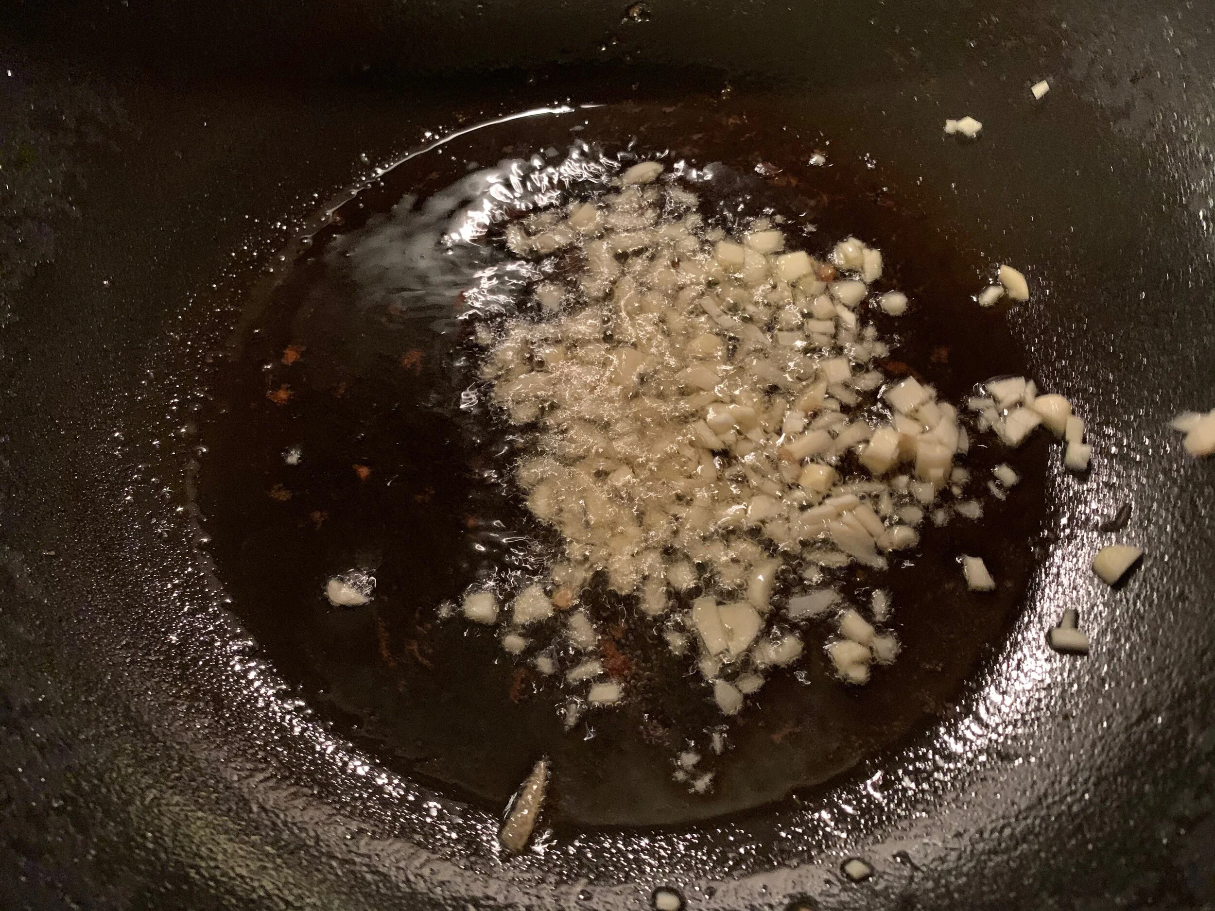 6. Wipe out the wok, then add 1 additional tbsp vegetable oil, swirling the oil about wok to prevent the noodles from sticking to the surface. Then add the minced garlic to the wok and fry for 30 seconds.