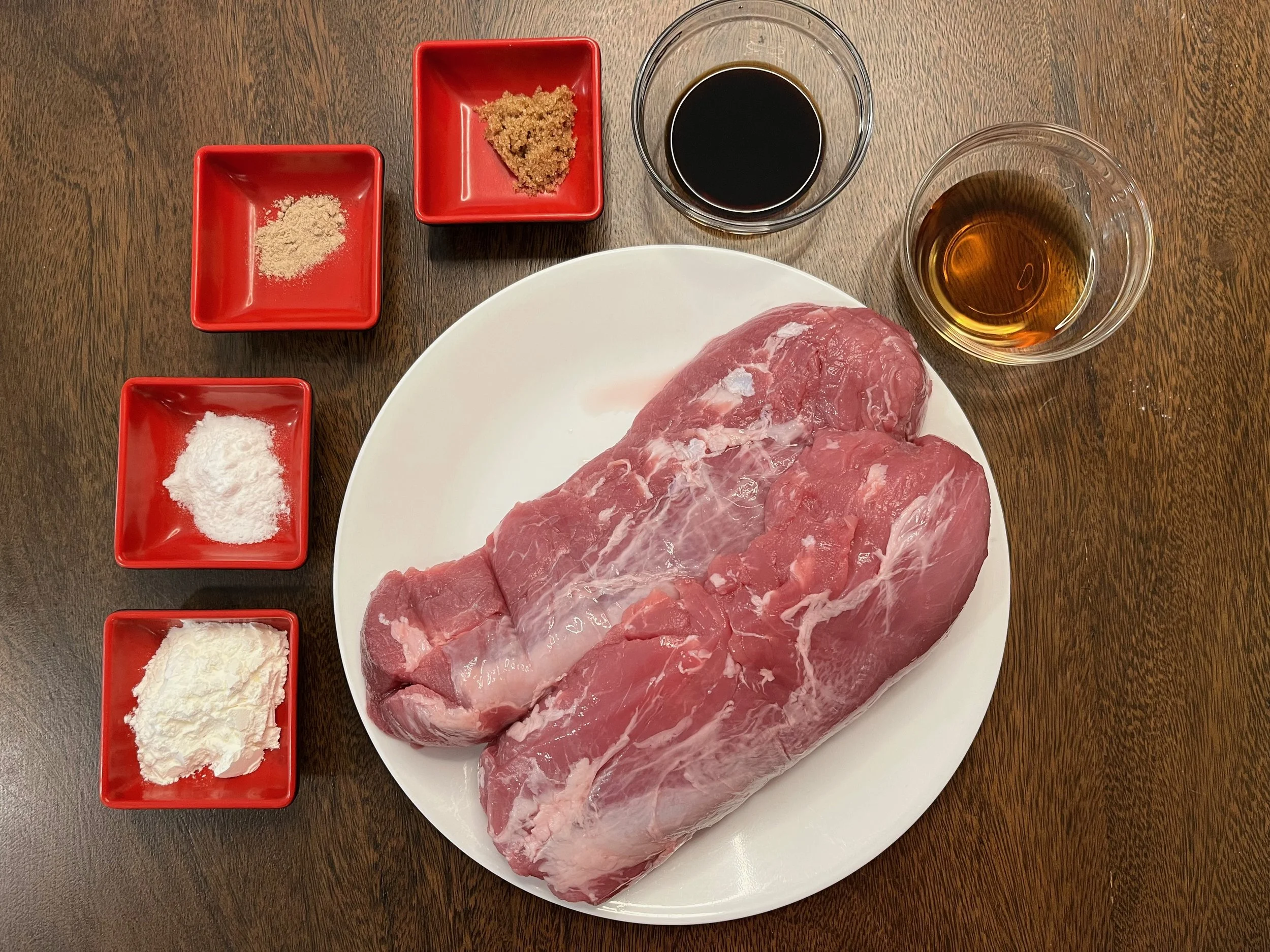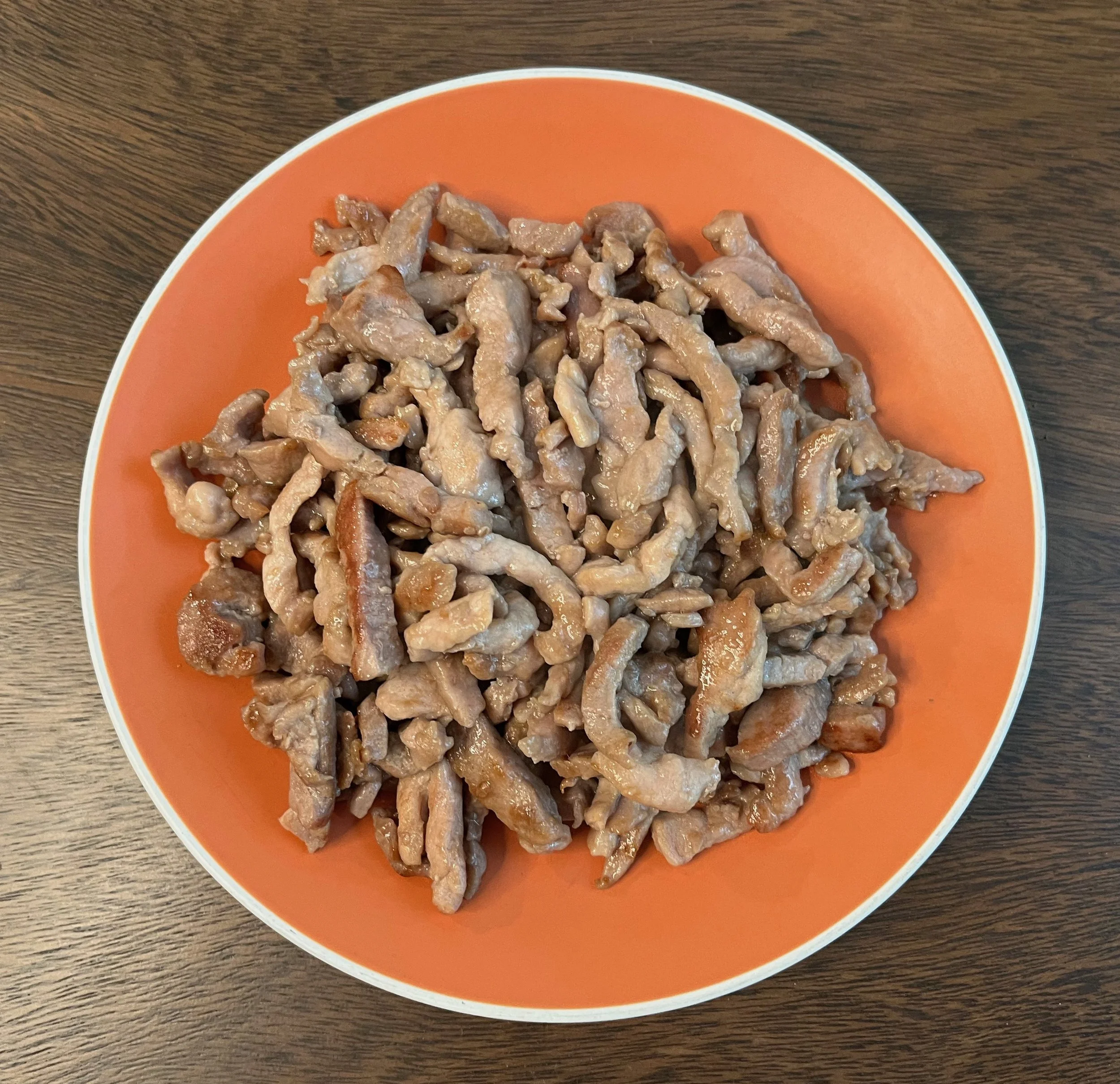 The key to this recipe is cutting thin slivers! Pork loin is a lean cut of meat, and large, irregular pieces can get overcooked and tough. Additionally, large pieces of cooked pork will not freeze as well. We are aiming to julienne the pork into slivers no more than ¼ inch wide. Start by trimming the pork loin or tenderloin, removing any excess fat, connective tissue, or silverskin. Then cut against the grain to make slices of pork ¼ inch thick. If you’re having trouble getting thin slices, you can place the pork in the freezer for 30 minutes or so, which will make the meat firmer. Turn the pork slices and cut the pork again, making slivers with a cross-section of about ¼ inch by ¼ inch. If you have any slivers longer than about 2 inches, cut them in half. Then place all the julienned pork in a large bowl.