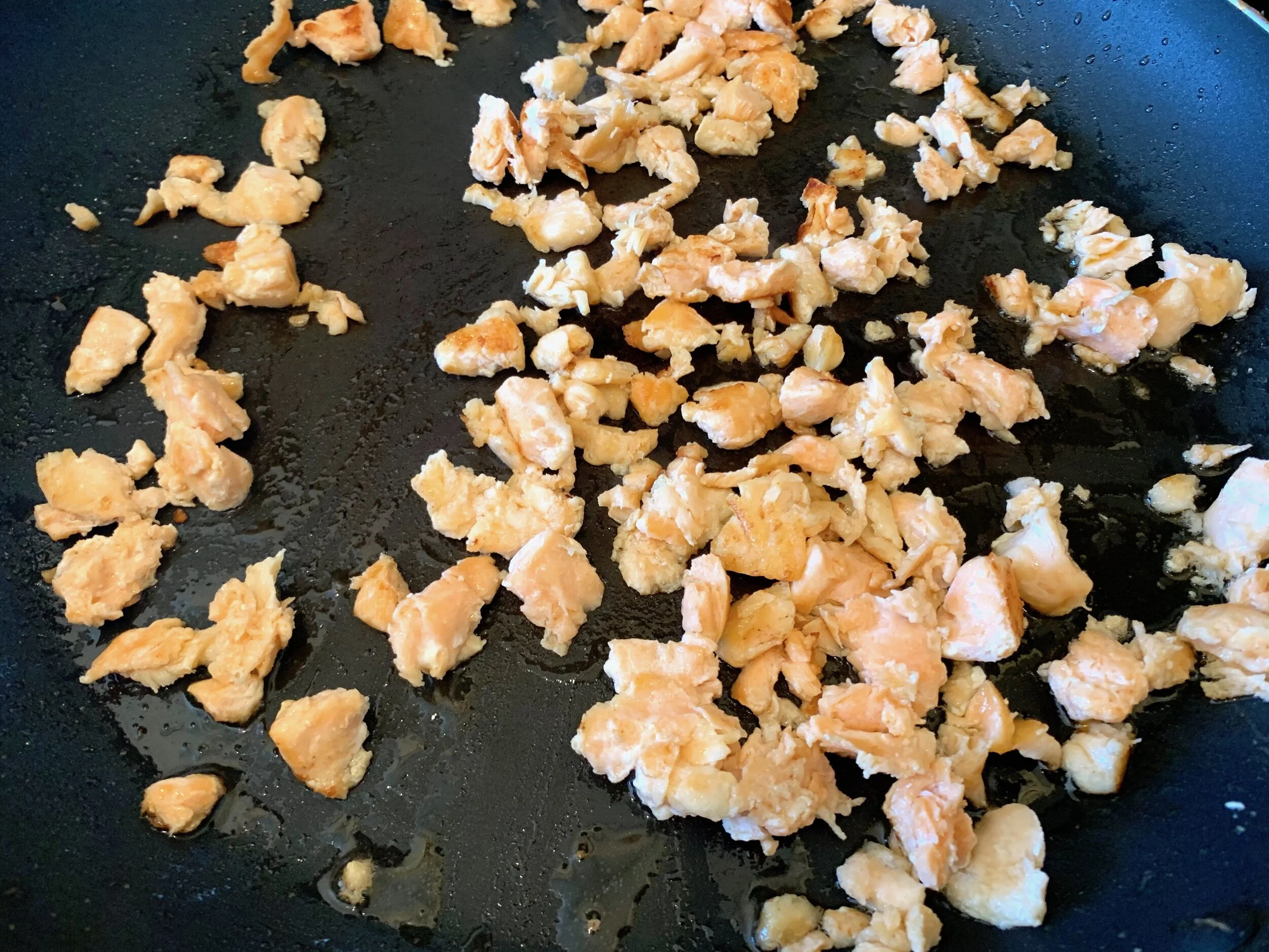 1. If using fresh salmon, chop the salmon into small pieces, and heat 1 tbsp vegetable oil in the pan over high heat. When the oil is up to temperature, add the salmon to the pan and fry for 5 minutes, breaking the fish into small pieces. If using leftover salmon, simply add to the pan and heat through, breaking into small pieces.