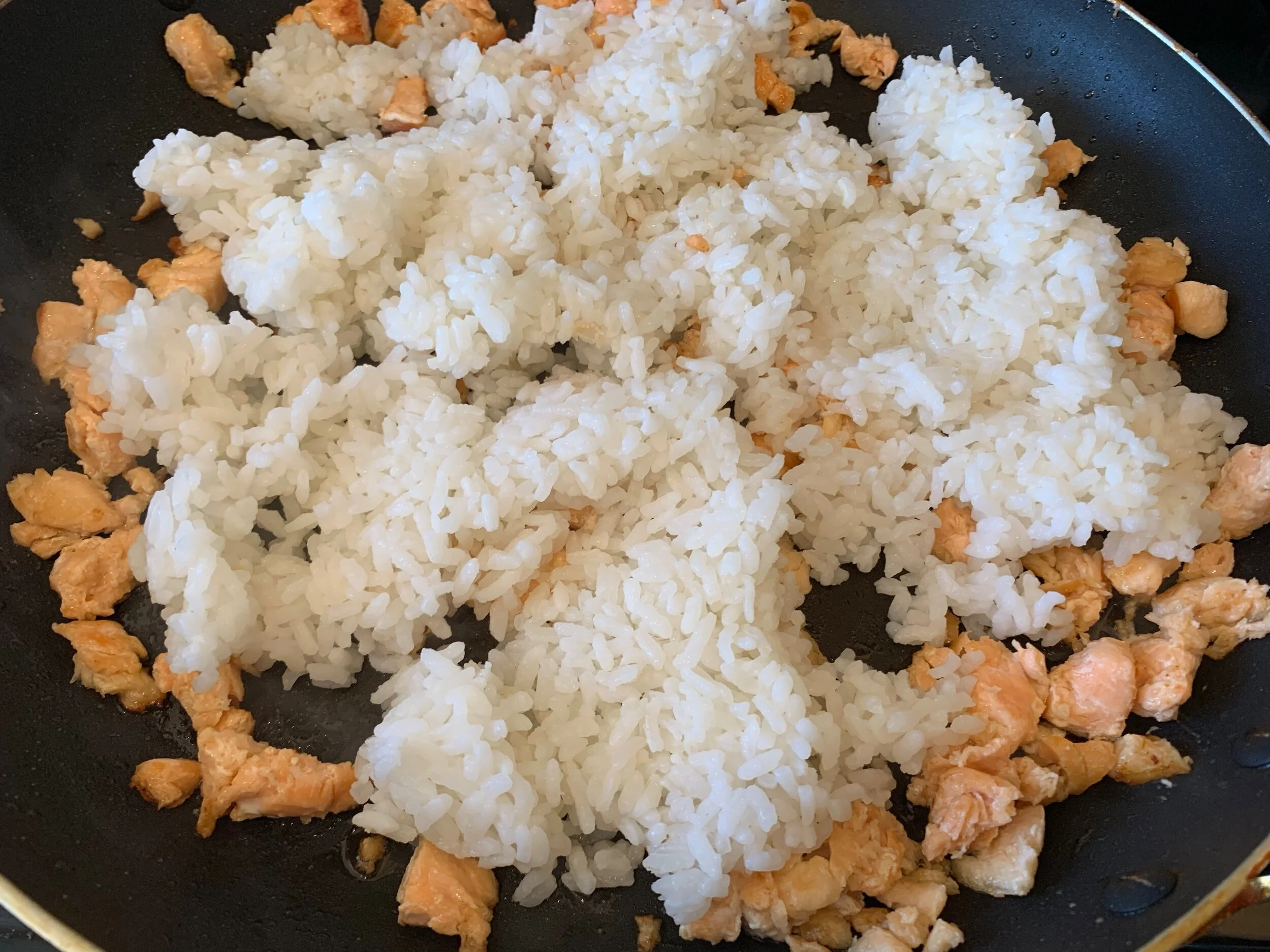 This recipe can work for other leftover oily fish, such as mackerel. If you prefer a more savory fried rice, mix some soy sauce into the rice as it cooks.