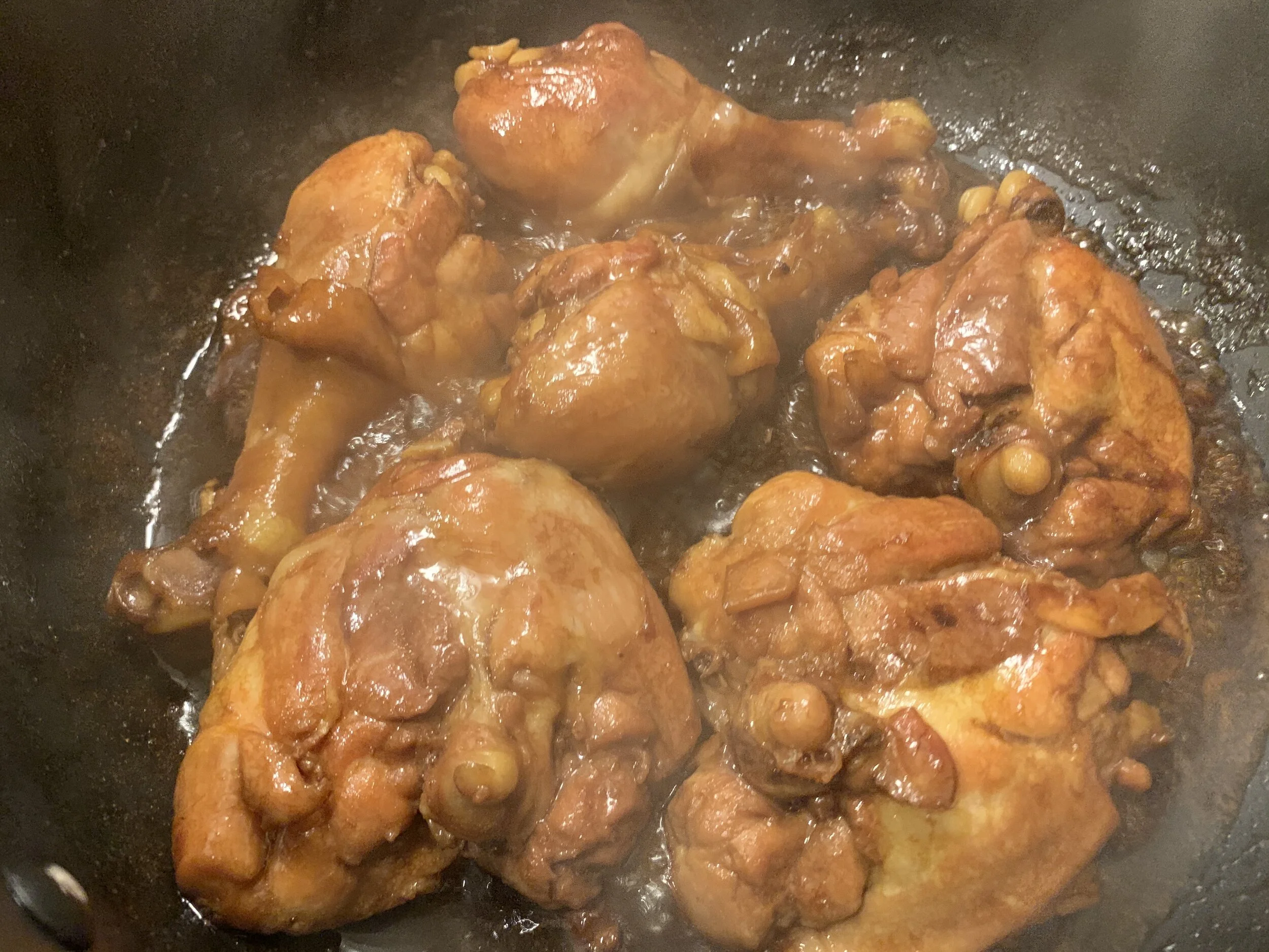5. Remove the lid, turn the heat up to medium, and reduce the sauce by half, or until the sauce should become thick and glossy. Toss the chicken pieces occasionally in the sauce.