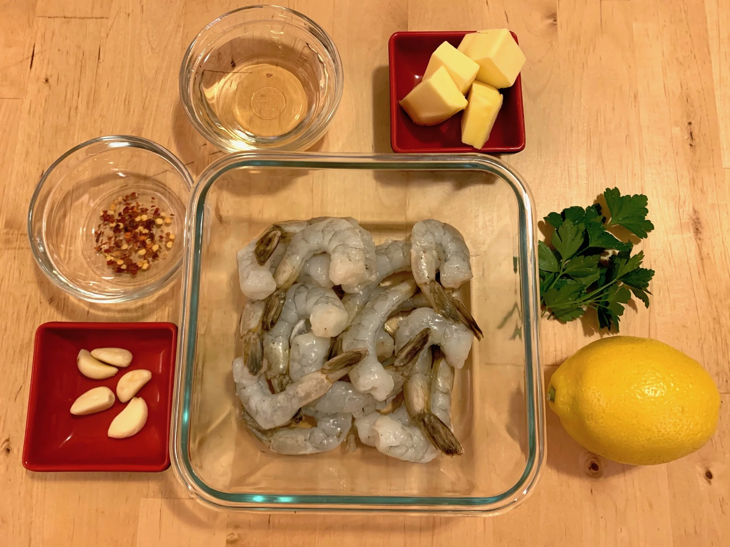 Begin by mincing two of the cloves of garlic. In a bowl, toss the minced garlic with the shrimp, ½ teaspoon salt, and about 2 teaspoons olive oil. Set the shrimp aside to marinate for 30 minutes. While the shrimp is marinating, we will do a bit of mise en place. Thinly slice the remaining 3 cloves of garlic, and set the sliced garlic aside. We also need about 1 tablespoon of lemon juice for the sauce. Get this from 1 half of your lemon, and cut the remaining half a lemon into wedges for serving. Cut the butter into cubes, and keep chilled until needed. Chop the parsley and set aside.