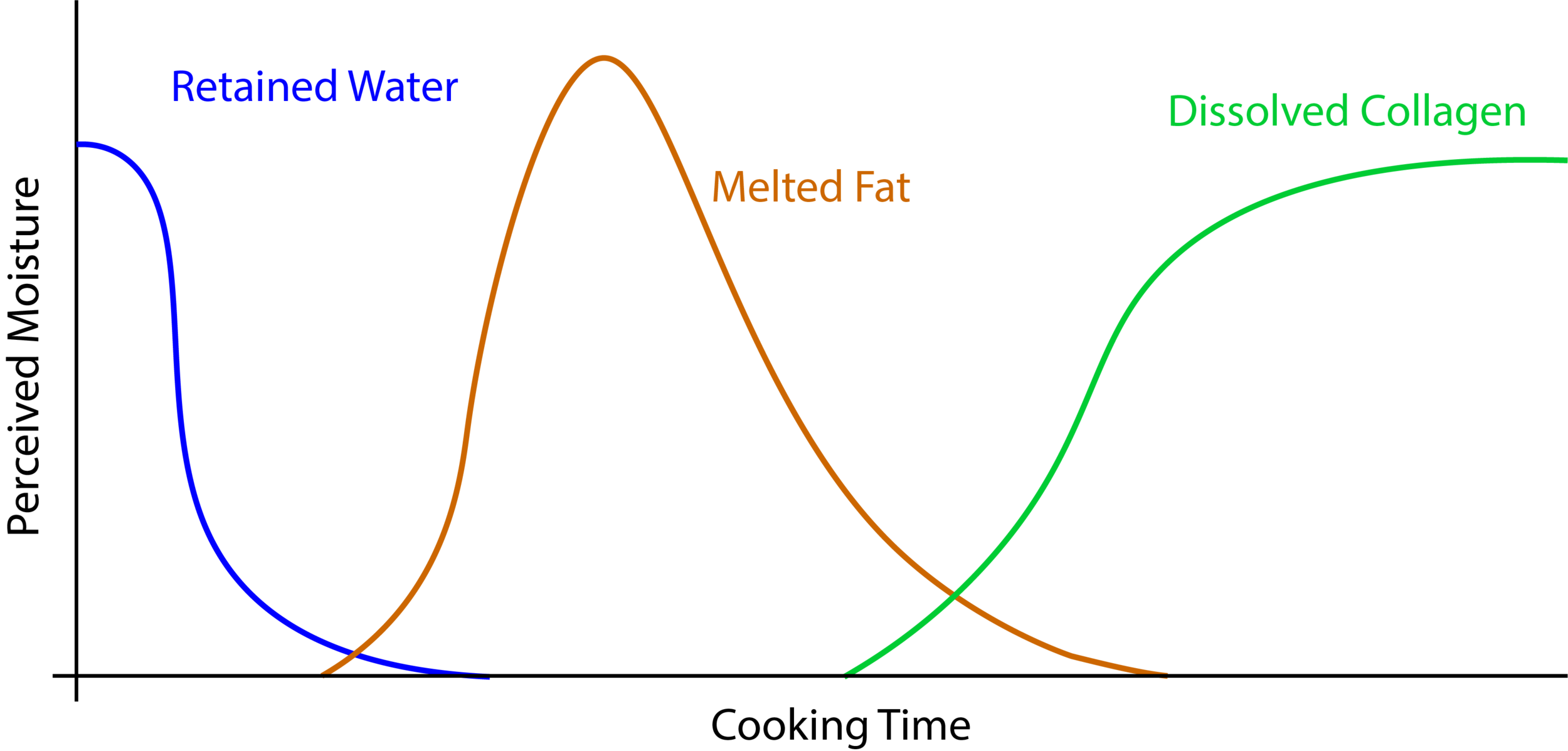 Moisture is trickier. In meat, moisture can come from one of three sources: 1) water content of the muscle initially, 2) melting fat around or marbled within the muscle, 3) dissolved collagen from connective tissue. In most cases, these three sources are temporally segregated. As you apply heat to a cut of meat, the water content is liberated rapidly through evaporation, leaving the meat dry if overcooked. As you continue to cook it, fat will begin to melt, but cook it for even longer and the fat will render and leave the meat. Continue to cook it and any connective tissue will break down, dissolving the collagen and forming gelatin. Because of these different sources of moisture, most cuts have an ideal cooking method. For example, brisket has a large amount of connective tissue which is tough to eat unless completely dissolved, making it a common cut for low, slow methods such as braises and barbecues. Cuts with a large amount of fat and little connective tissue, such as ribeye or chicken thighs, do well when cooked to the point fat begins to melt. The least forgiving type of moisture to hold onto is water, as it is easily driven away. For lean cuts with no connective tissue, such as chicken breast, this is the only type of moisture we have available.