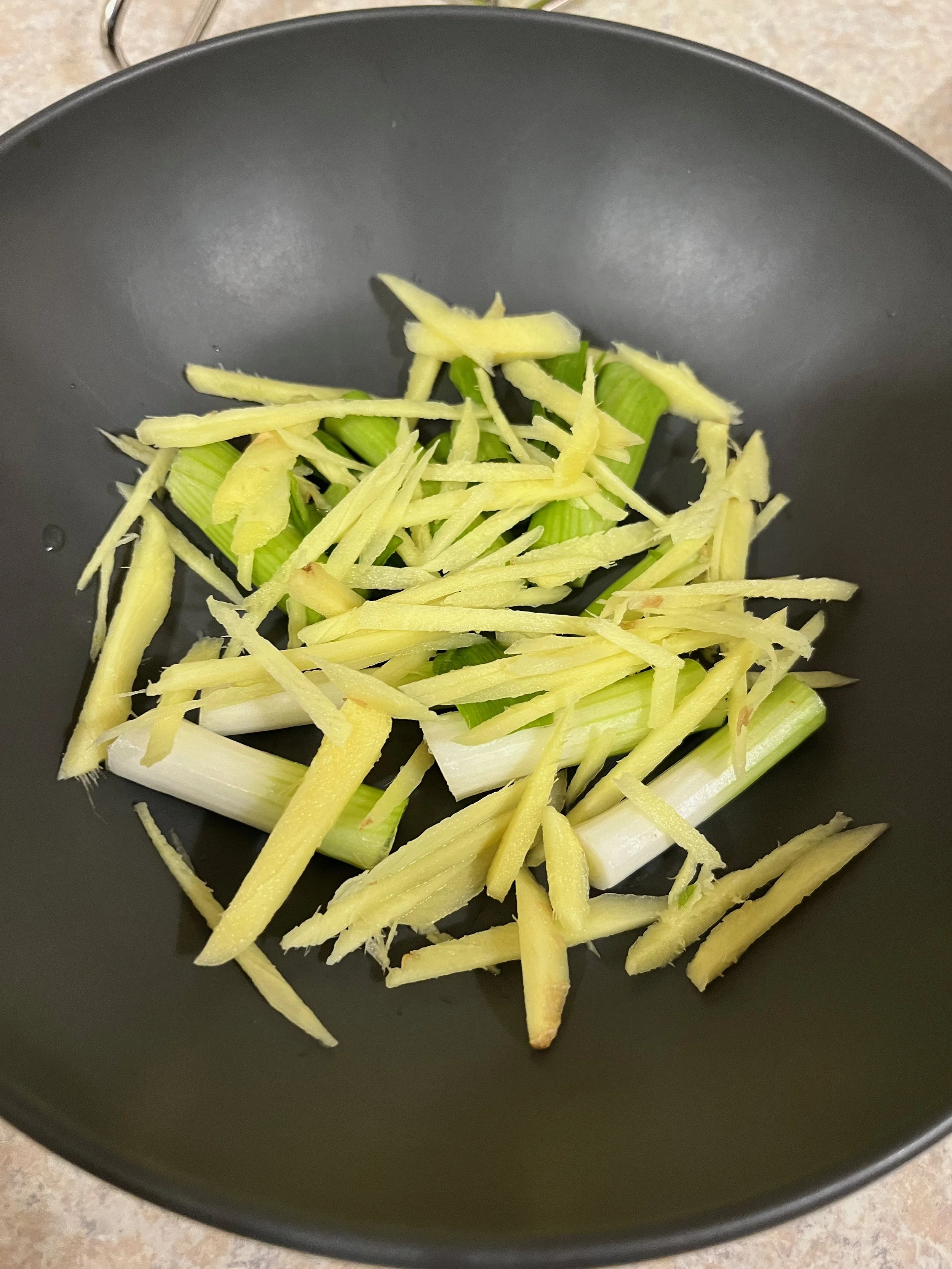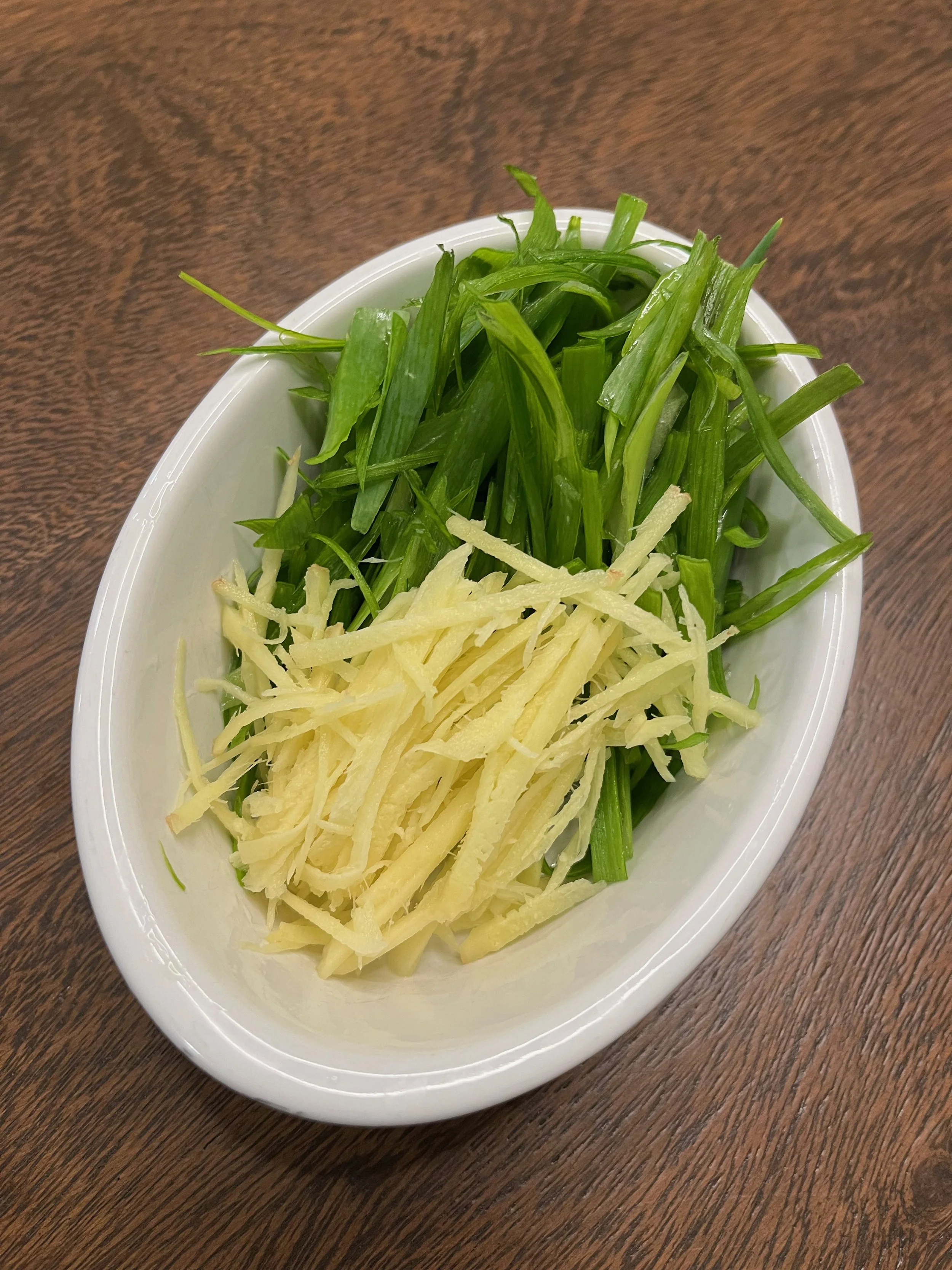 2. Peel and julienne the ginger. Remove the scallion tops and reserve them. Trim the roots from the scallions, so we are left with the whole scallion whites.